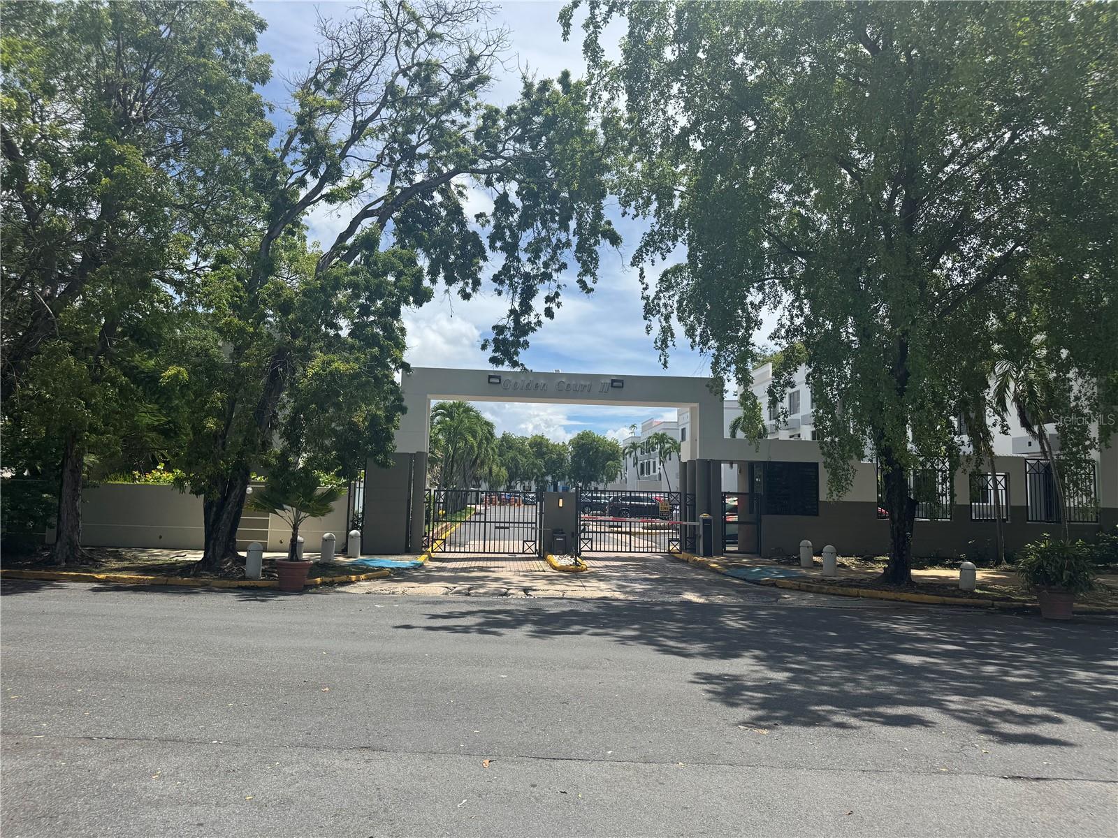 Golden Court II ground-floor garden apartment in a gated community near the Choliseo and the banking district, featuring three bedrooms, two bathrooms, a covered porch, and a private patio, with one assigned parking space directly in front of the apartment. The property includes split-unit and wall air conditioners, cooktop, microwave, refrigerator, washer, dryer, window screens, and shades. A new stainless steel kitchen sink and countertop are currently being installed. Additionally, the building is currently being repainted.
