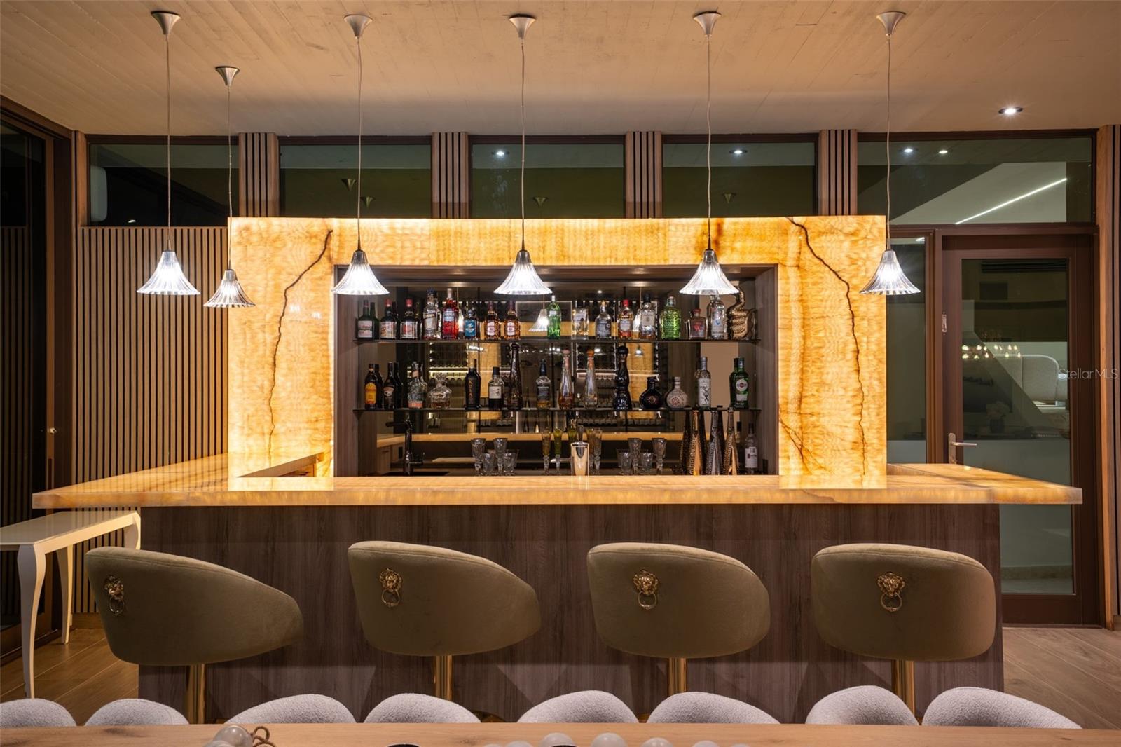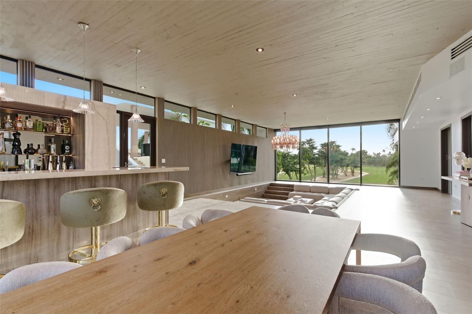 The home’s second-level expansion is a destination of its own, designed for world-class entertainment and elevated living. This level features a rooftop outdoor kitchen equipped with a Grillworks grill, beverage fridge, and ice maker; a stunning glass jacuzzi with panoramic ocean and fairway vistas; and an expansive sunken lounge ideal for gatherings or nightlife experiences. Additional amenities include a backlit marble bar accented with Baccarat lighting, an upstairs bar, a temperature-controlled wine cellar, cigar humidor, dedicated office, and a half bathroom. A fully equipped media room with sound-paneled walls and a kitchenette with Wolf induction cooktop provides the perfect environment for cinema, gaming, education, or studio use. Also located on this level is a complete in-law/guest suite offering a kitchenette, custom Italian closets, soaring ceilings, and a spa-quality marble bathroom with a freestanding porcelain tub.