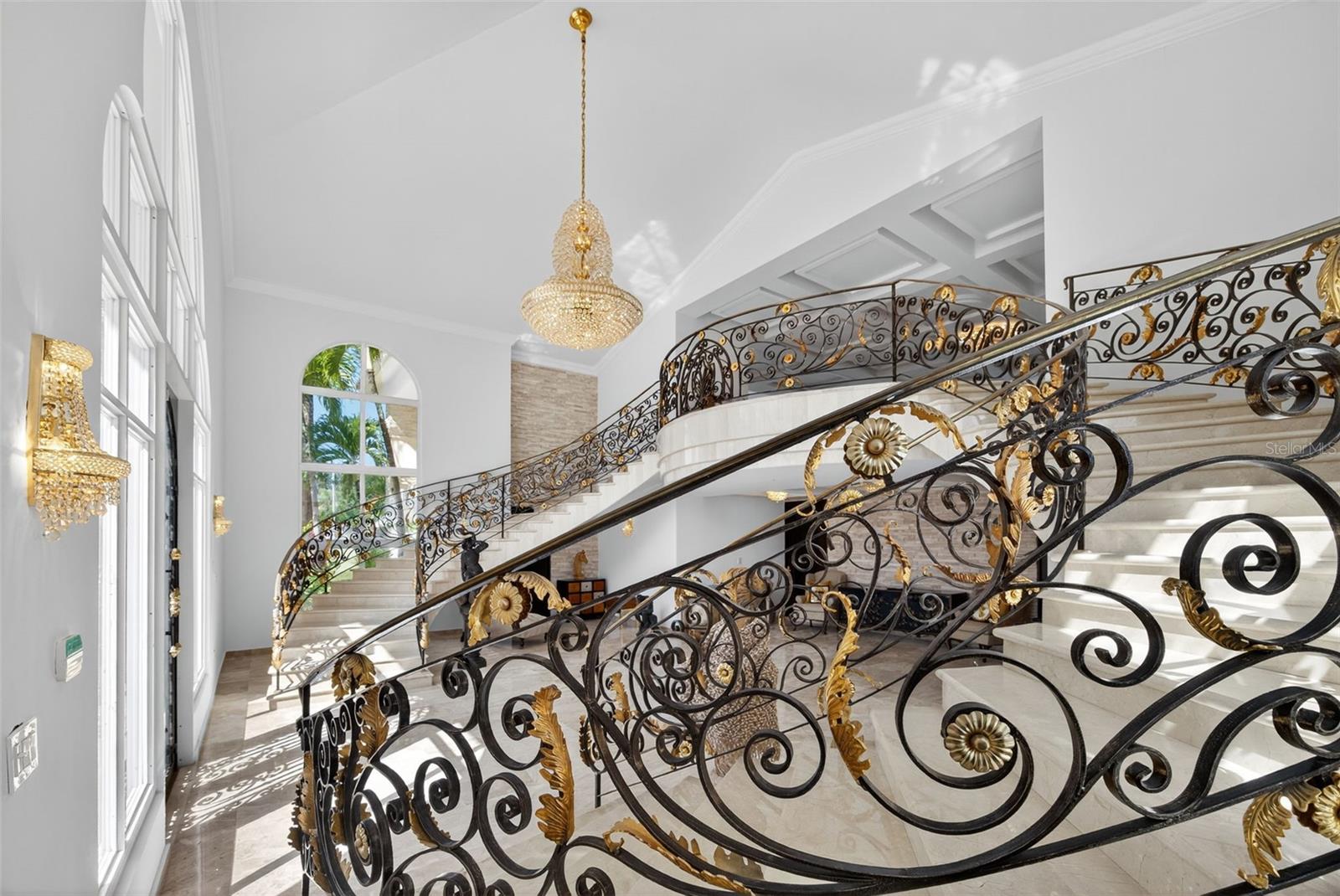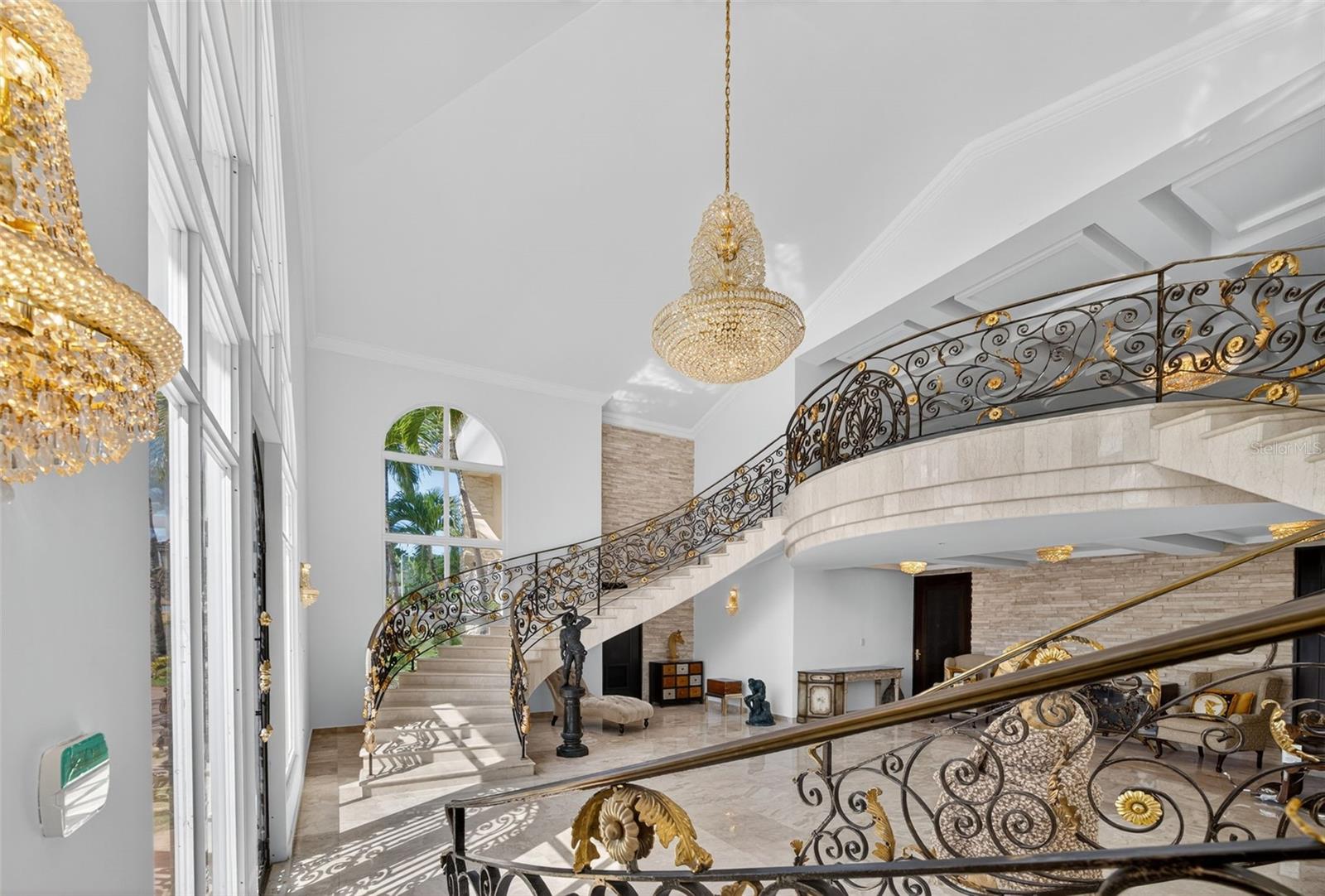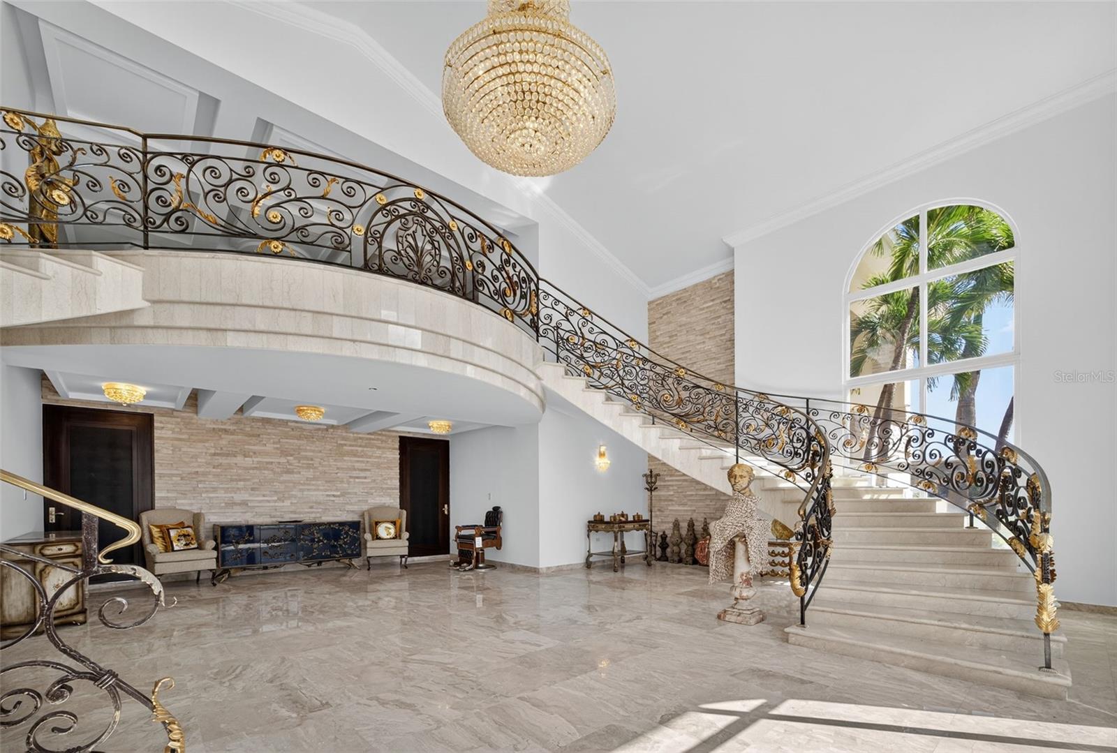 A double-height foyer, dual circular staircases, and stunning crystal chandeliers set the tone for elegance. Spacious living and dining areas connect seamlessly with a chef’s kitchen—perfect for both family living and grand entertaining.