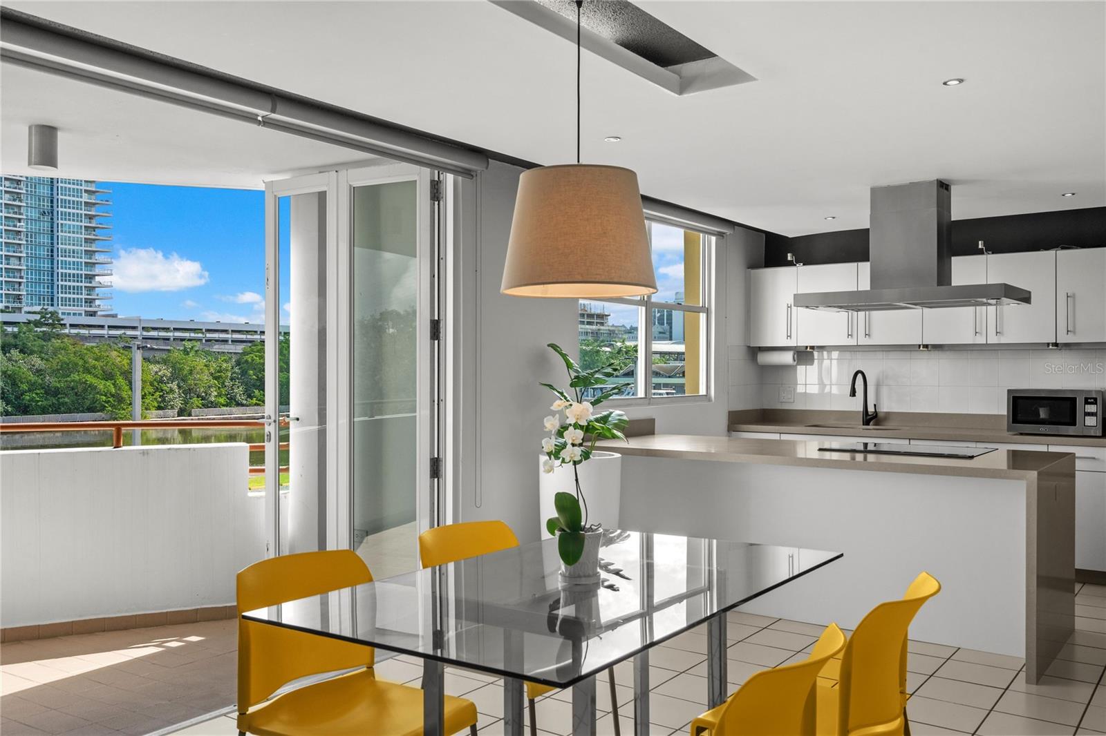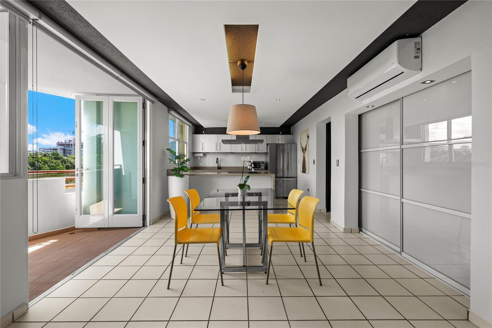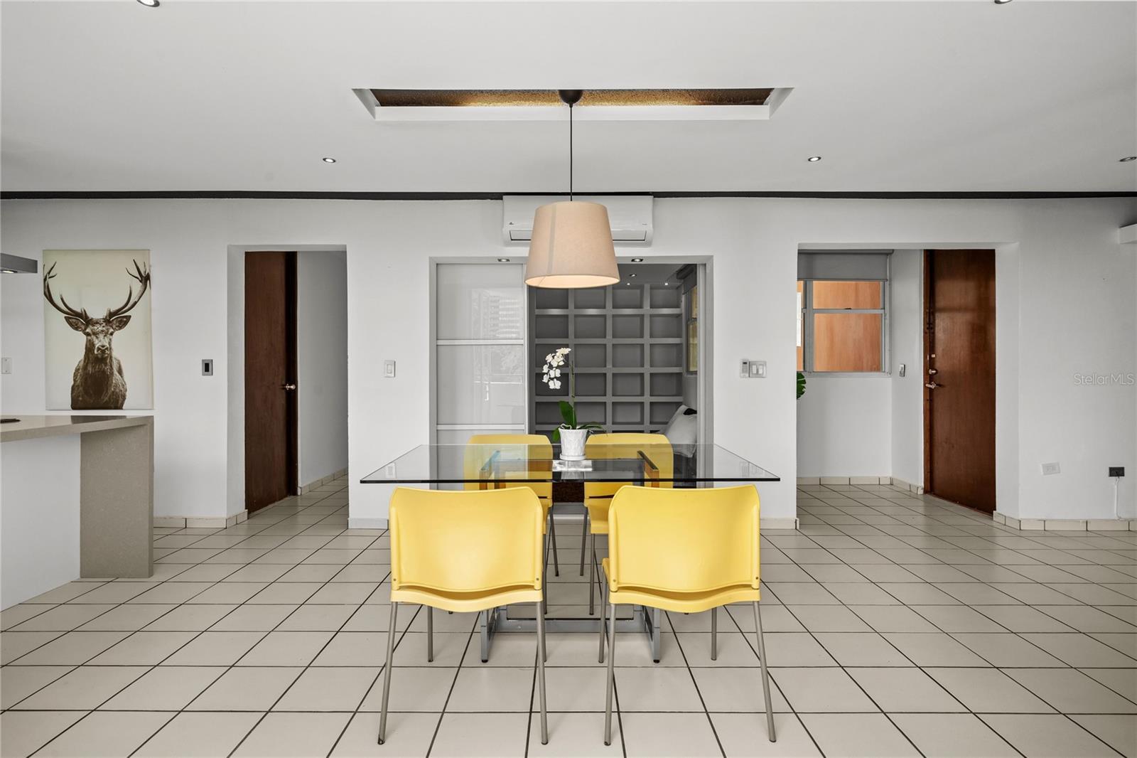 The apartment is a third-floor, with a single-level layout, but access is easy: the front door is just eight steps above the parking level. Inside, the living, dining, and kitchen areas open to a large balcony-terrace that captures morning light and the consistent east-side breeze. The upgraded kitchen features porcelain slab countertops and an island well-suited for cooking or casual hosting. The primary bedroom includes modern wood paneling and an ensuite bathroom, while the secondary bedroom and a flexible third room—currently used as a family room with pocket doors—provide adaptable space for guests or a home office.