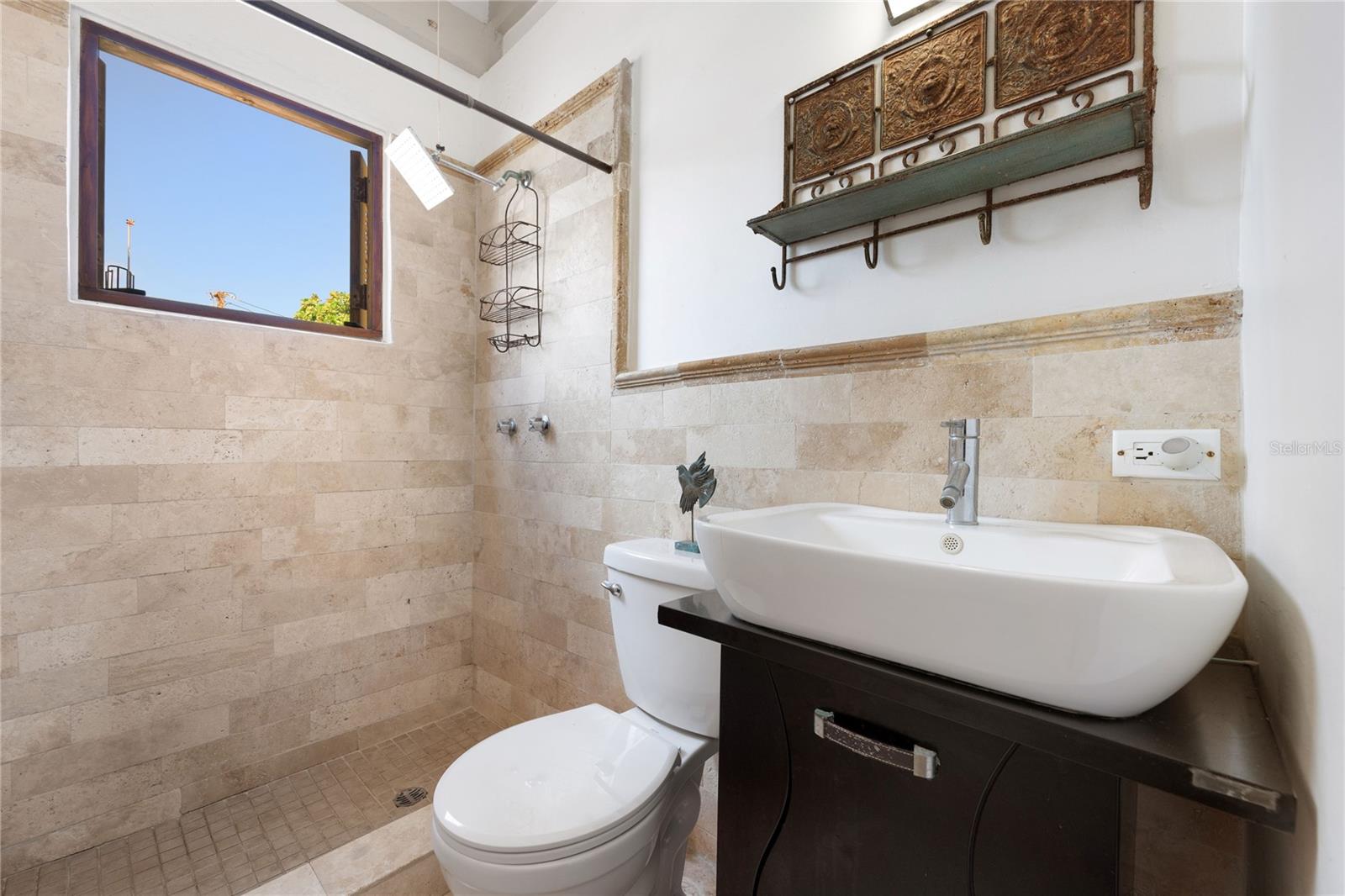 Inside, the living space unfolds with a quiet sense of refinement, grounded by cool marble floors and animated by natural light pouring in throughout the day. The high ceilings draw you effortlessly toward the home’s crown jewel: a sprawling terracotta roof deck. Here, city views and ocean breezes mingle freely. An outdoor shower invites refreshing pauses, while ample space allows for lounging, entertaining, or simply watching the moon rise over the storied rooftops of the old city. It is a setting designed for slow mornings, calm evenings, and the romance of Caribbean living.