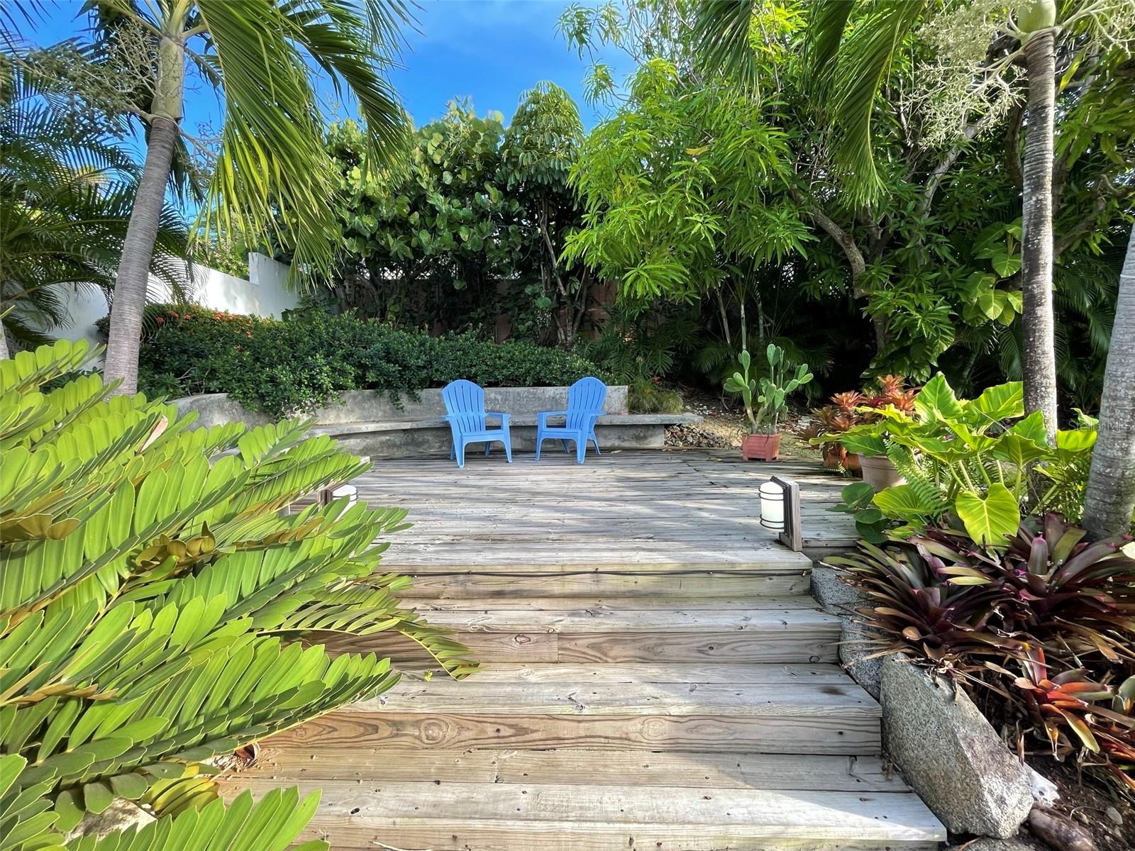 The main floor opens into an airy living, dining, and kitchen area with natural stone tile floors and vibrant local artwork. The space extends seamlessly to a lush, landscaped backyard and a spacious 1,600-square-foot ocean-facing wood deck—ideal for dining, entertaining, and sunset watching. Two bedrooms, each with an en-suite bathroom, offer comfort and privacy. The primary suite also enjoys direct access to the deck, allowing the outdoors to become part of the everyday experience. A laundry room is conveniently located off the hallway.