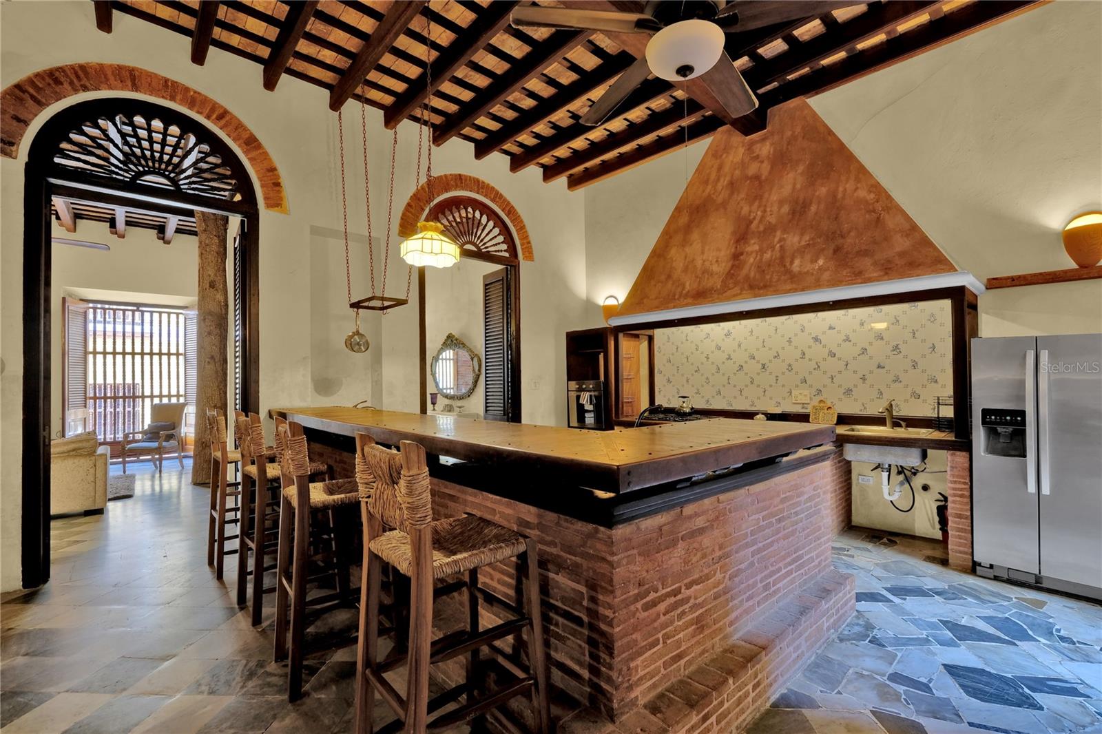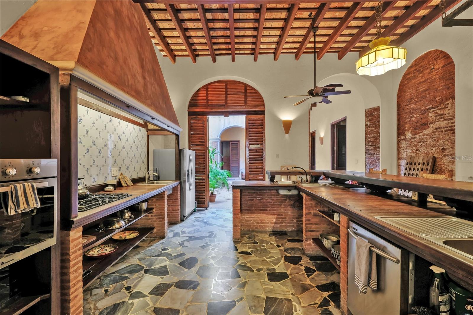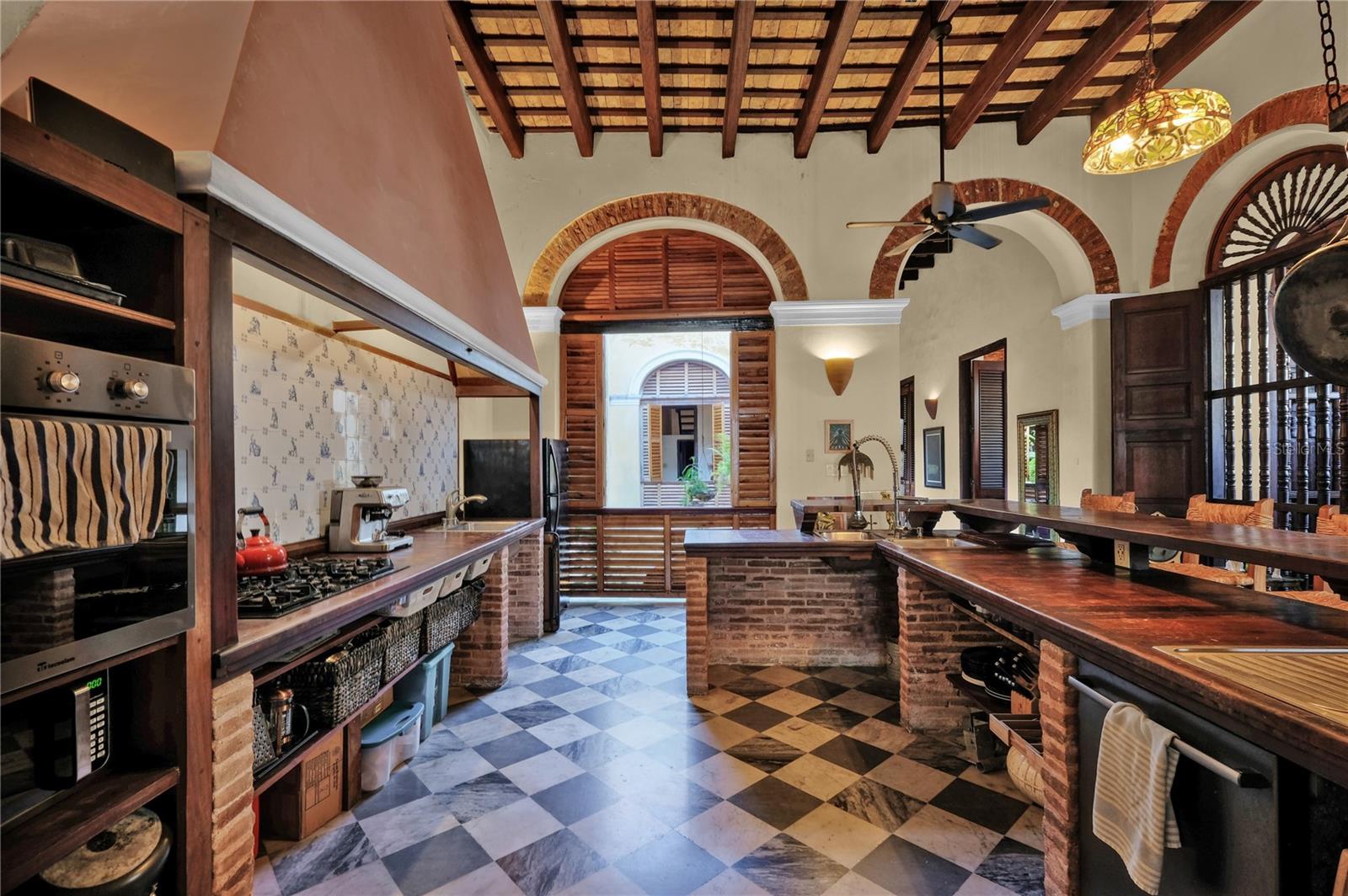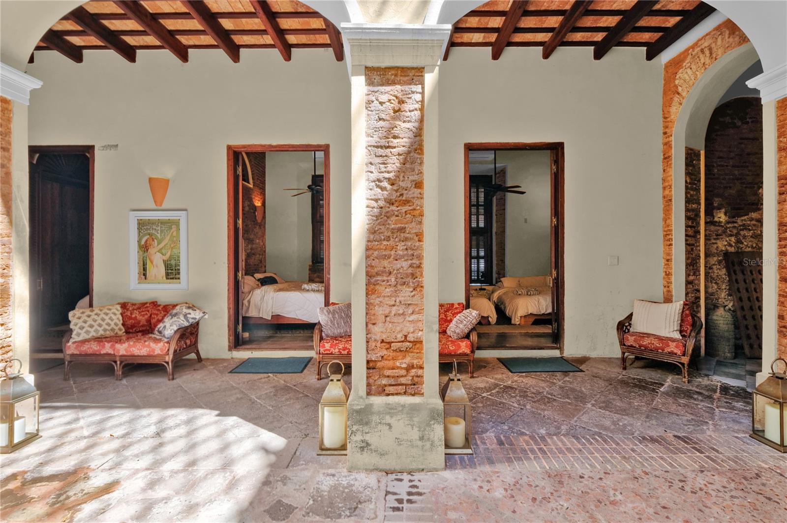 Impeccably Restored Historic Home with Enormous Rooftop Deck and Two Kitchens! Located on the corner of Sol St and C. de San Justo, this 6BR/2BA residence captures the imagination with whimsical terraces, beautiful window spindles, and a vibrant exterior. Owned in the 1800s by the then-wealthiest sugar baron, José Ramon Fernández, the property has continued to enjoy the presence of Old San Juan’s notable residents, including a former governor (circa 1900s). Thoughtful consideration was made while restoring this historic gem. All of the original bricks were saved, ironwood beams preserved, and frescos given new life. Showing like a dream, the property offers versatility for investors and/or multigenerational households. Boasting two floors, each level may be used independently or as a singular household. This remarkable 8,600 sqft estate offers 5,700 sqft of meticulously designed indoor living space, complemented by 2,900 sqft of outdoor living. Rich with antiquated charm, the interior has gorgeous flooring, arched doorways, wood doors, high ceilings, openly flowing layout, and updated wiring/plumbing (2000). Each level impresses further with a spacious living room, dining room, and a gourmet kitchen featuring stainless-steel appliances, gas ranges, breakfast bars, and a custom made tile backsplash. Fortunately, one tile was perfectly preserved in the kitchen wall, which made possible successful reproductions. Delft of Holland, the world’s leading experts in Spanish Colonial tile, was commissioned to reproduce the tiles for a truly authentic aesthetic. Every bedroom is generously sized with lovely views from the elegant windows. Marvelous for elevated self-care experiences, each full bathroom captures the ideal combination of sophistication and tranquility. Discover bliss with custom tilework and an oversized jetted tub/shower. Finally, bask in the entertainment possibilities of the massive rooftop deck. Sit beneath the string party lights, and relax with views of the cityscape. Alternatively, the open courtyard affords a serene space for conversation or leisurely morning espresso.