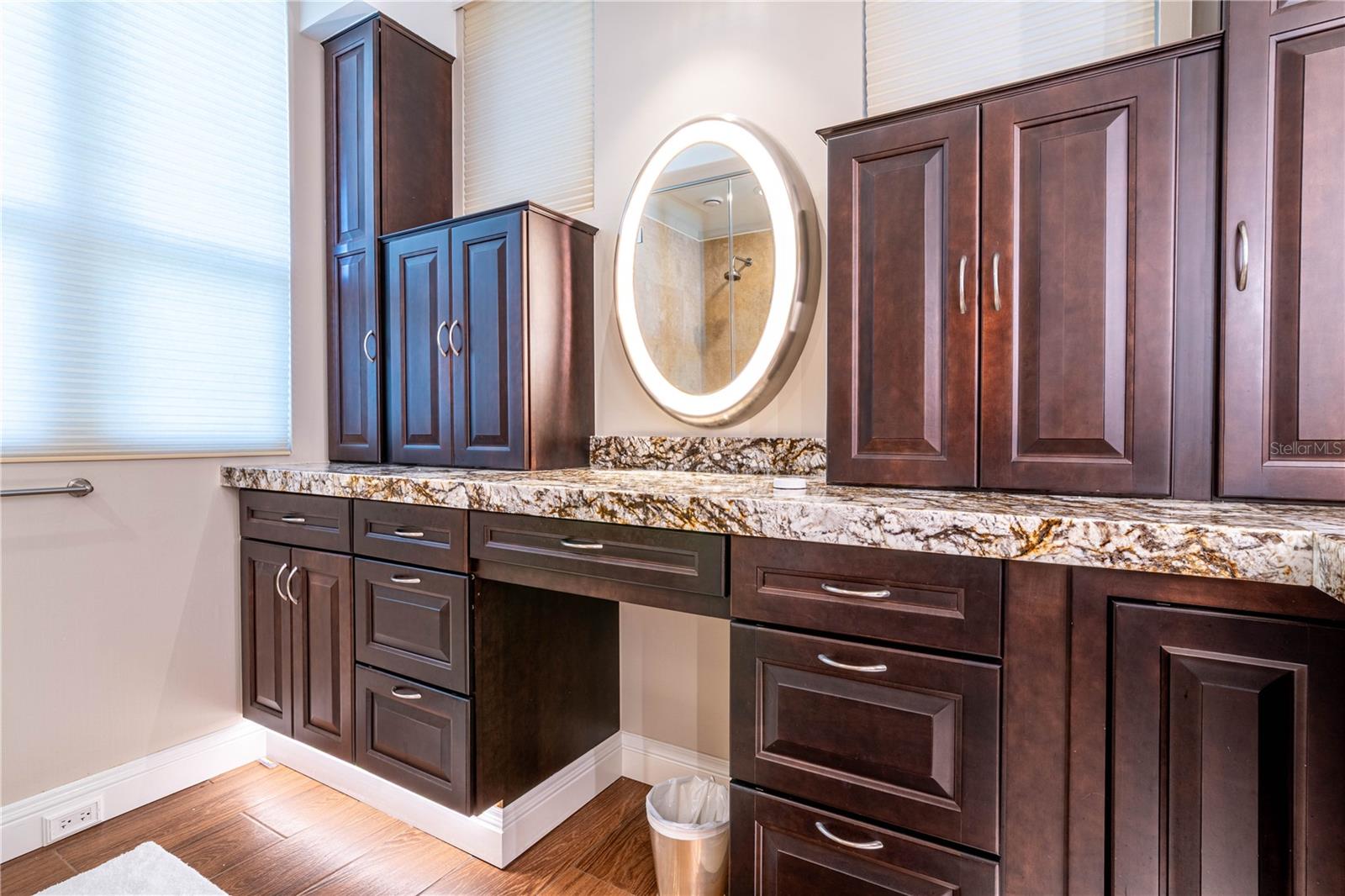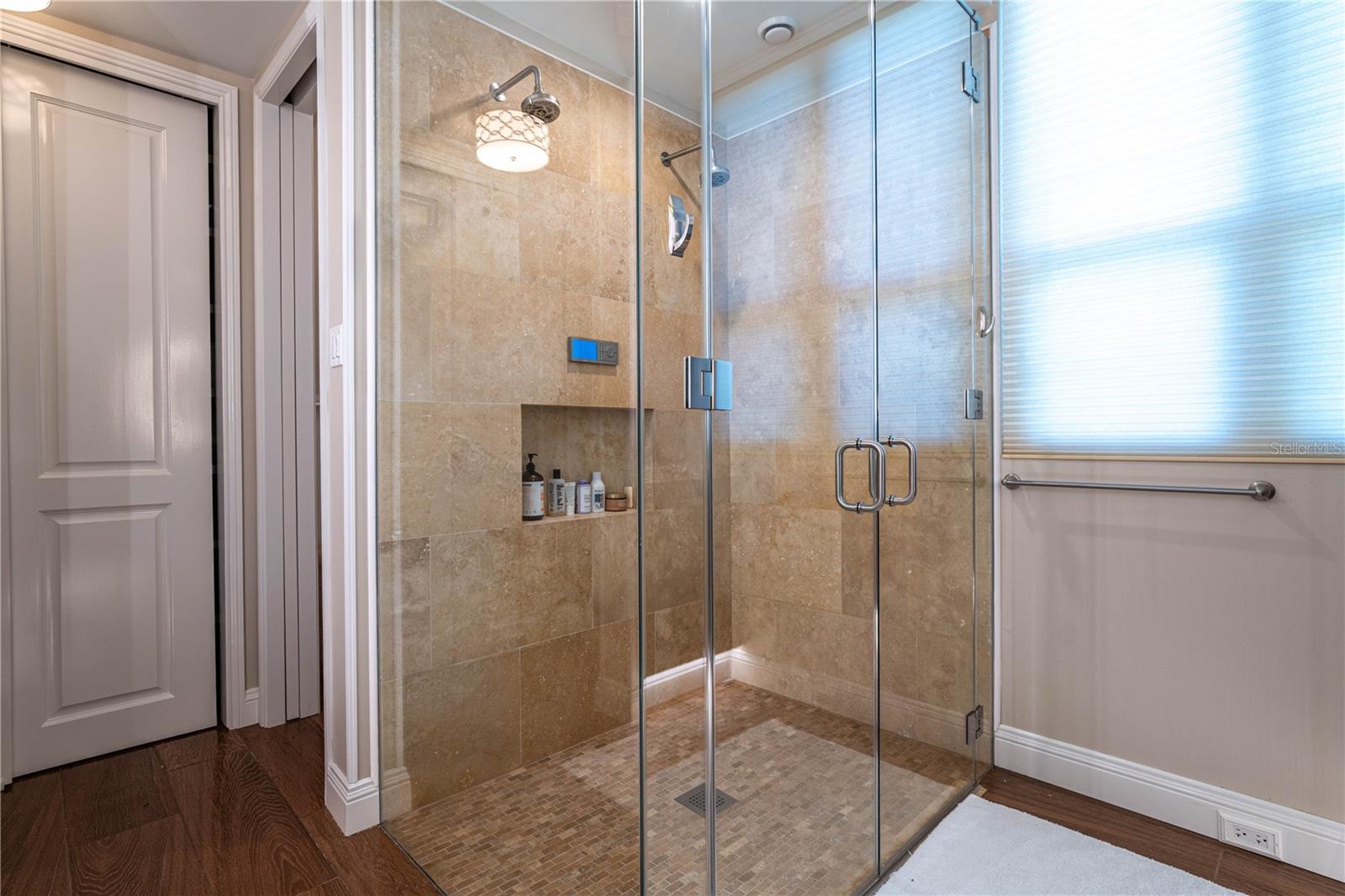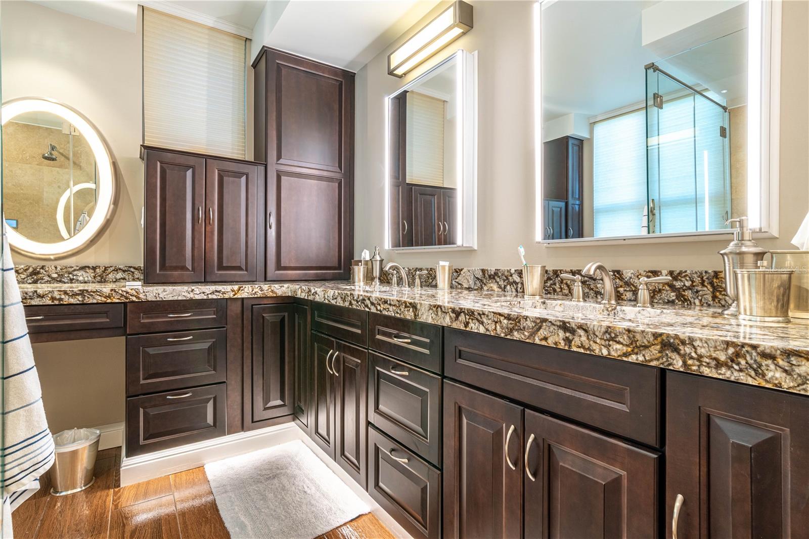 The primary suite offers a custom walk-in cedar closet with layered lighting, built-ins, and displays, along with a spa-inspired bath featuring dual digital showers, double vanities, and extensive storage. Two additional guest bedrooms, a guest bath, powder room, and dedicated laundry complete the layout.