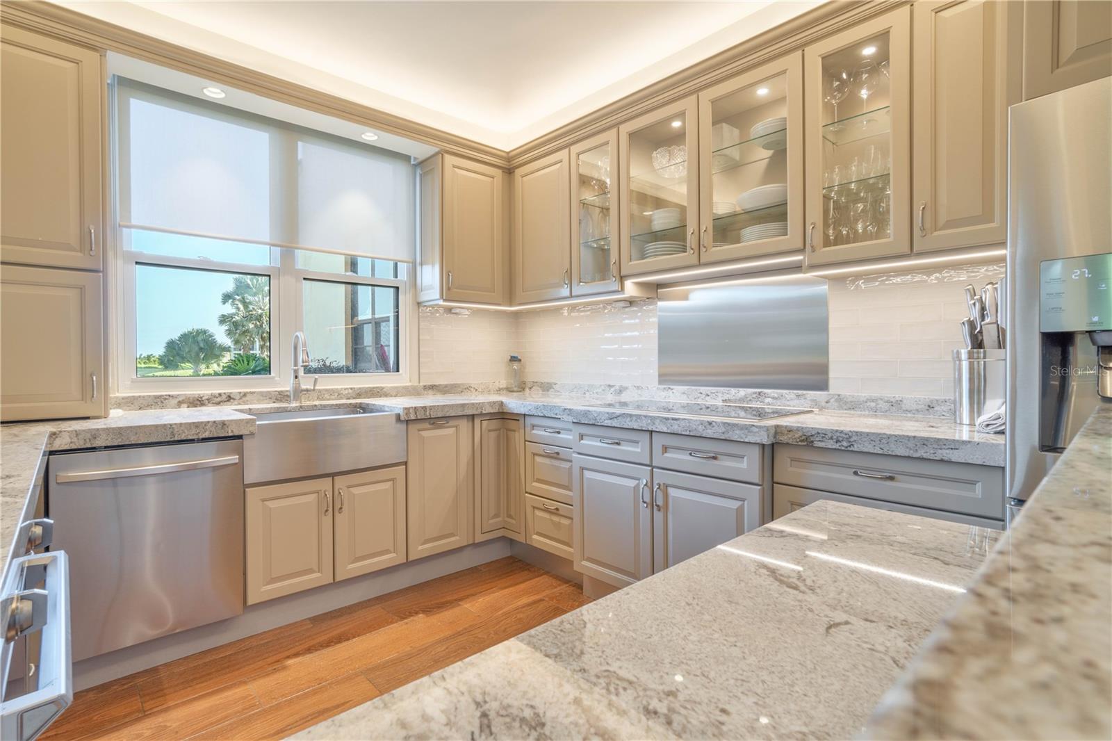The chef’s kitchen is equipped with imported stone countertops from Italy, Turkey, and Kashmir, handmade Spanish tile backsplash, Thermador induction cooktop with retractable venting, double ovens, Fisher & Paykel dishwashers, multiple refrigerators, wine fridge, motion-activated faucet, custom cedar cabinetry, pantry, and outdoor buffet area—all fully stocked and included.