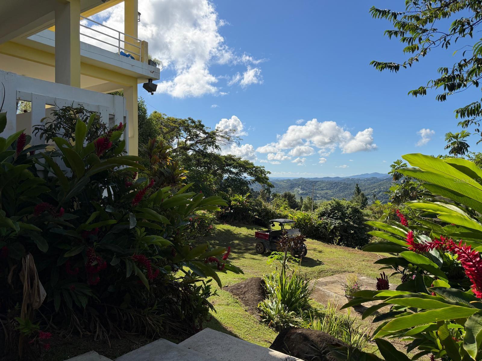 The property is surrounded by fruit trees and ornamental plants, including breadfruit, plantain, papaya, fig, mango, dragon fruit, pomarosa, loquat, coconut, and banana trees.