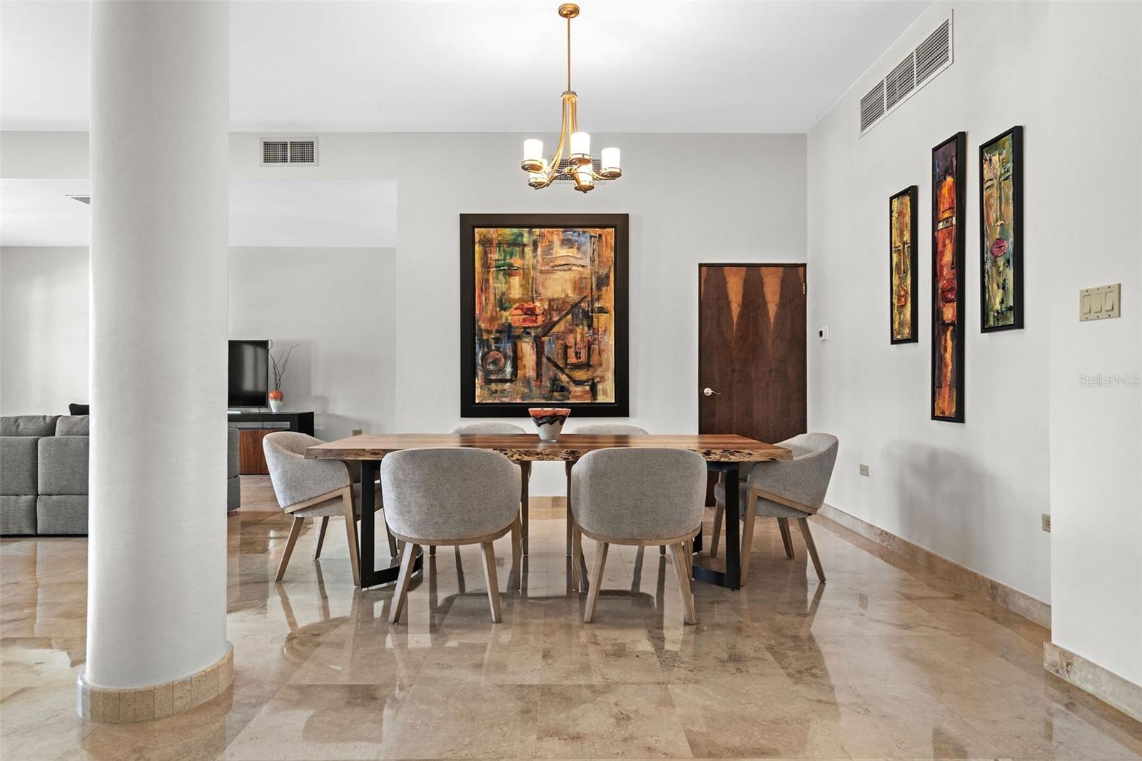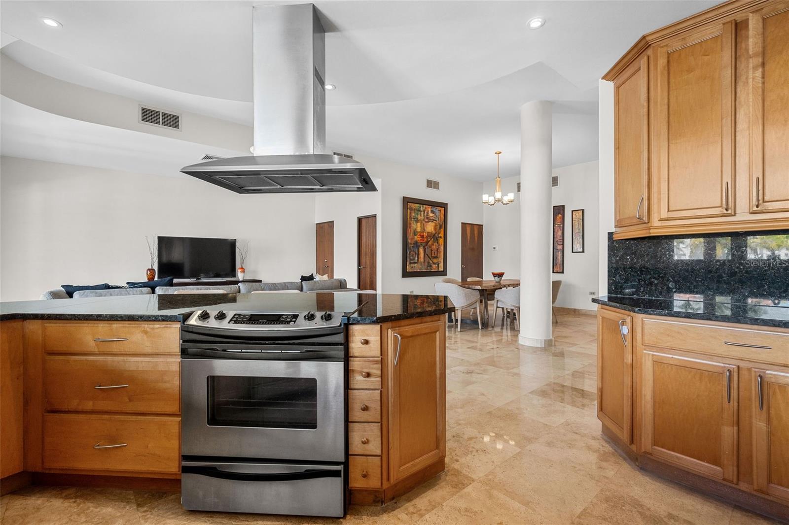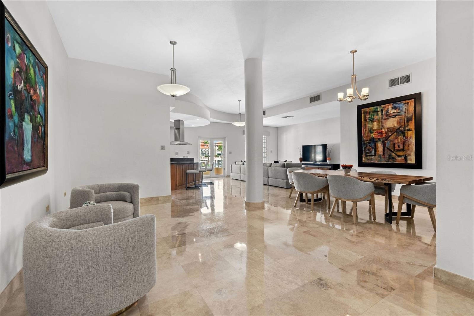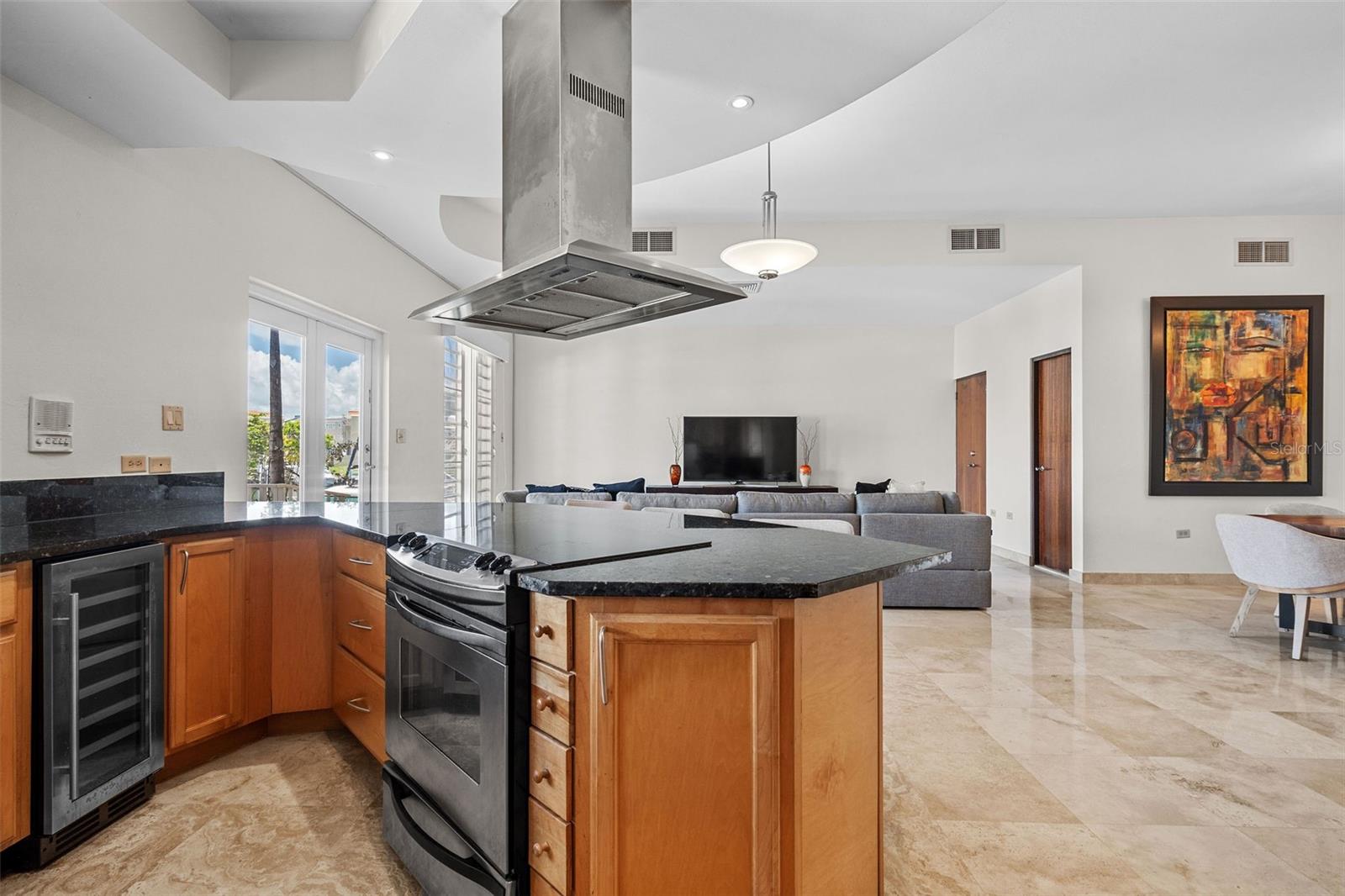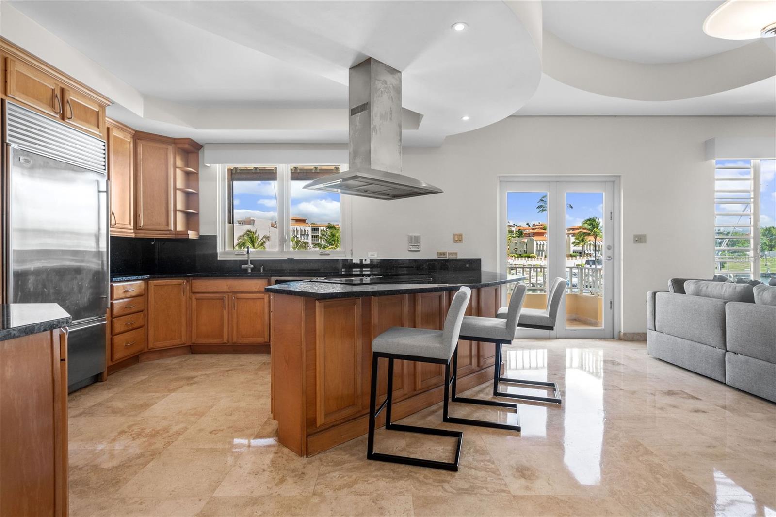 The chef’s kitchen is equipped with high-end appliances, ample counter space, and an open layout that seamlessly connects to the living and dining areas, perfect for entertaining while enjoying marina views.