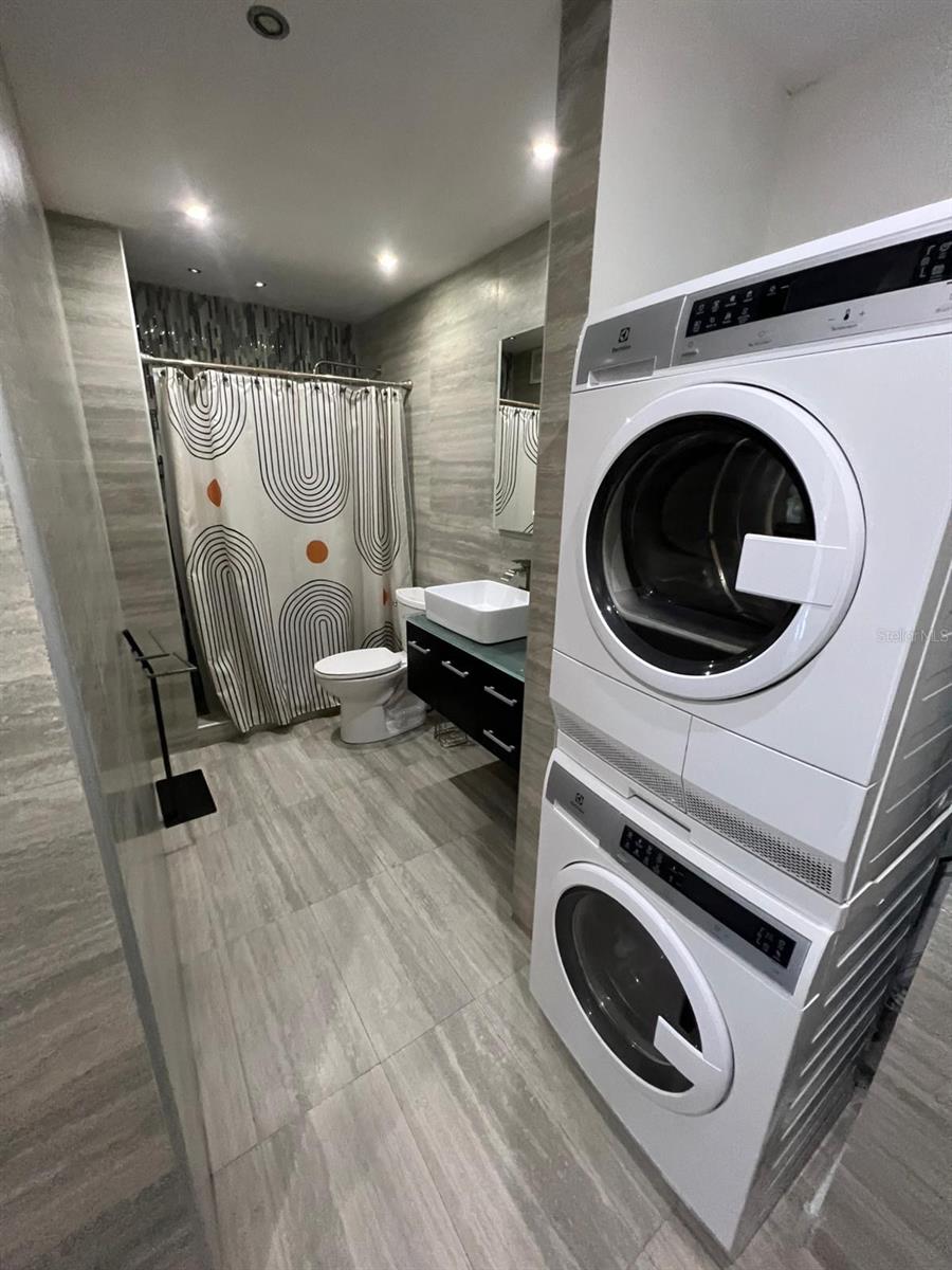 Includes essential appliances such as stove, washer and dryer, and microwave–refrigerator combo. Special mention: wine cooler.