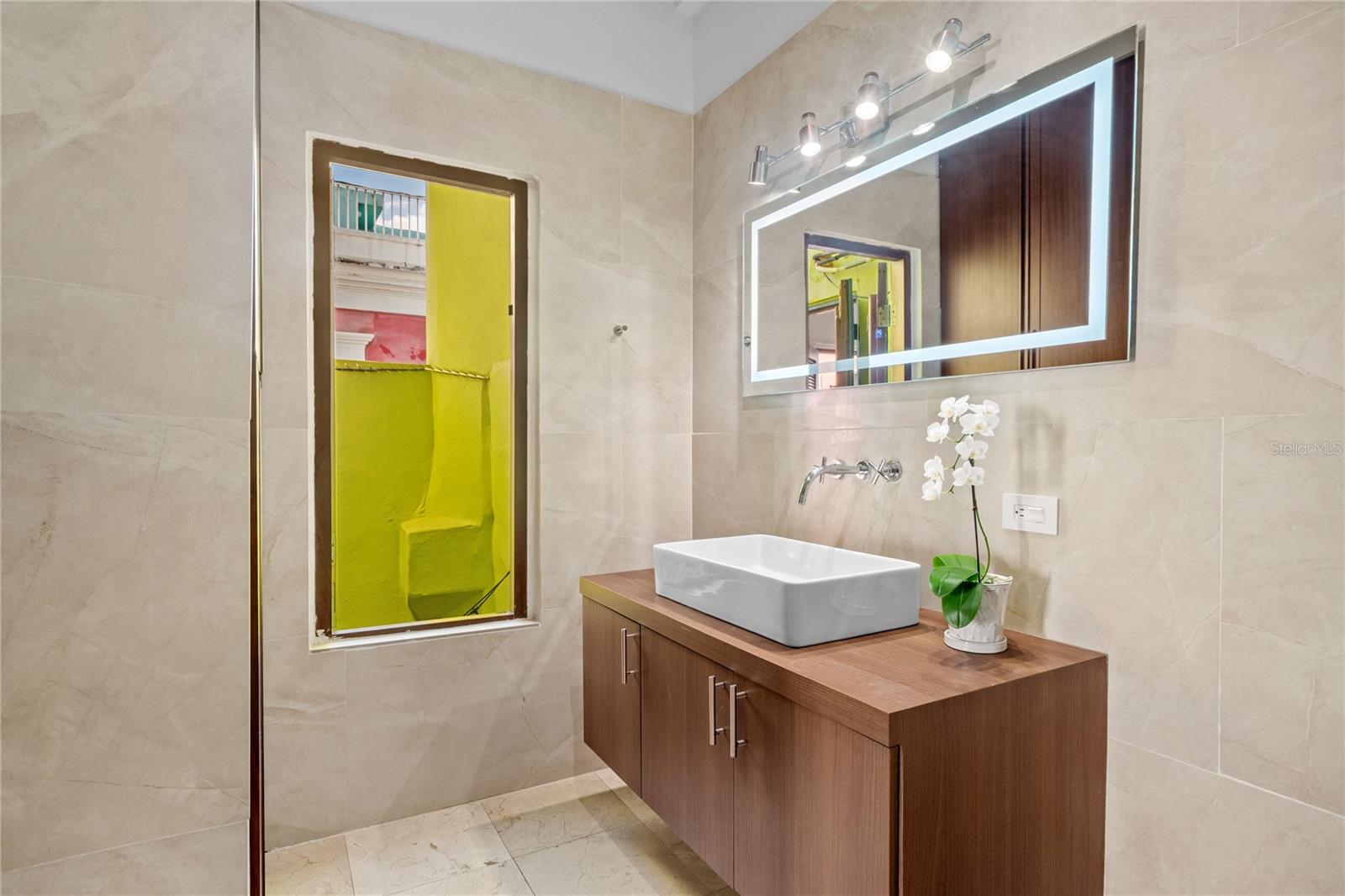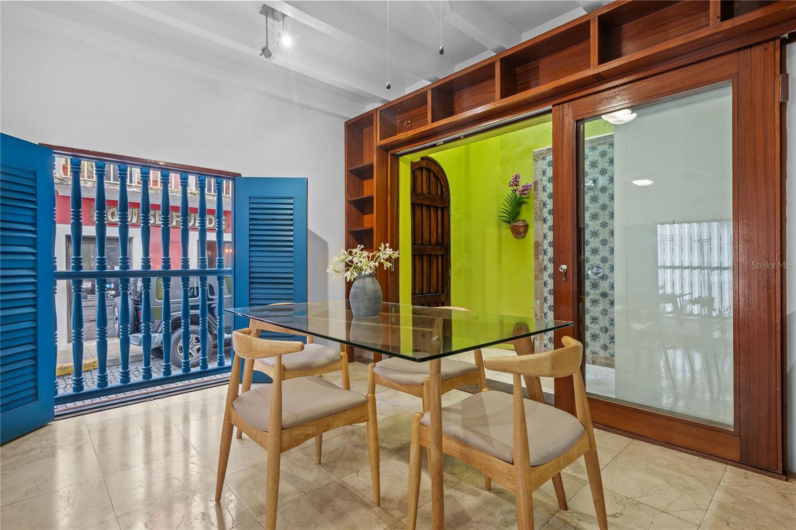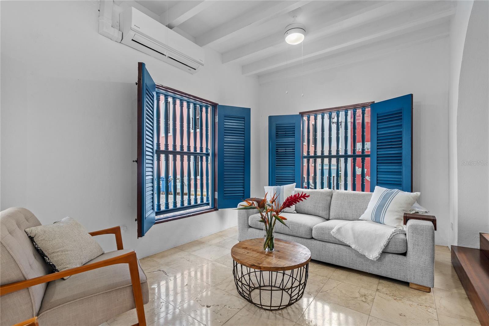 Situated on one of the most iconic and photographed blocks in Old San Juan, at the corner of San Sebastián and San Justo Streets, this distinctive corner townhouse forms part of a visually unified row of privately owned homes. Distinguished by its corner placement and elevated setting, the residence anchors the block with a vivid canary-green façade accented by cobalt-blue doors, windows, and wood balconies—an architectural palette emblematic of Old San Juan’s historic character. Its position on one of the highest points of the old city affords constant trade-wind cross breezes and open outlooks, with ocean and bay glimpses from multiple levels. The home occupies an intimate footprint, yet unfolds across three levels designed to maximize light, airflow, and indoor-outdoor living. The ground floor features an open kitchen, dining, and living area ideal for entertaining, opening onto a private interior courtyard. A signature outdoor shower—framed in patterned Spanish-style tiles and open to the sky—serves as both a functional amenity and a classic Old San Juan architectural detail, accessed discreetly from within the home and directly from San Sebastian street through an arched blue door. The second level offers two bedrooms and a full bathroom. One bedroom opens onto a wide balcony facing San Justo Street, capturing ocean glimpses and prevailing breezes, while both bedrooms feature Juliet balconies facing San Sebastián Street, enhancing natural light and cross ventilation throughout. The third level hosts a spacious flex room with a full bathroom—suitable as a primary bedroom, family room, or studio—opening directly onto an L-shaped terrace with expansive views over the historic rooftops, the bay, and the Atlantic Ocean beyond. A spiral staircase ascends from the terrace to an open rooftop deck outfitted as a relaxed lookout and lounge area. From this elevated vantage point, the home commands sweeping panoramic views of Old San Juan’s skyline, coastline, and surrounding cityscape. Located on San Sebastián Street, one of the district’s most celebrated thoroughfares and within close proximity to renowned restaurants, cafés, and cultural landmarks, this exceptional corner townhouse offers a rare opportunity to own a visually iconic, light-filled residence that captures the essence of Old San Juan’s architectural and cultural legacy.