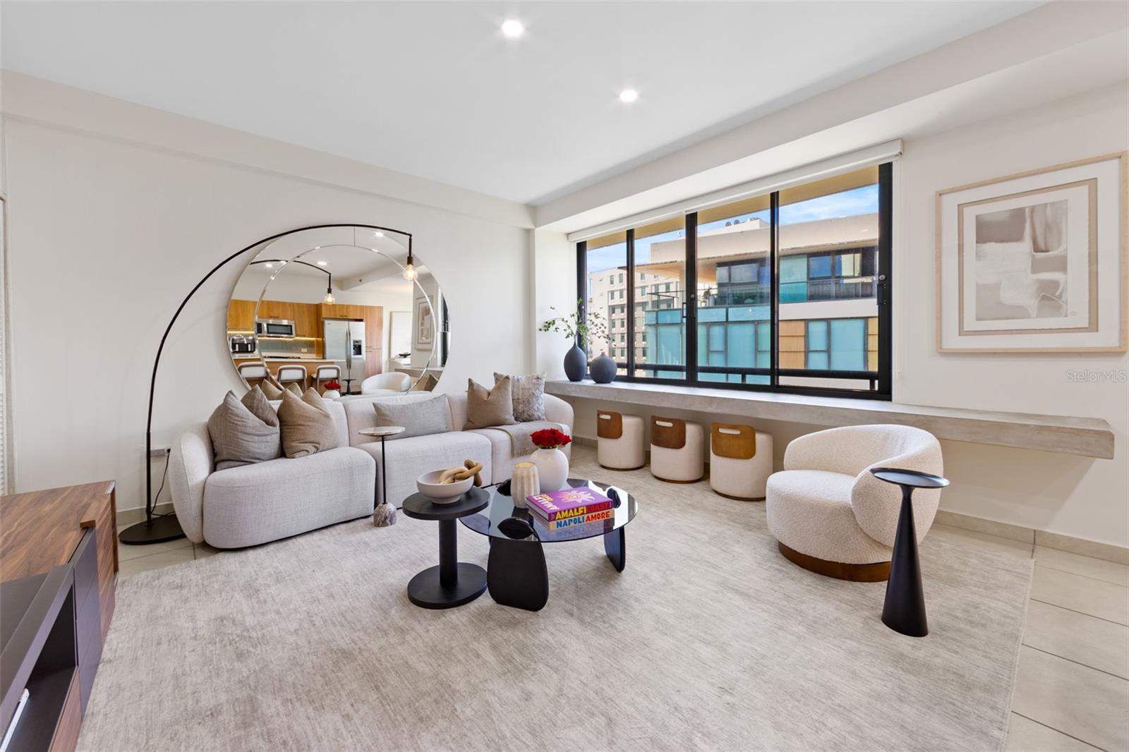 The elegantly decorated kitchen and living room offer a sophisticated yet comfortable setting, ideal for entertaining guests or unwinding at home. A bright dining nook, framed by floor-to-ceiling windows, fills the space with abundant natural light and provides the perfect spot for morning coffee or casual meals.