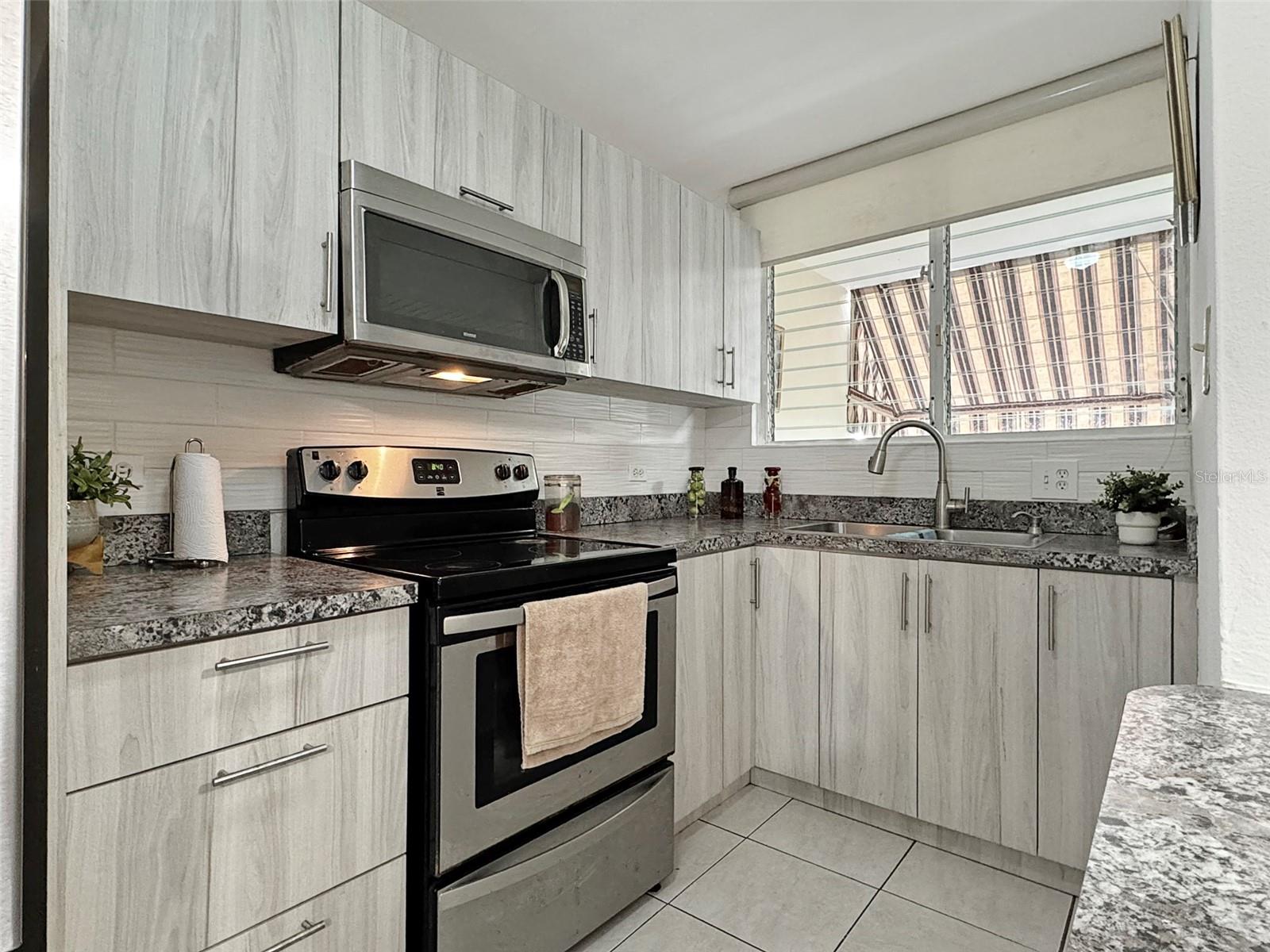 Bathed in natural light, the open living and dining areas flow seamlessly onto a private, tree-lined balcony, creating a tranquil retreat for morning rituals and relaxed evenings. The elegantly updated kitchen, finished with beautiful countertops and stainless steel appliances, is both functional and inviting.