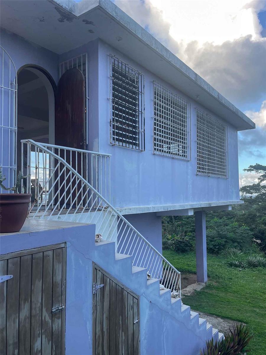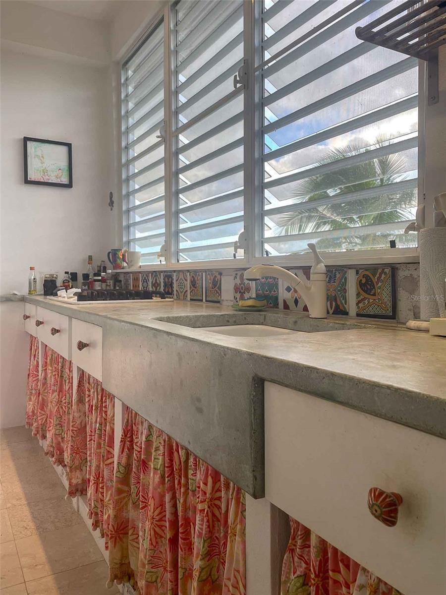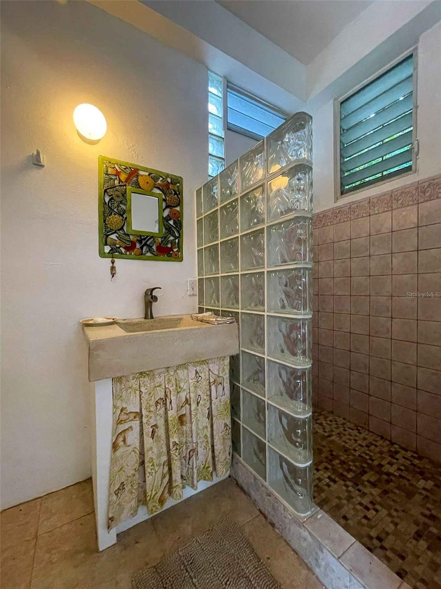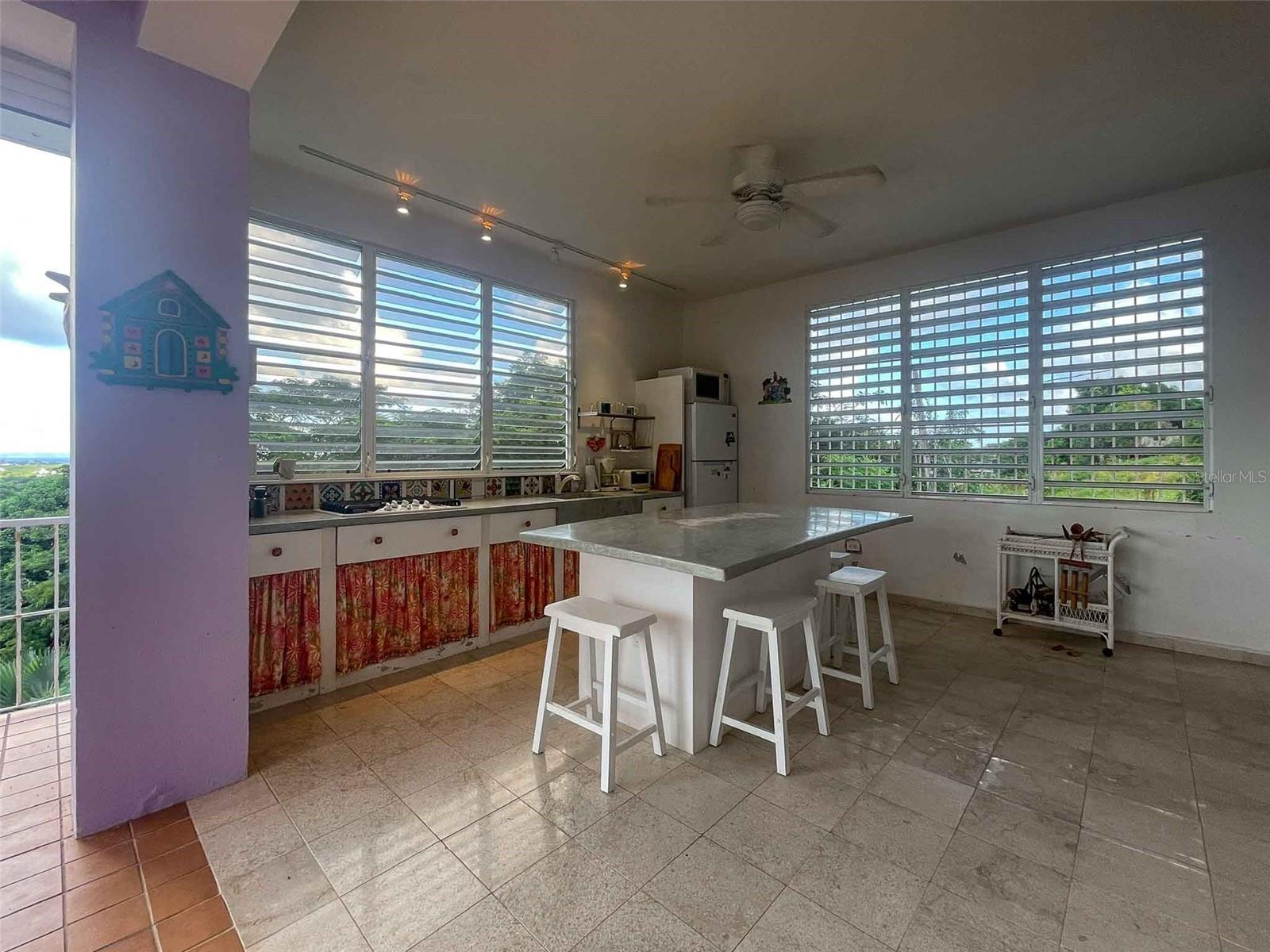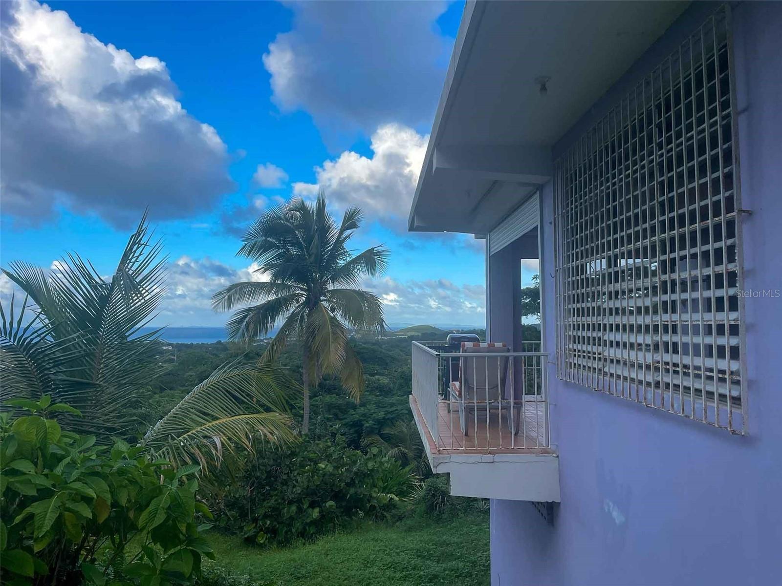 Casa Verde is a 1-bedroom, 2-bath concrete home nestled into the green hills above Monte Santo on Vieques Island, Puerto Rico. Perched at the end of a quiet road and surrounded by mature gardens, palm trees, and pastureland, this property offers both privacy and panoramic views stretching from the north coast of Vieques to Culebra, mainland Puerto Rico, and the Caribbean Sea. Set on a fully fenced half-acre parcel, Casa Verde features a two-level layout with an elevated main floor and ground-level covered parking and storage. The home includes a unique opportunity to expand upward, with an exterior staircase leading to an unfinished rooftop terrace—offering the potential to create a spectacular third-floor deck or additional living space. The main living area is light-filled and open, with tall ceilings, abundant windows, and an airy layout that connects the living room, dining area, and kitchen. French doors open to a covered balcony that captures the trade winds and delivers daily views of ferry boats, sunrises, and sunsets. The kitchen features a gas stove, decorative tile work, open shelving, and a central island ideal for food prep, crafts, or casual dining. A wall of windows floods the space with natural light. Painted concrete floors throughout add durability and character. The primary bedroom accommodates a king-sized bed and includes an ensuite bathroom with a glass block shower and direct access to a private back patio with an outdoor shower and bathtub—perfect for rinsing off after the beach or enjoying a soak under the stars. A laundry closet is conveniently located within the primary suite. A "second" bedroom, separated from the main living area by a partial wall, includes a large closet and potential for privacy improvements. The home also includes a bonus room/office space that could serve as a third sleeping area, and a second full bathroom accessible to guests and the secondary bedroom. Surrounding the house is a lush and carefully curated garden, filled with tropical plants and mature palms that frame the panoramic views. Located at the top of the hillside neighborhood above Monte Santo, the home enjoys a serene setting with minimal street traffic and easy access to both Isabel Segunda and the island’s north shore beaches. Whether you’re looking for a peaceful full-time residence, a Caribbean vacation home, or a flexible island retreat with room to grow, Casa Verde offers comfort, style, and island charm in equal measure.
