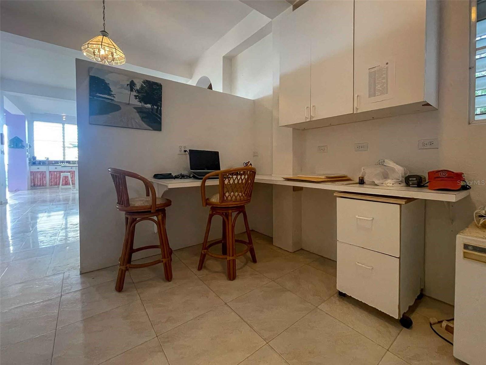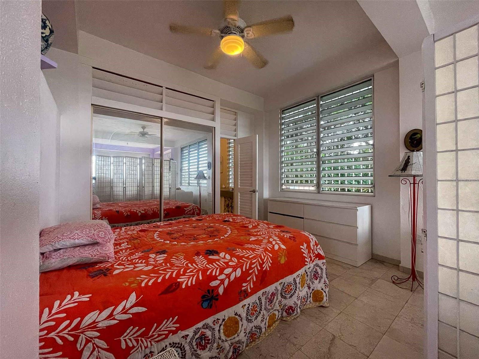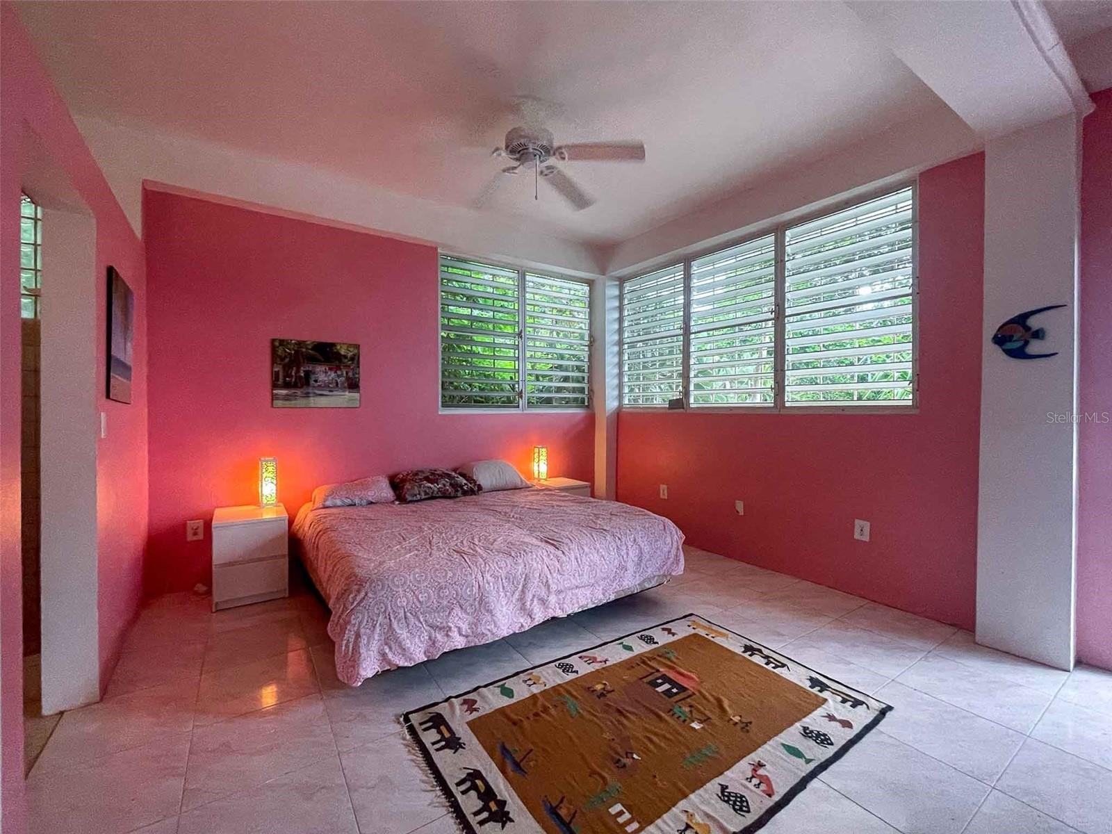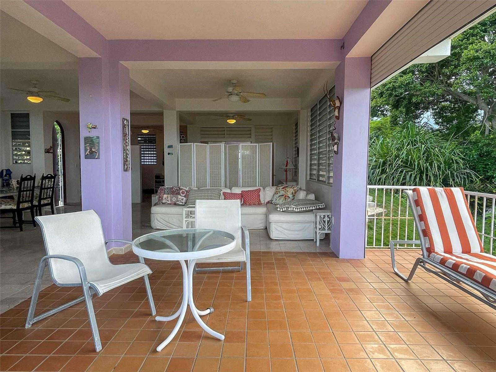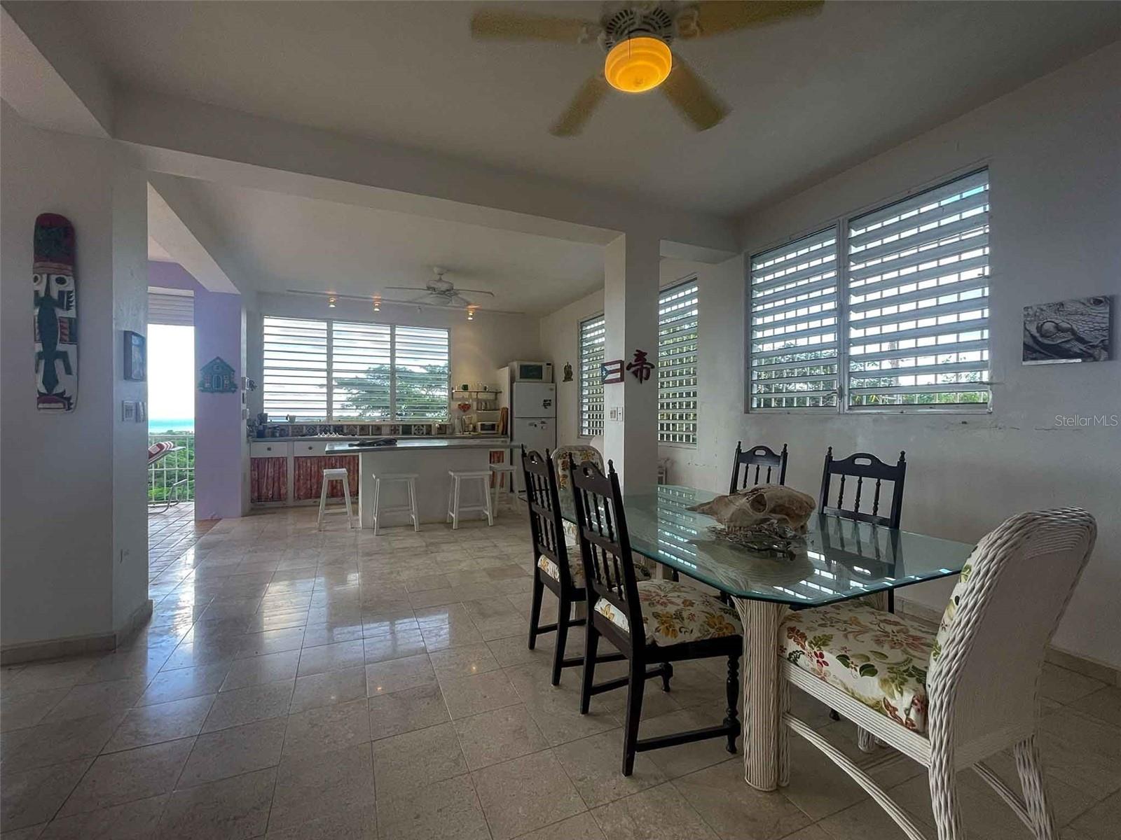 Casa Verde is a 1-bedroom, 2-bath concrete home nestled into the green hills above Monte Santo on Vieques Island, Puerto Rico. Perched at the end of a quiet road and surrounded by mature gardens, palm trees, and pastureland, this property offers both privacy and panoramic views stretching from the north coast of Vieques to Culebra, mainland Puerto Rico, and the Caribbean Sea. Set on a fully fenced half-acre parcel, Casa Verde features a two-level layout with an elevated main floor and ground-level covered parking and storage. The home includes a unique opportunity to expand upward, with an exterior staircase leading to an unfinished rooftop terrace—offering the potential to create a spectacular third-floor deck or additional living space. The main living area is light-filled and open, with tall ceilings, abundant windows, and an airy layout that connects the living room, dining area, and kitchen. French doors open to a covered balcony that captures the trade winds and delivers daily views of ferry boats, sunrises, and sunsets. The kitchen features a gas stove, decorative tile work, open shelving, and a central island ideal for food prep, crafts, or casual dining. A wall of windows floods the space with natural light. Painted concrete floors throughout add durability and character. The primary bedroom accommodates a king-sized bed and includes an ensuite bathroom with a glass block shower and direct access to a private back patio with an outdoor shower and bathtub—perfect for rinsing off after the beach or enjoying a soak under the stars. A laundry closet is conveniently located within the primary suite. A "second" bedroom, separated from the main living area by a partial wall, includes a large closet and potential for privacy improvements. The home also includes a bonus room/office space that could serve as a third sleeping area, and a second full bathroom accessible to guests and the secondary bedroom. Surrounding the house is a lush and carefully curated garden, filled with tropical plants and mature palms that frame the panoramic views. Located at the top of the hillside neighborhood above Monte Santo, the home enjoys a serene setting with minimal street traffic and easy access to both Isabel Segunda and the island’s north shore beaches. Whether you’re looking for a peaceful full-time residence, a Caribbean vacation home, or a flexible island retreat with room to grow, Casa Verde offers comfort, style, and island charm in equal measure.