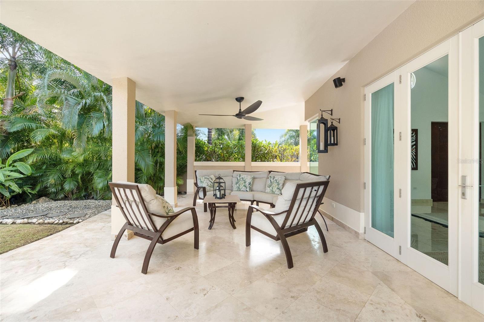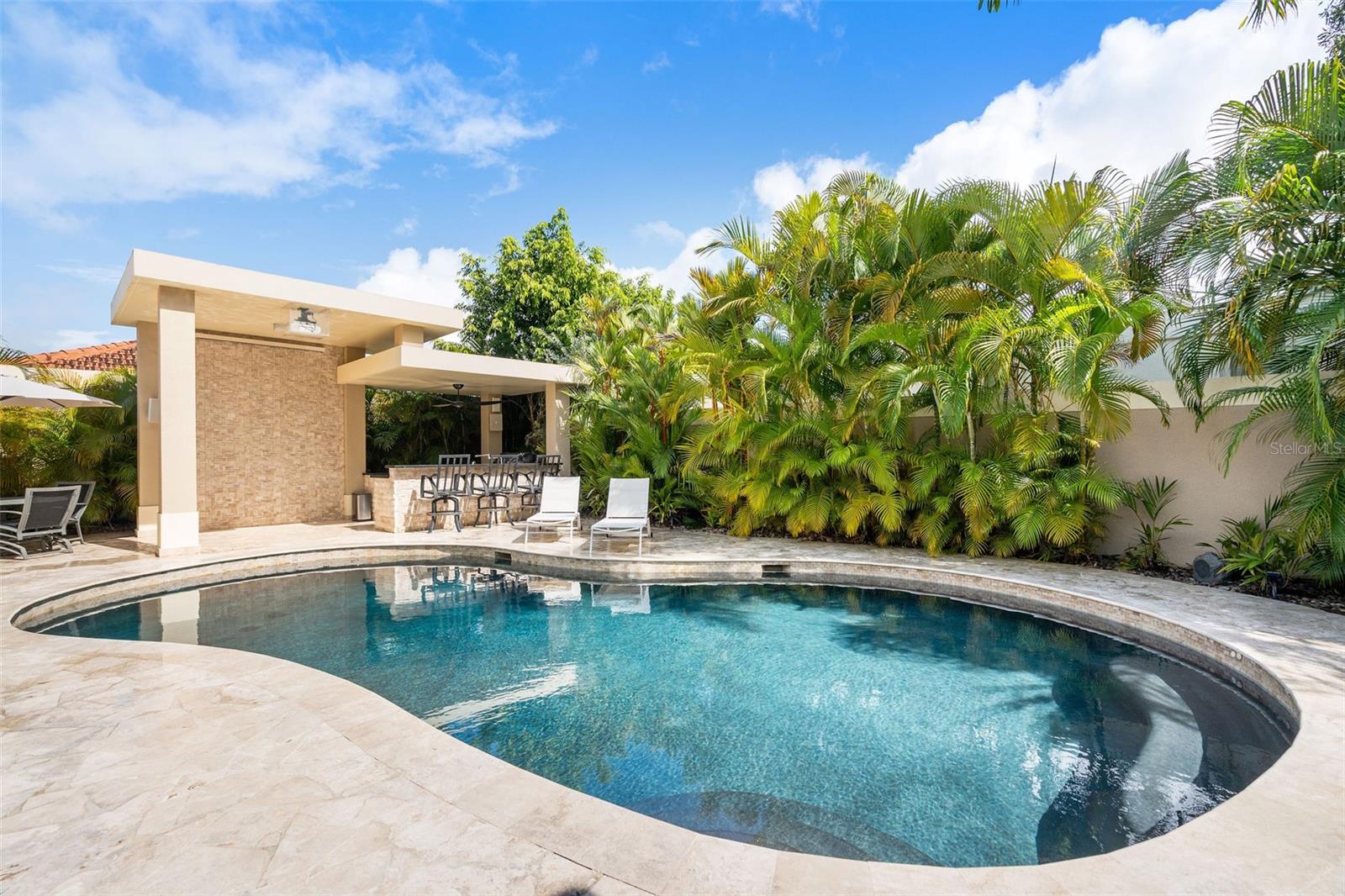 Outdoor living is equally inviting, featuring a covered terrace, a BBQ kitchen, and a resort-style pool complete with an outdoor shower and bathroom, ideal for entertaining and enjoying Puerto Rico’s year-round tropical climate.