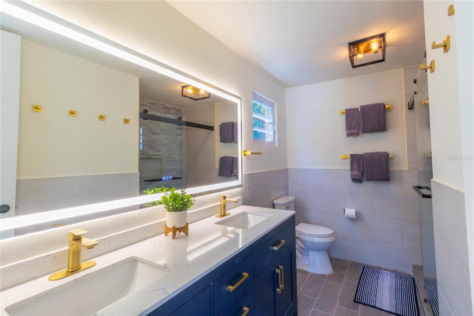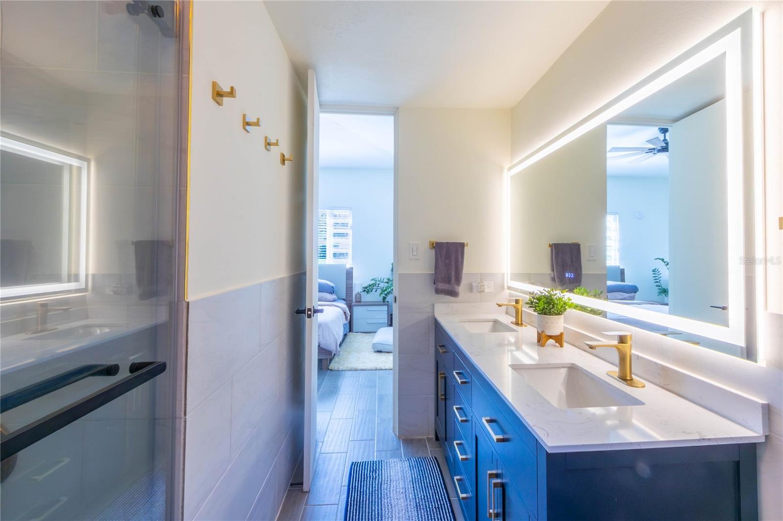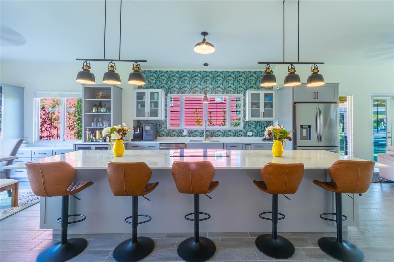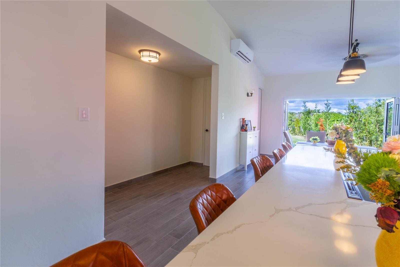 This open-concept residence has been fully renovated from top to bottom, blending modern design with high-end finishes. The heart of the home is the custom chef’s kitchen, featuring stainless steel appliances, quartz countertops, custom cabinetry, and an impressive 12-foot island—ideal for entertaining and everyday living. Accordion doors fully open the back wall, creating seamless indoor-outdoor living while framing stunning views of El Yunque.