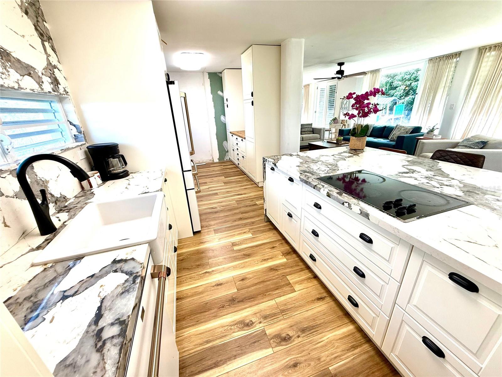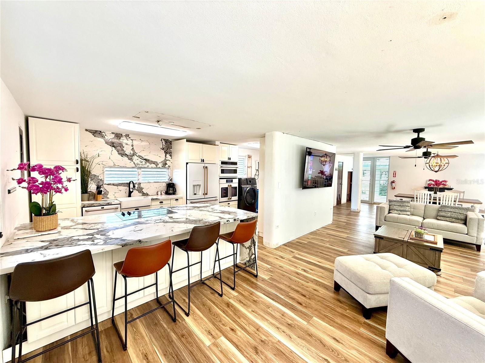 The home has been thoughtfully redesigned to feature a bright, open-concept layout, seamlessly connecting the living room, dining area, and kitchen—ideal for both everyday living and entertaining. The spacious modern kitchen is a standout, showcasing a large central island, elegant stone countertops, and high-end Café appliances, complemented by a walk-in pantry and a laundry room conveniently integrated next to the kitchen for added functionality.