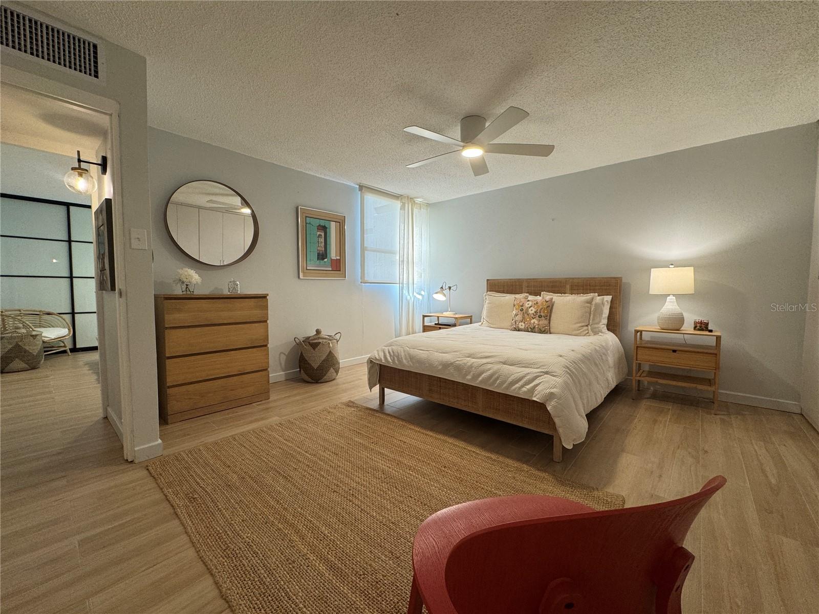 Additional features include new flooring, California Closet organizers, blackout and sheer weave curtains, a dedicated laundry room with utility sink and one covered parking space. The building is surrounded by lush landscaped green areas and fountains, creating a serene retreat that brings nature into daily city life. Amenities include a partial backup generator for common areas and a water cistern.