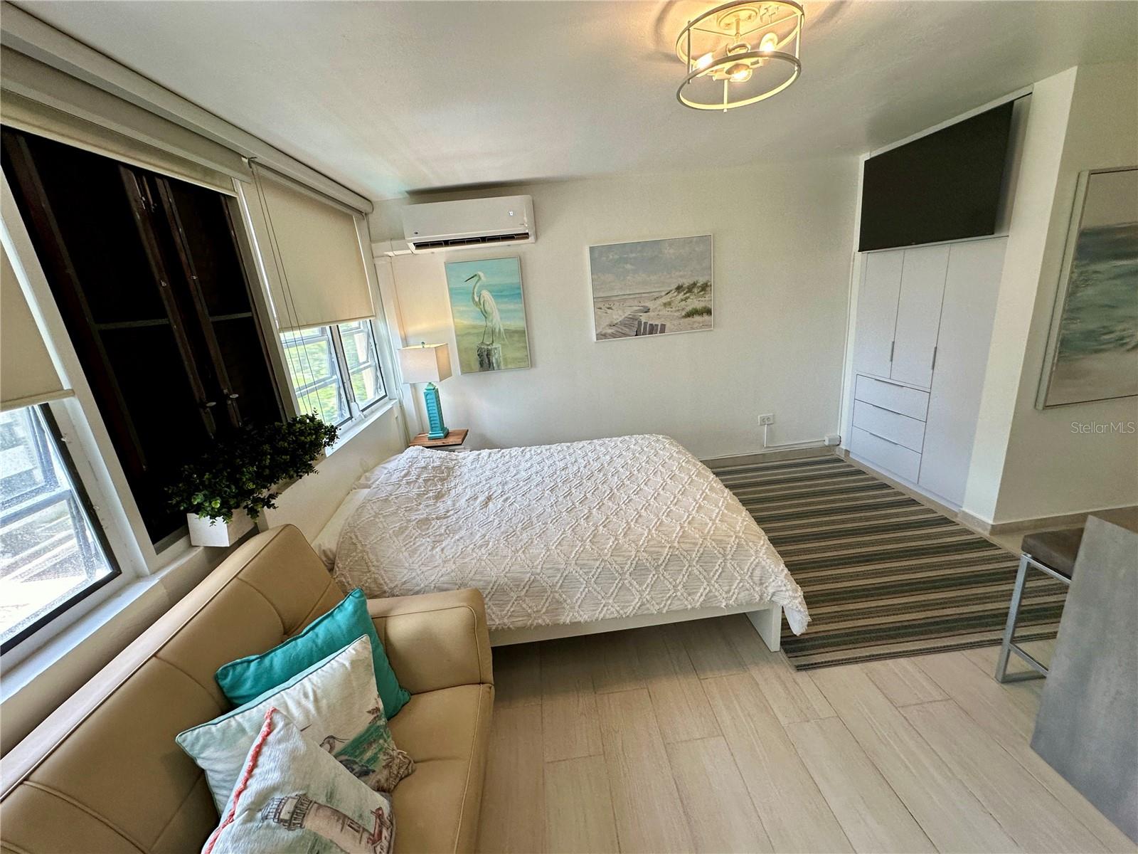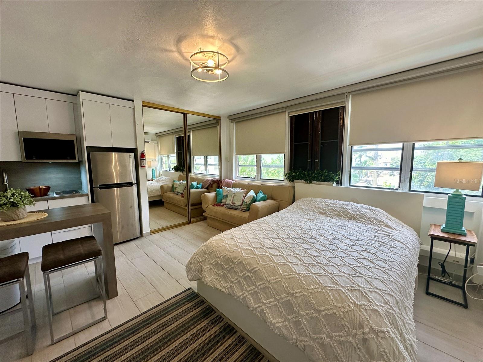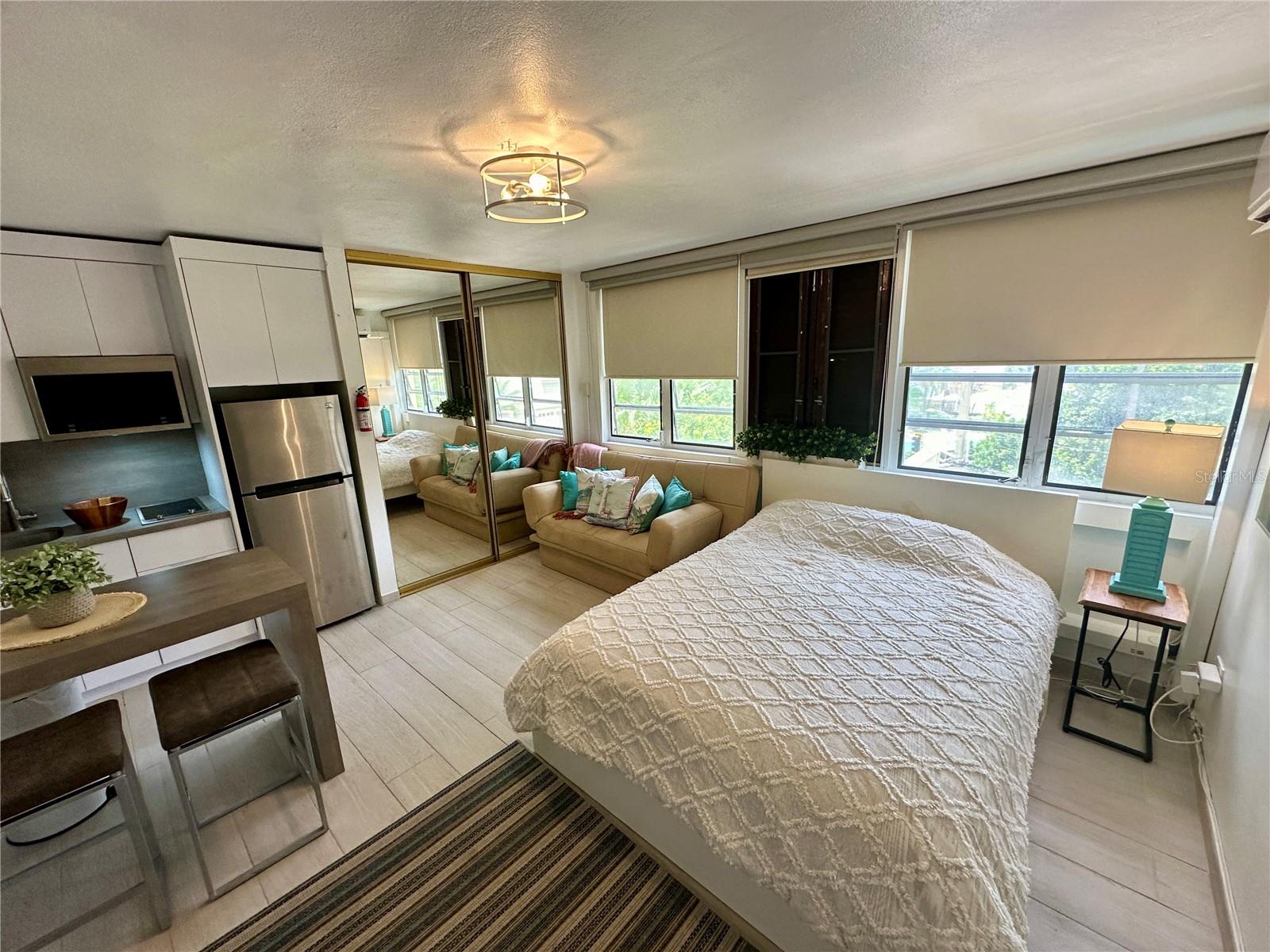 This well-appointed studio features a queen bed plus a sofa bed, offering flexible sleeping arrangements. The compact kitchen includes a stovetop, refrigerator, and freezer, ideal for day-to-day convenience. The unit also includes one full bathroom.