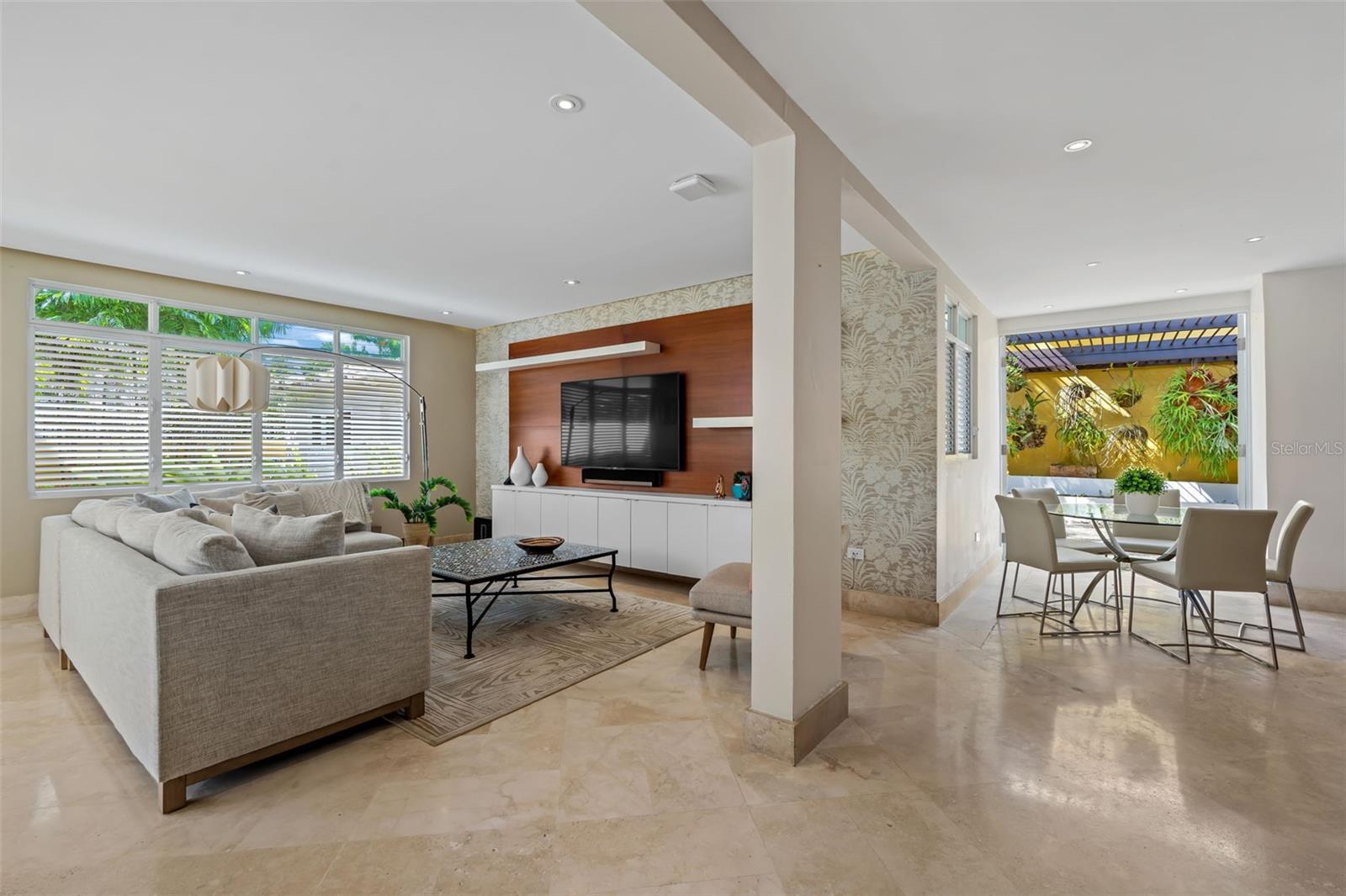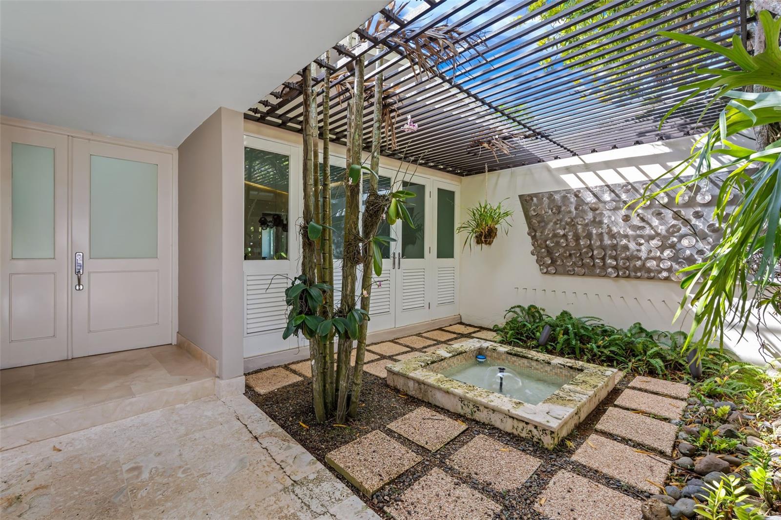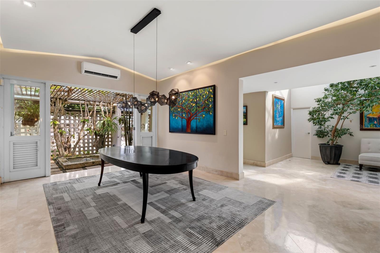 This stunning single-story residence offers a seamless blend of elegance, comfort, and nature. From the moment you enter the property, you are welcomed by the soothing sound of a refined water fountain set in a beautifully landscaped exterior courtyard, creating a tranquil transition into the home. This courtyard connects directly to the interior dining area, allowing natural light, greenery, and outdoor serenity to flow effortlessly indoors.