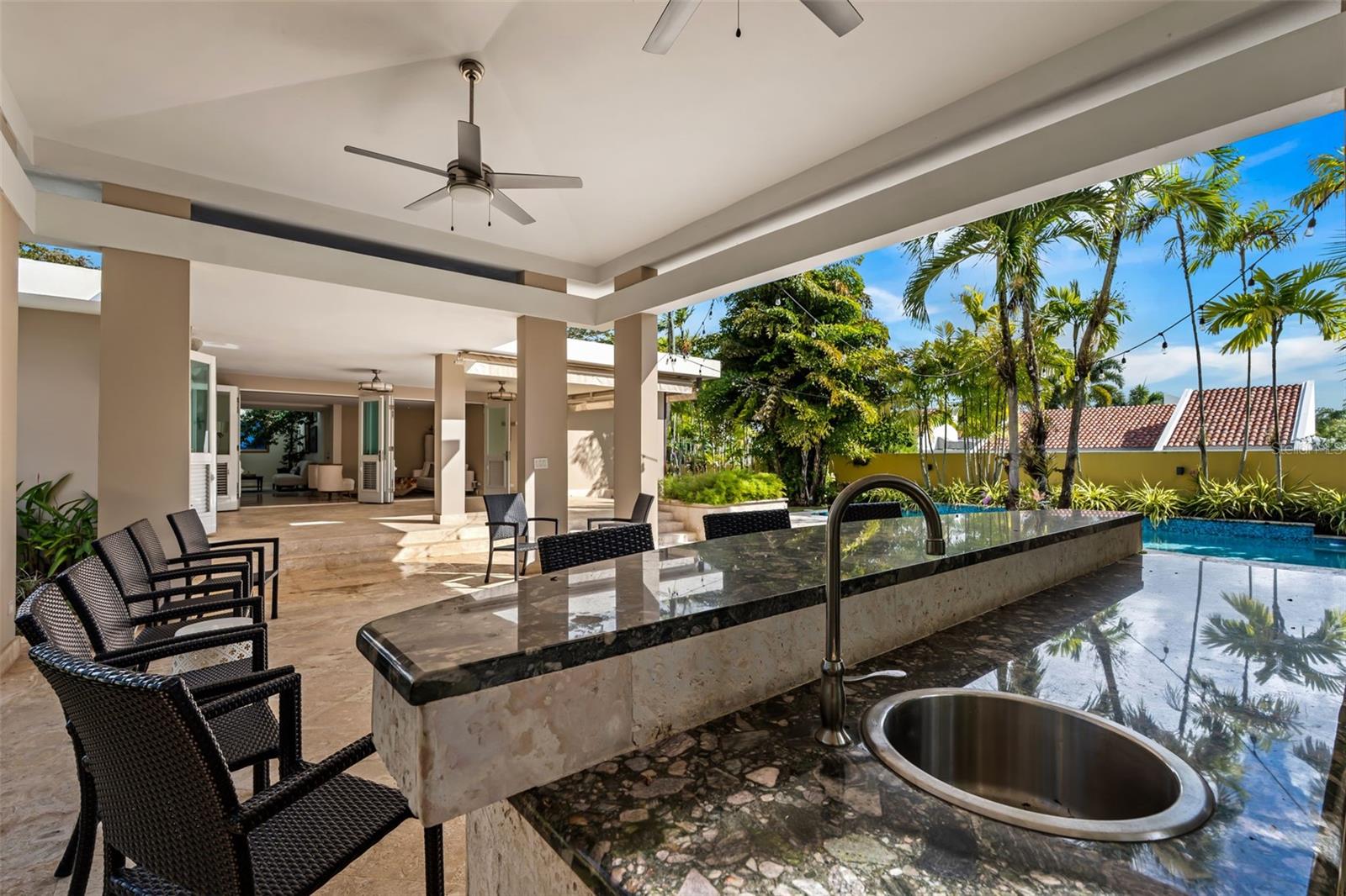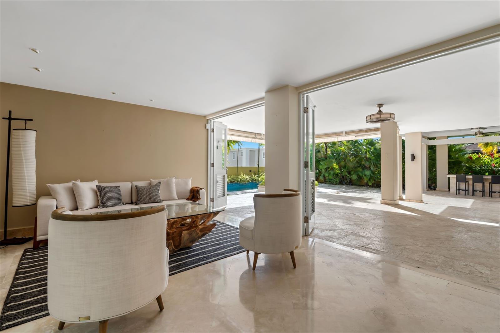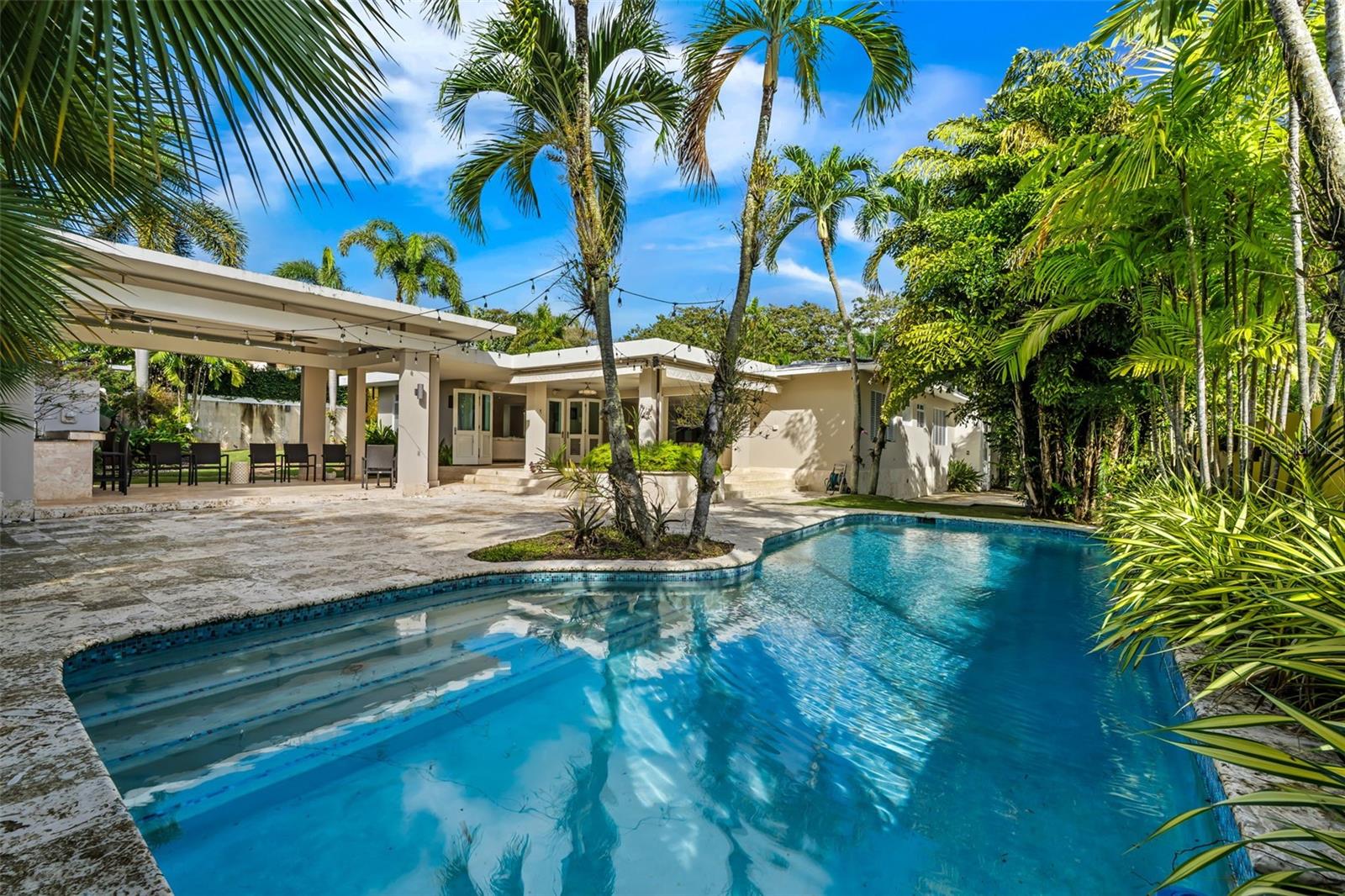 Upon entry, the brilliance of the marble floors reflects the abundant natural light guiding your view toward the breathtaking backyard. The outdoor area is truly captivating, featuring three terraces, a swimming pool, a small basketball court, and an additional detached structure complete with a full bathroom and shower; ideal for a home office, studio, guest suite, or flexible living space.
