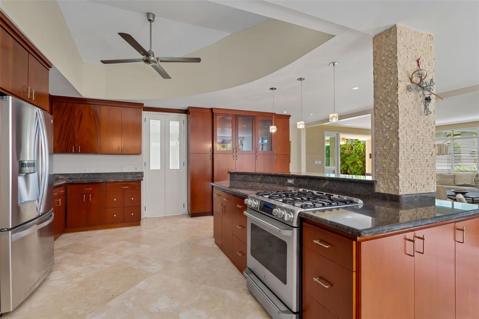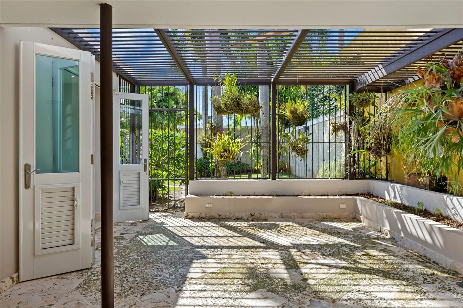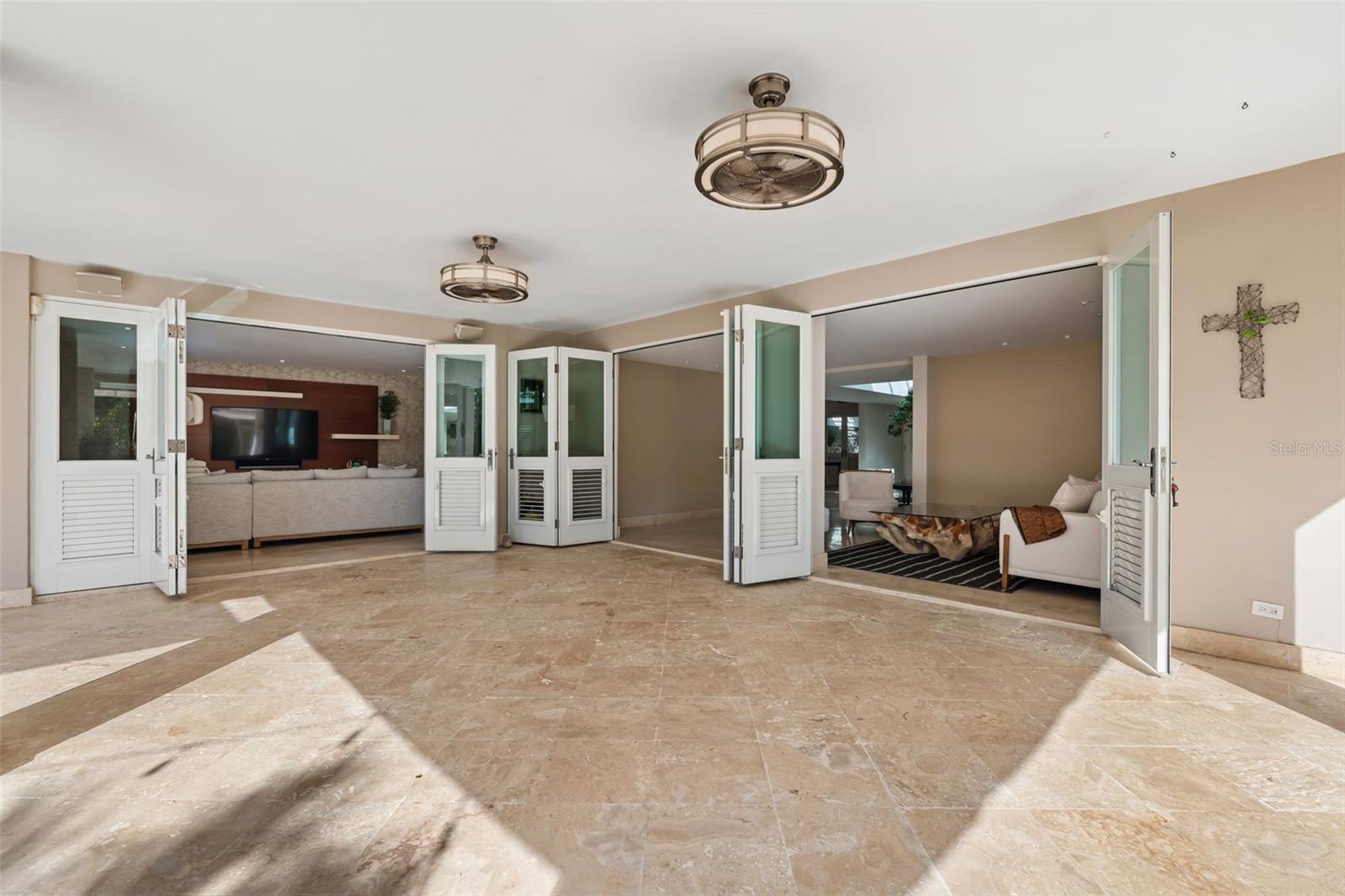 The living areas include a formal living room and a family room, both equipped with security doors that open to the exterior, enhancing the connection to the lush backyard and creating a peaceful, indoor-outdoor living experience.