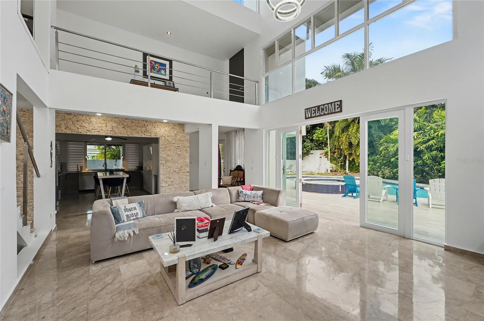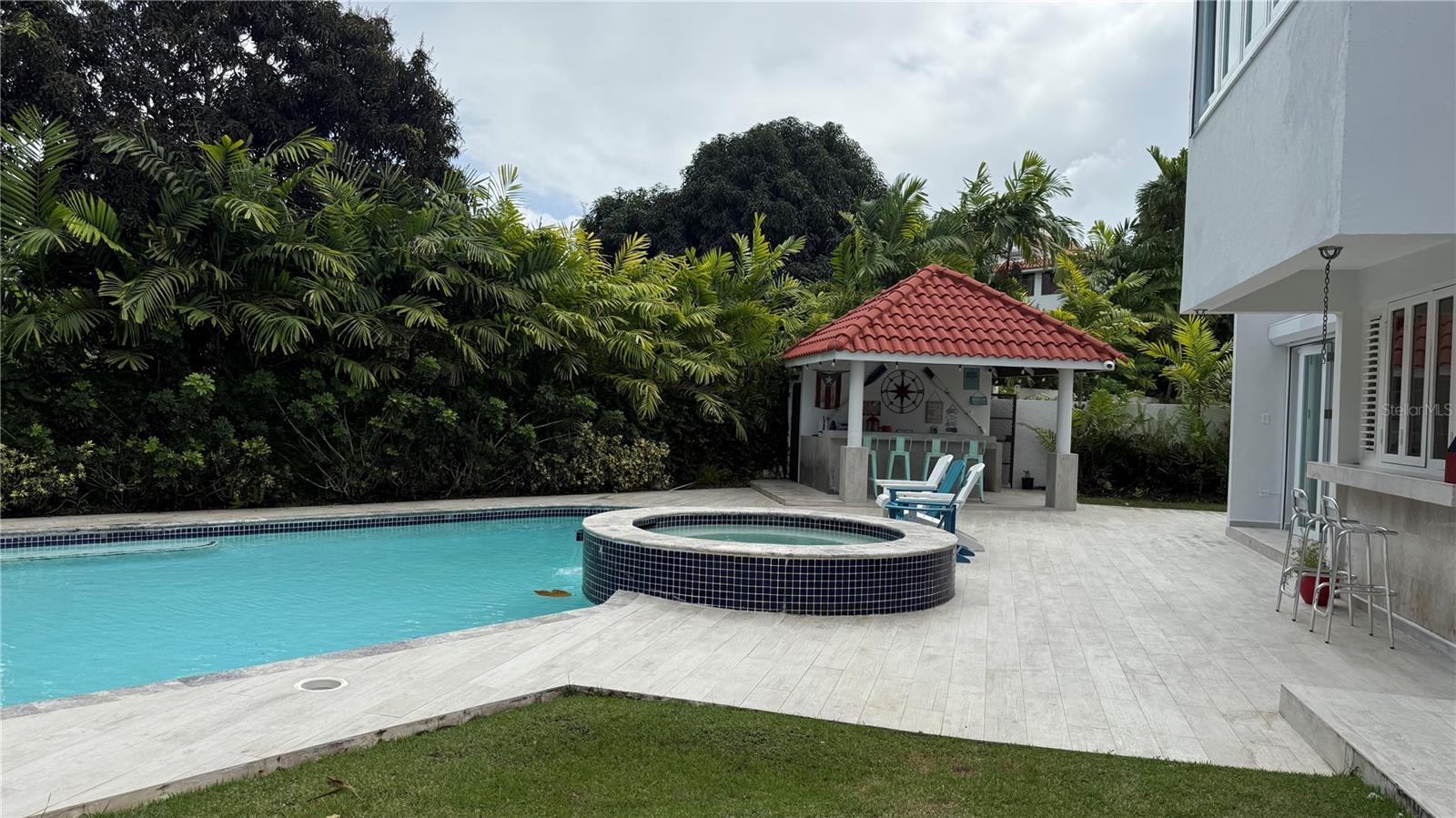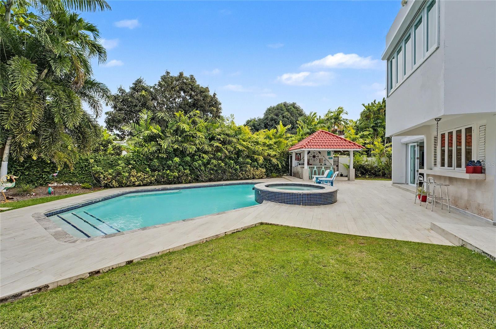 Enjoy living in this one-of-a-kind elegant residence nestled within the exclusive gated community of Santa Maria, one of the most sought-after secure enclaves within the San Juan metro area. Experience the best of two worlds at this home thoughtfully designed for large-scale living and entertaining with great presence and privacy, yet this home is also an oasis of tranquility, while being conveniently situated only about 6-8 miles from the city, Old San Juan and the beach. Spanning a grand total area of 6,250 sq.ft., this residence is designed with every detail in mind to feel like your private retreat featuring four oversized bedroom suites, each with an ensuite bathroom, in addition to a guest bedroom or office/flex room with another ensuite bath in the first floor. The house has an elegant formal living area next to a grand dining room, a modern open kitchen opening up into a Great room or family area with majestic double height cathedral ceilings all leading through tall glass doors into the terrace and outdoors. The home is a mini resort with a large fully equipped gym and an ensuite bath, a large covered terrace, a complete gazebo with a wet bar, a pool with a large jacuzzi, an outdoor full bath making this house also one for great entertaining. To complete it all, the home boasts an oversized laundry room, another large terrace on the second floor, several storage areas, 3 separate garages that can accommodate 4-5 cars, a 20kw diesel generator and 2 cisterns, electric hurracaine shutters, fiber optics, alarm, and cameras with a security system.