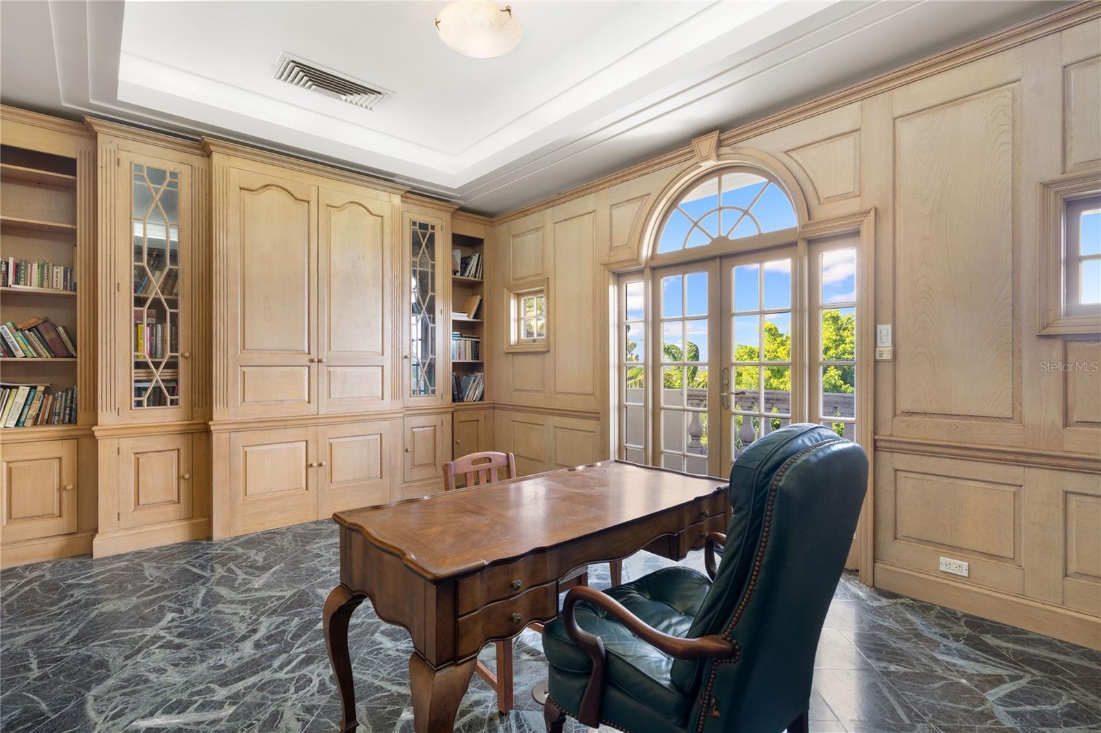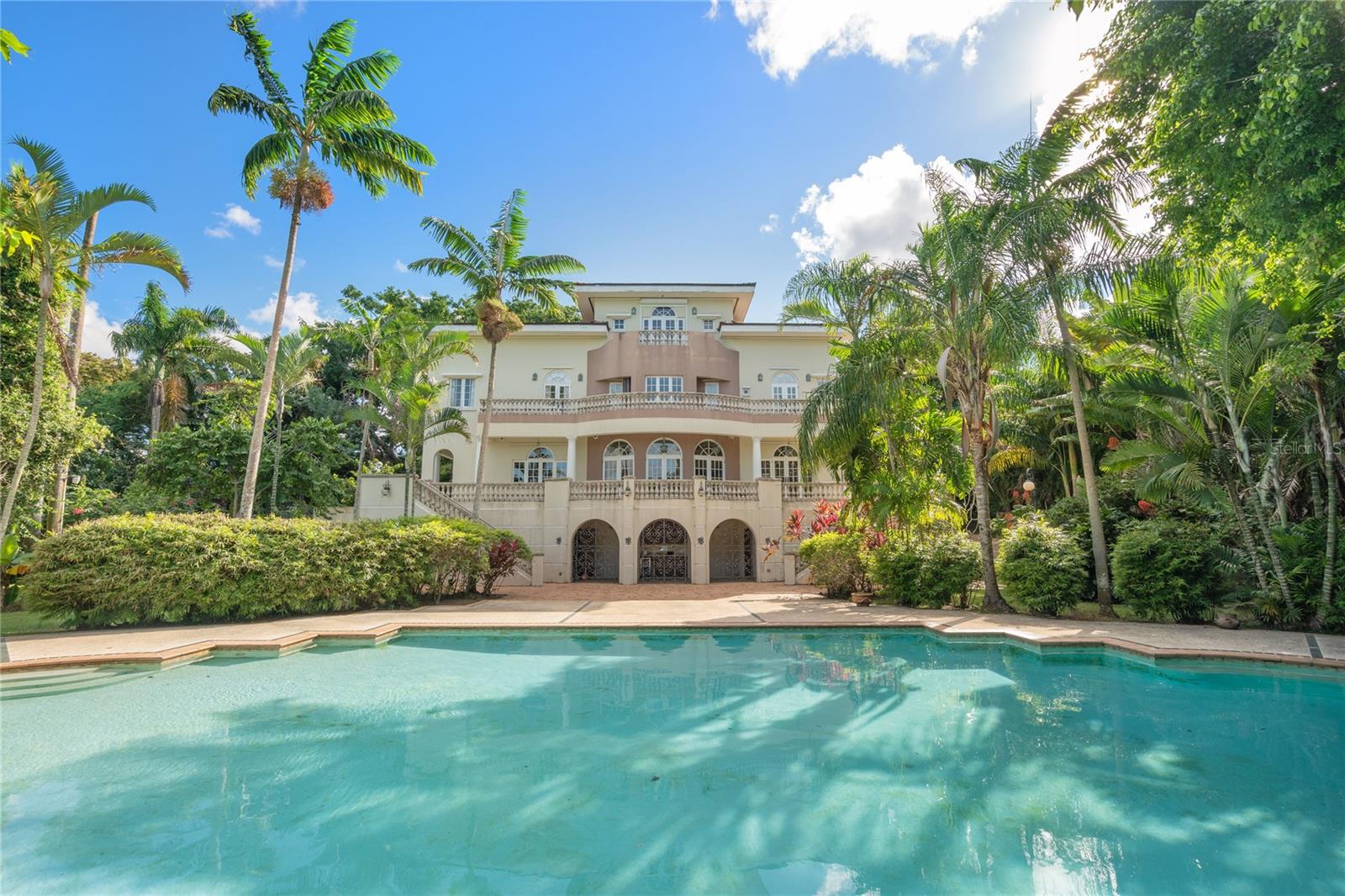 Located within the exclusive gated community of Tintillo Hills, this timeless custom-built residence offers privacy, scale, and refined living on an expansive 2.5-acre lot. The four-level estate features 11,415.24 sq ft of total construction, designed for both grand entertaining and comfortable full-time living. The main level welcomes you with a grand foyer featuring soaring ceilings and a curved staircase, filled with natural light. This level includes formal living and dining rooms, a spacious kitchen with breakfast area, family room, and a versatile billiard room. Expansive open terraces and covered porches connect the interiors to the surrounding gardens and pool, creating seamless indoor-outdoor living. The lower level offers exceptional amenities including a gym, sauna, wine cellar, full bathroom, maid’s room with en-suite bath, laundry area, extensive storage, and a three-car garage. Outdoor features include a pool, concrete terrace, manicured gardens, and a detached wood terrace with outdoor kitchen—ideal for entertaining. The second floor features four bedrooms and a family room. The primary suite includes a spa-like bathroom, dual walk-in closets, and a private balcony overlooking the pool and gardens. Additional bedrooms offer full bathrooms and walk-in closets. The third floor hosts a private office or library accessed by a spiral staircase, opening to a balcony with panoramic views extending to Old San Juan. The estate is accessed through a private gated entrance with circular driveway and includes mature trees, expansive green areas, and a tennis court ready for renovation. The property is fully equipped with an industrial backup generator and a large-capacity water cistern, ensuring uninterrupted comfort and peace of mind. Adding a unique touch of countryside charm, the grounds also feature resident chickens, embodying the essence of campo en la ciudad—country living with city convenience.
