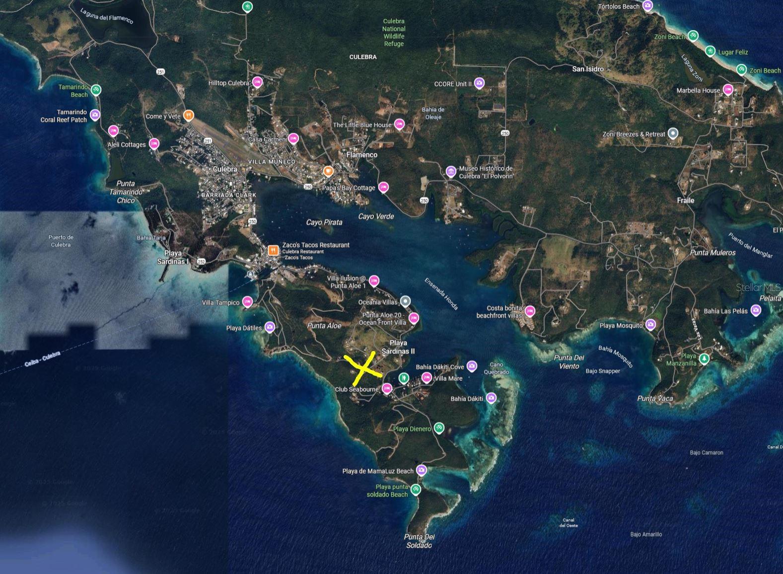 For location the property is on the South side of Culebra about 1 1/2 miles from the town of Dewey, the only town in Culebra. The town of Dewey is the center of all services offered in Culebra including, but not limited to, government services, public services, police station, fire station, public transportation, post office, schools, hospital, doctor's office, banking, churches, tire repair, gocery stores, gift shops, dive shops, watersports, water taxi tours, restaurants, nightlife, and more.