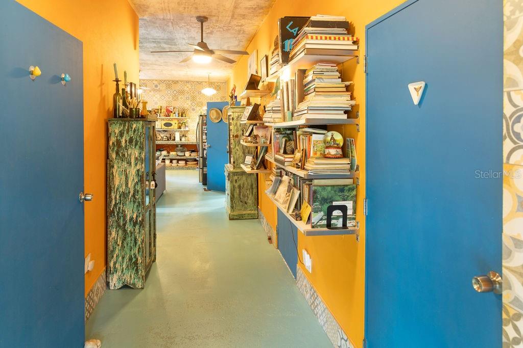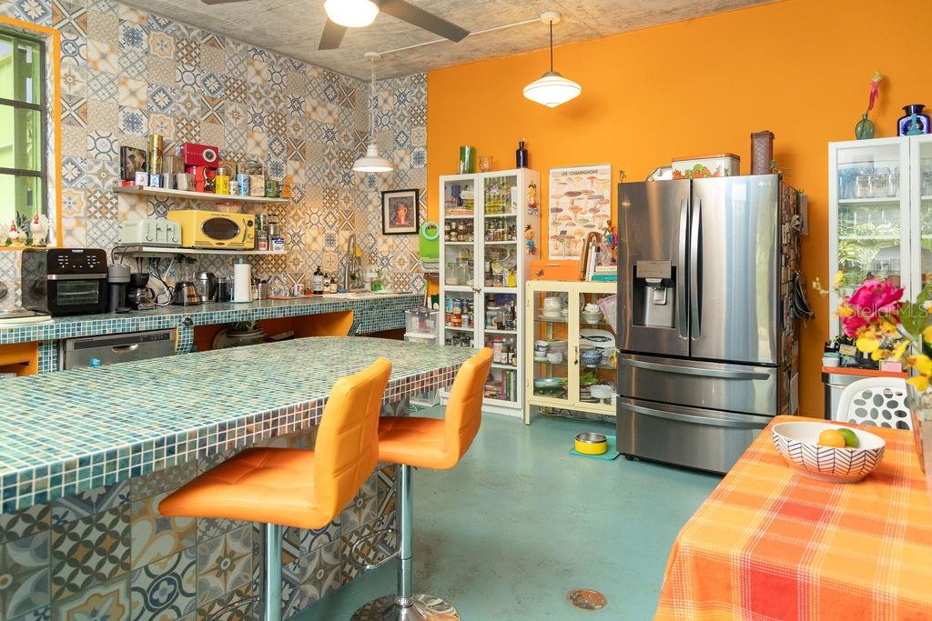 The large cook’s kitchen is as functional as it is playful, making cooking and entertaining both easy and enjoyable. The kitchen features two sinks, abundant cabinetry and storage, expansive counter space for preparation and hosting, and a central island/bar ideal for sipping martinis. The space is directly adjacent to a cozy living area making it a great space for casual gatherings or for relaxing in the evenings.
