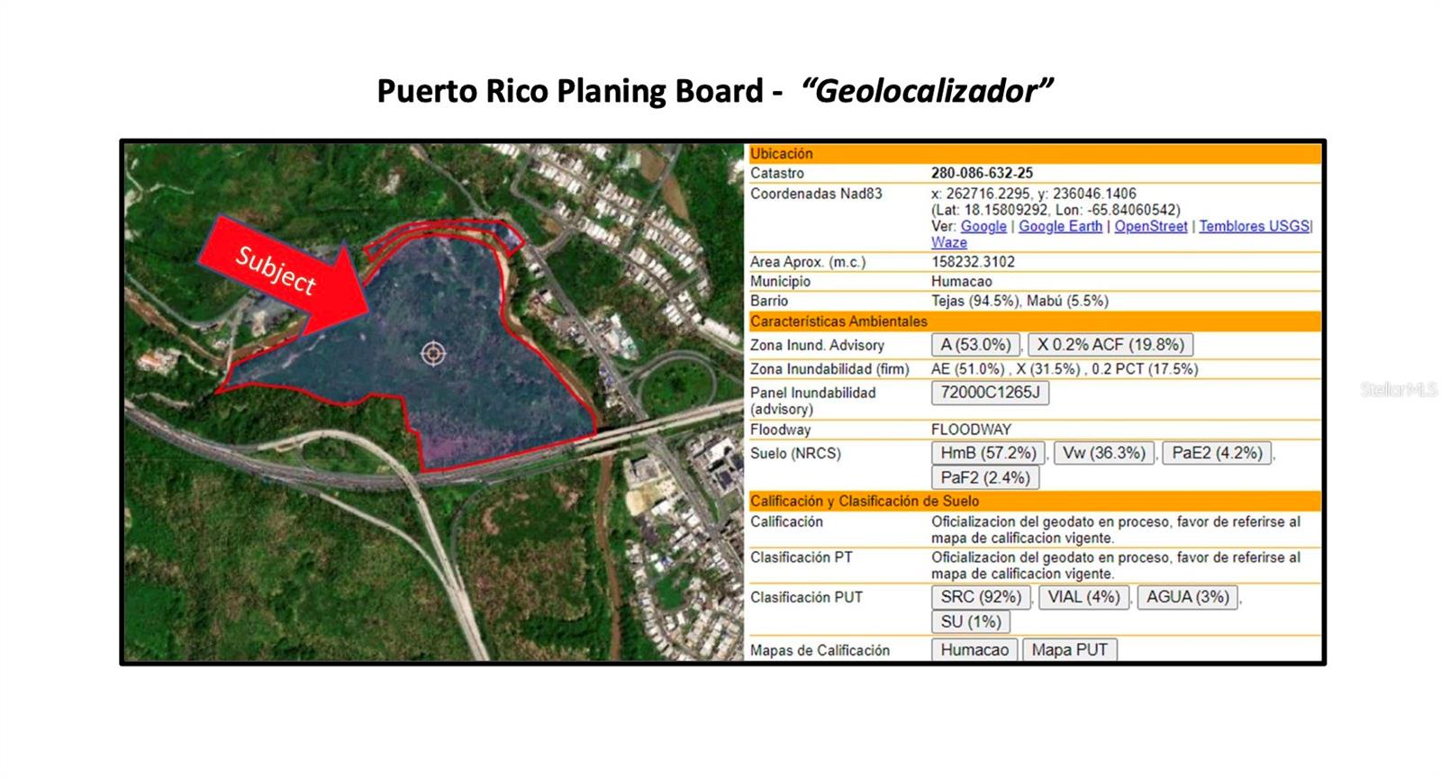 Excellent development opportunity in Humacao, Puerto Rico. This residential site is strategically located just south of State Road 198, with direct access to Expressway PR-60 in the Tejas Ward. The property features two separate entrances, offering added flexibility for future development or subdivision. It is conveniently situated near Ryder Hospital, shopping centers, and various governmental and institutional facilities, making it ideal for residential development. Zoned RI (Intermediate Density Residential), the site spans 39.3672 cuerdas and includes areas within FEMA flood zones AE (51.0%) and X 0.2 PCT (51.30%), as per FEMA Flood Map Panel 72000C1265J. Coordinates are 18.15809292 latitude and -65.84060542 longitude. The property is identified by Tax ID No. 280-086-632-25-000. This is a prime investment opportunity in a high-demand area with strong development potential.