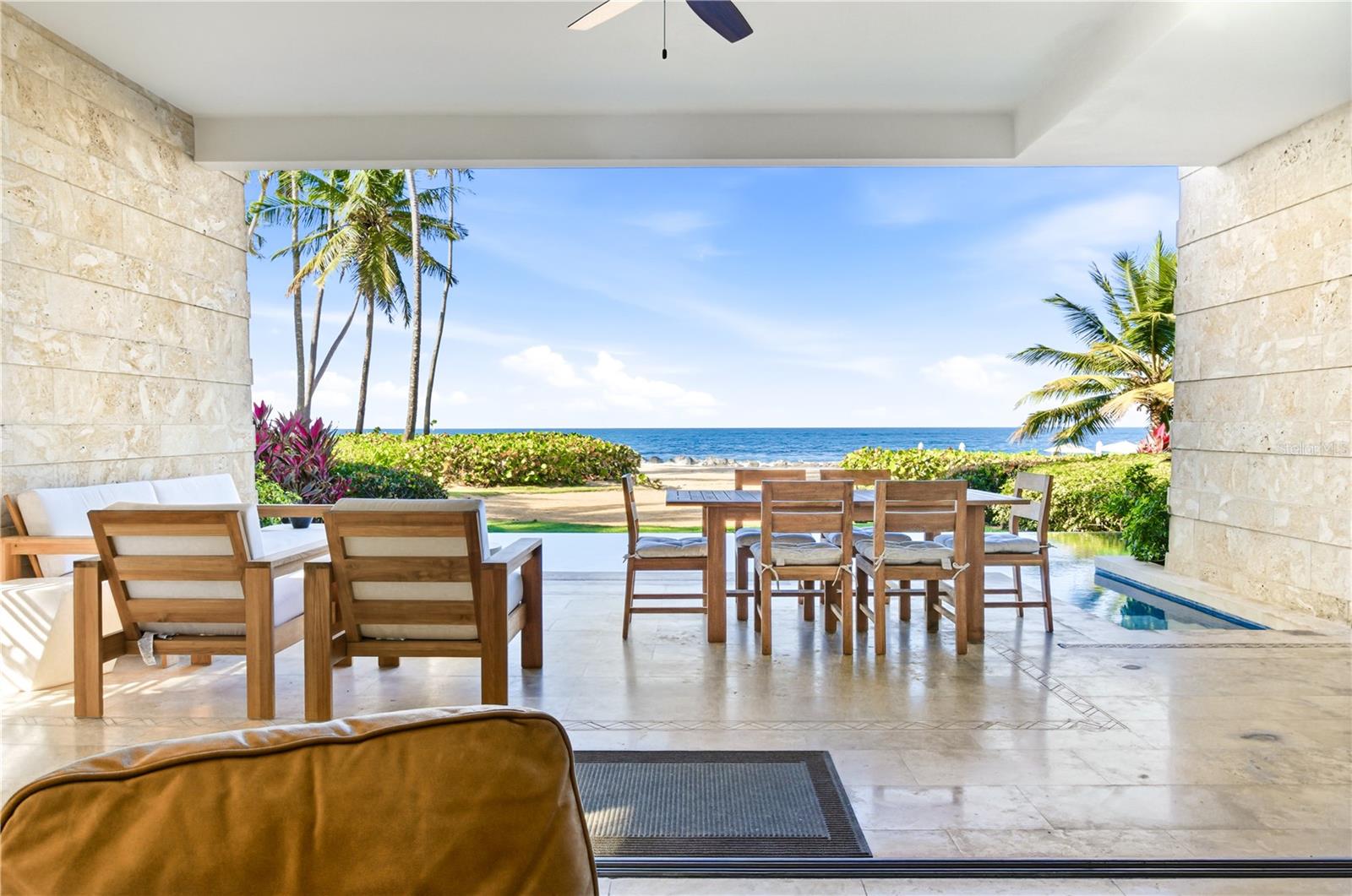 Featuring two oversized bedrooms plus a powder room, the open-concept great room seamlessly connects the gourmet kitchen, dining area, and spacious living room. Floor-to-ceiling sliding doors frame sweeping ocean views and open directly to your private terrace, infinity-edge pool, and the beach just steps away.