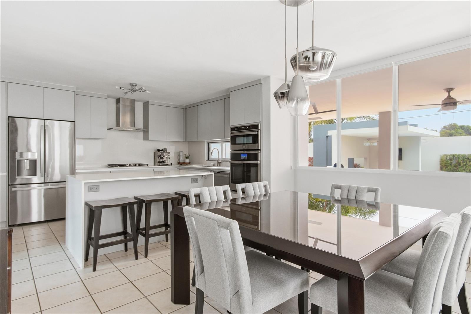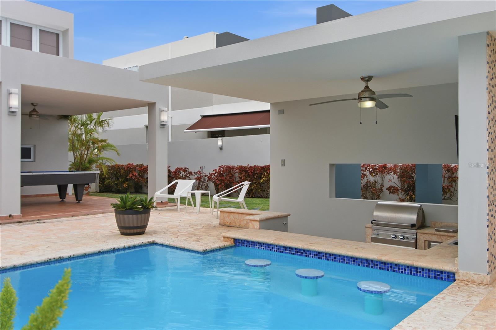 Primary residence located within the gated, family-oriented community of Villas de la Playa in Vega Baja, just a short walk from the beach. The residence is defined by a thoughtfully composed layout where expansive windows frame the pool, allowing natural light to permeate the family room and kitchen while maintaining a constant visual connection to the outdoors.