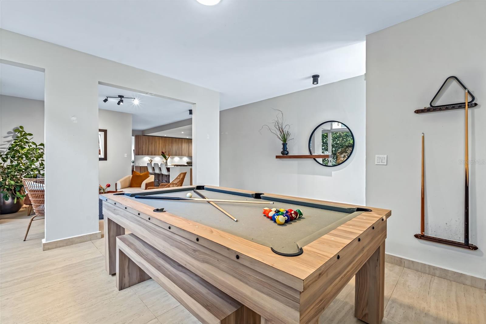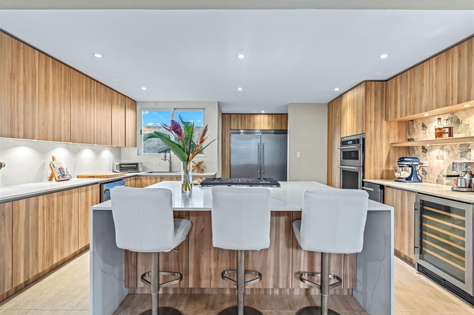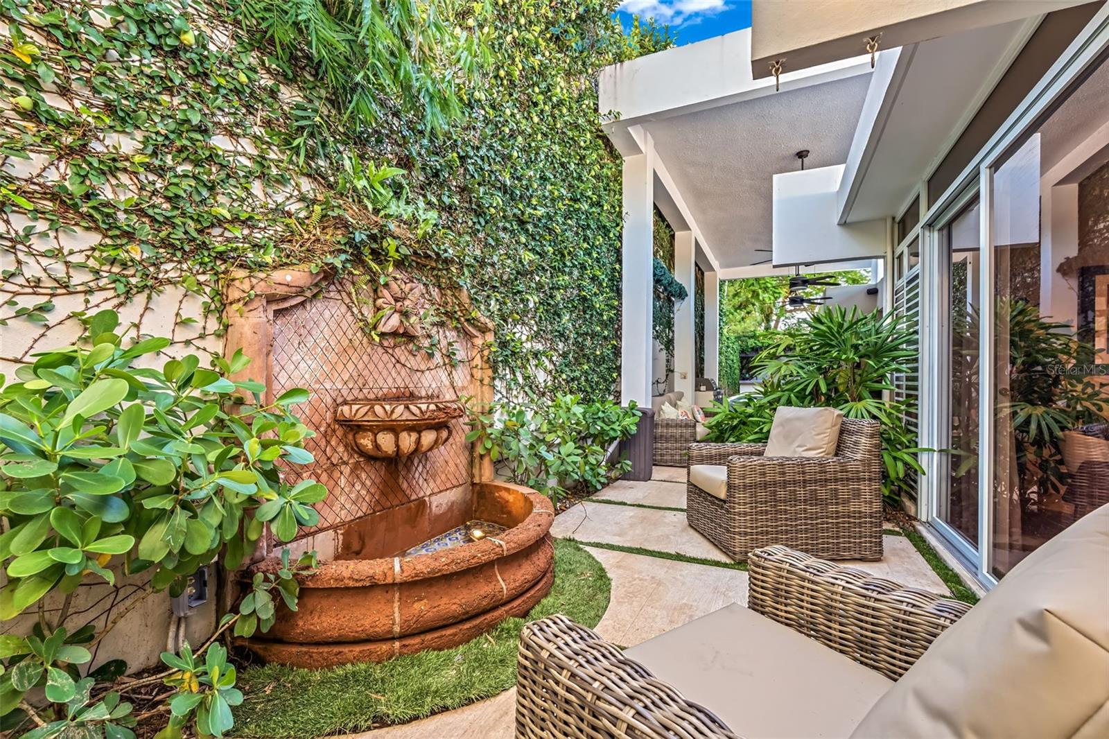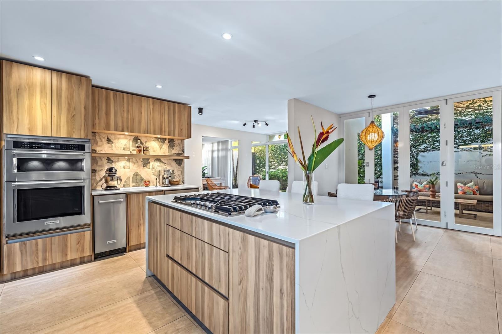 The spectacular outdoor space features a heated pool with lounge area, an outdoor kitchen, and terrace —your own secluded retreat.