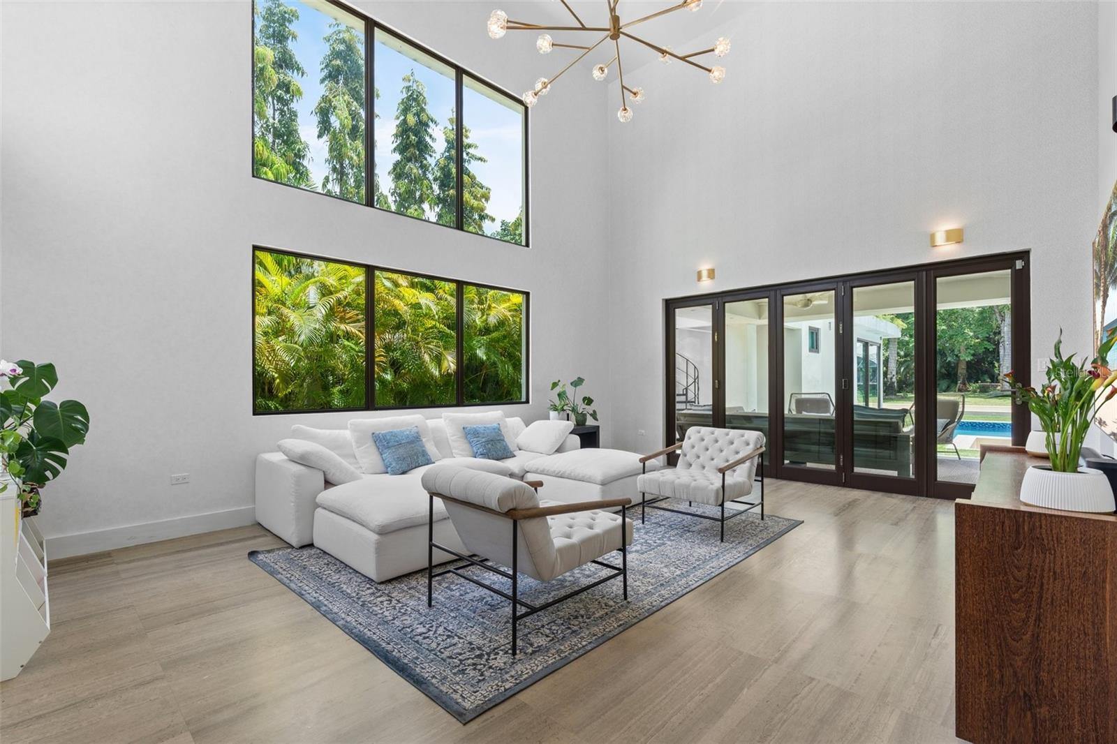 The main living areas open naturally toward the outdoor spaces, where a squared pool with clean architectural lines creates a private setting for relaxation after the beach or evening gatherings outdoors.