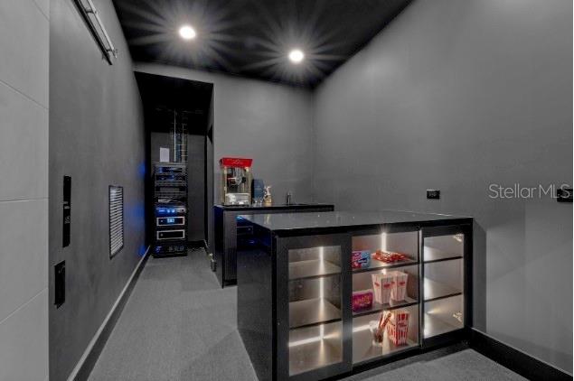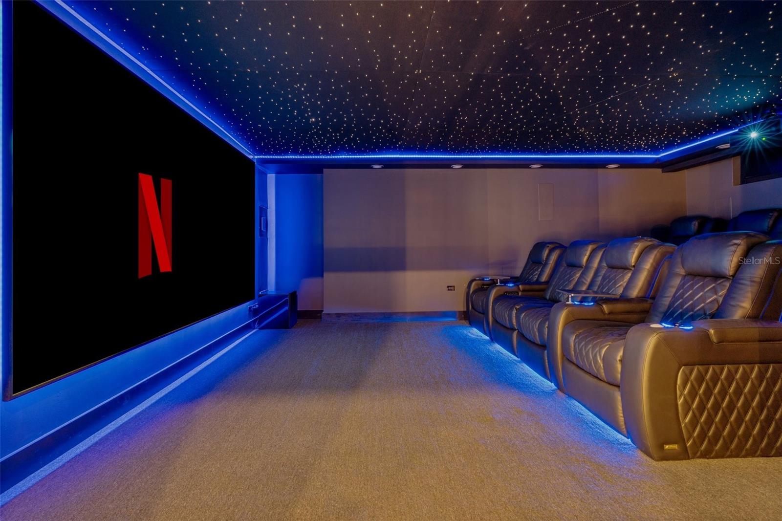 The kitchen is expansive and functional, with a substantial walk-in pantry designed to accommodate full-time living and entertaining. A dedicated cinema room with custom starlit ceiling and a separate game room provide additional interior spaces designed for comfort rather than excess.