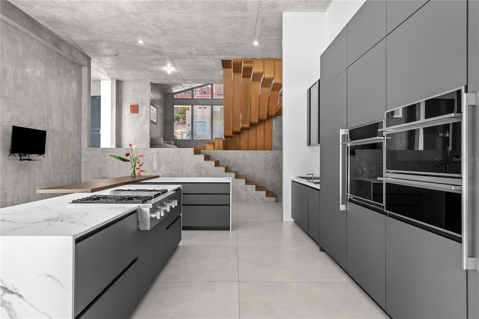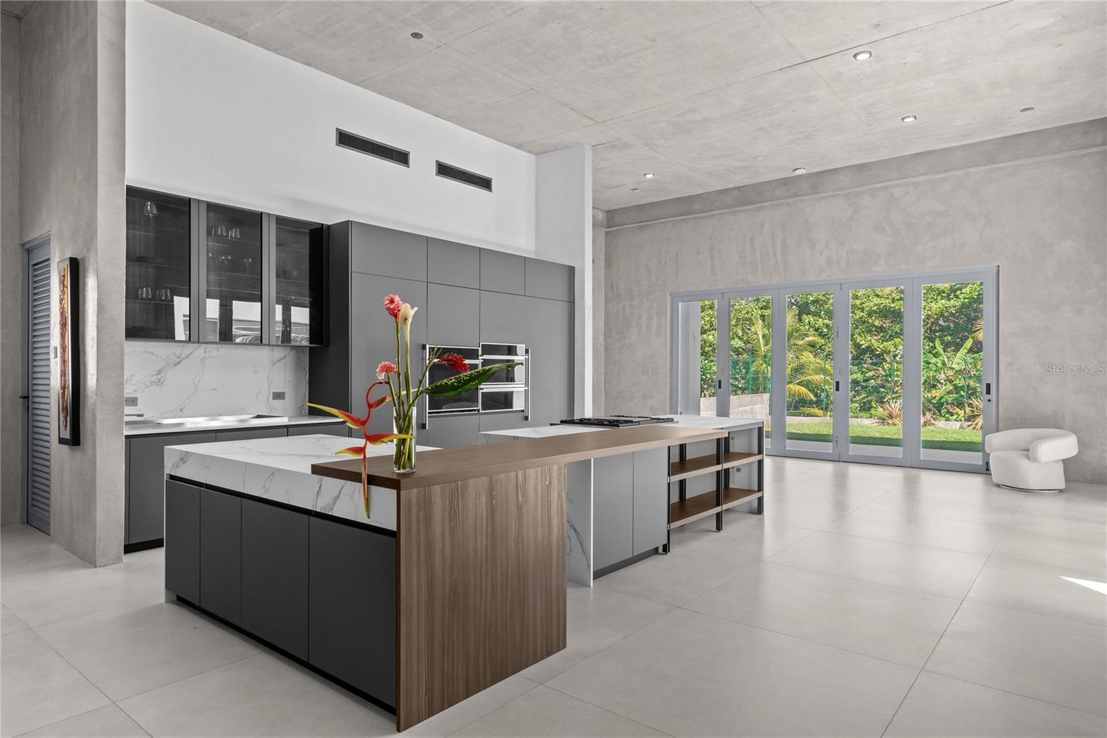 Inside, double-height volumes wrapped in glass invite shifting light to animate raw concrete surfaces throughout the day. A sculptural natural wood staircase rises as a focal counterpoint, softening the structure’s material rigor. The kitchen, conceived as an integrated architectural element rather than a decorative feature, pairs paneled appliances with porcelain slab countertops in a subdued palette that complements the home’s geometry.