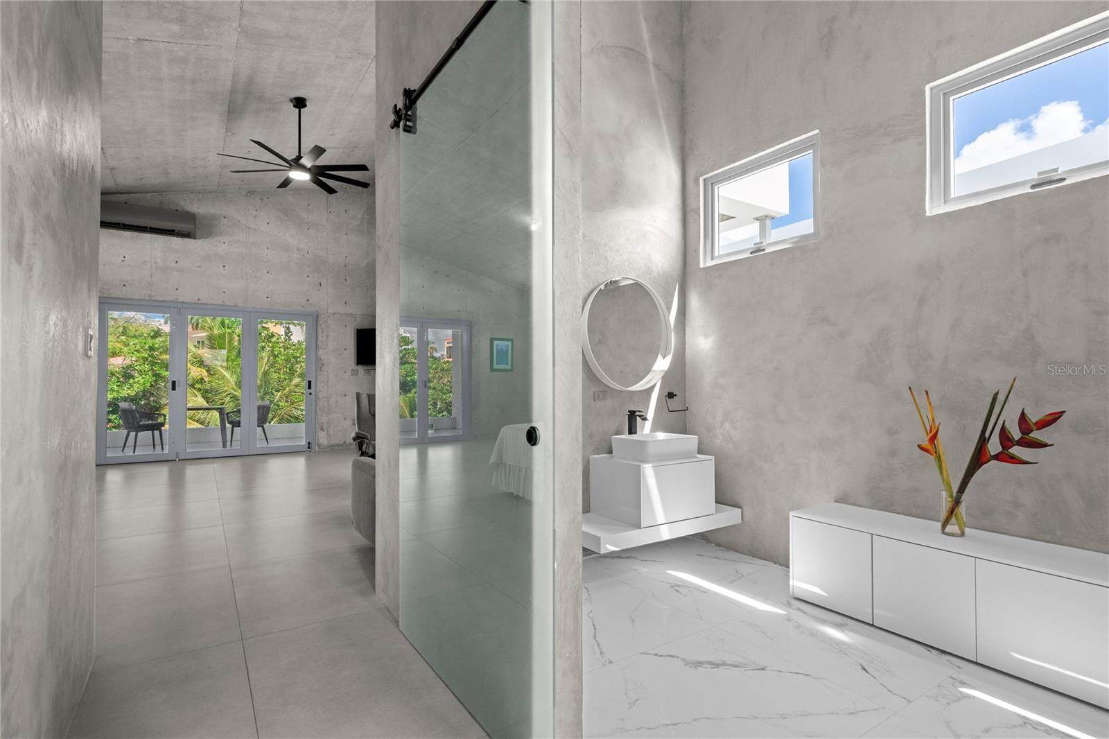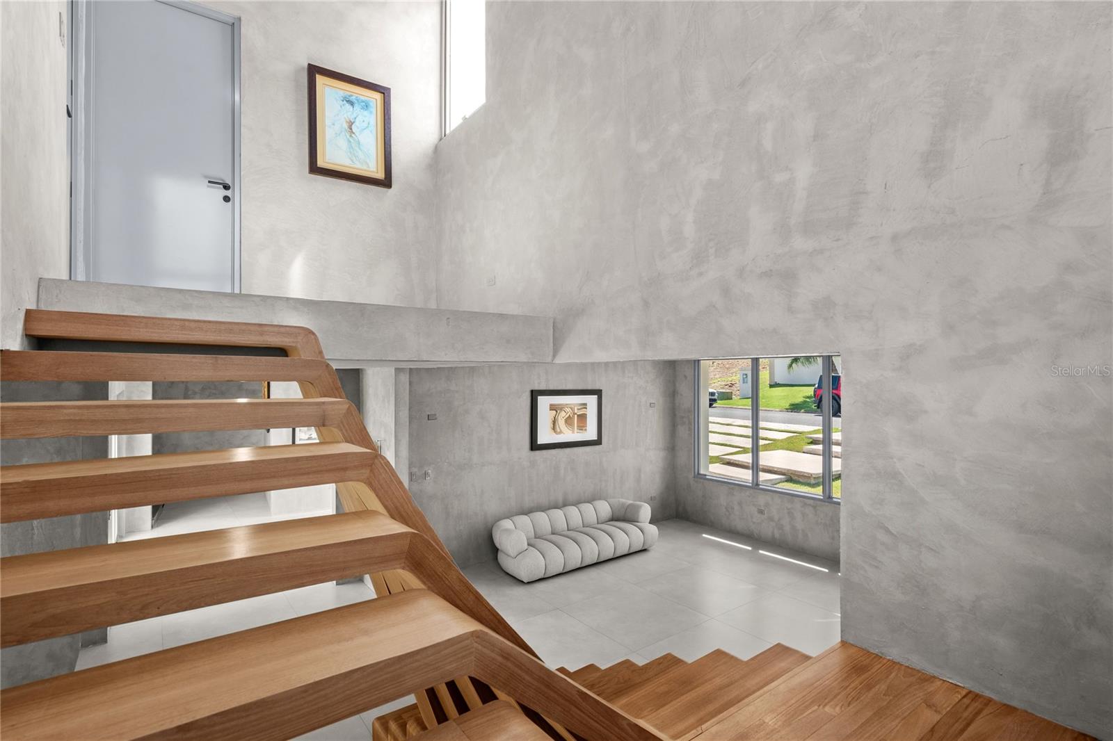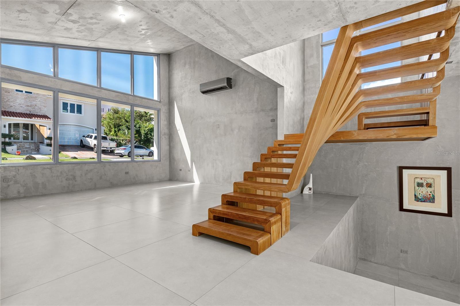An exercise in tropical modernism with restrained brutalist undertones, this beach-adjacent residence in Surfside at Palmas del Mar was conceived with a clear architectural point of view. Exposed concrete, natural wood, stone, and expansive glass form a composition that is intentional, textural, and quietly powerful.