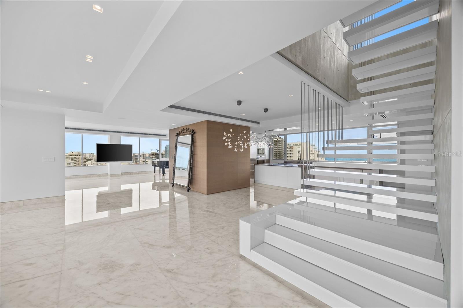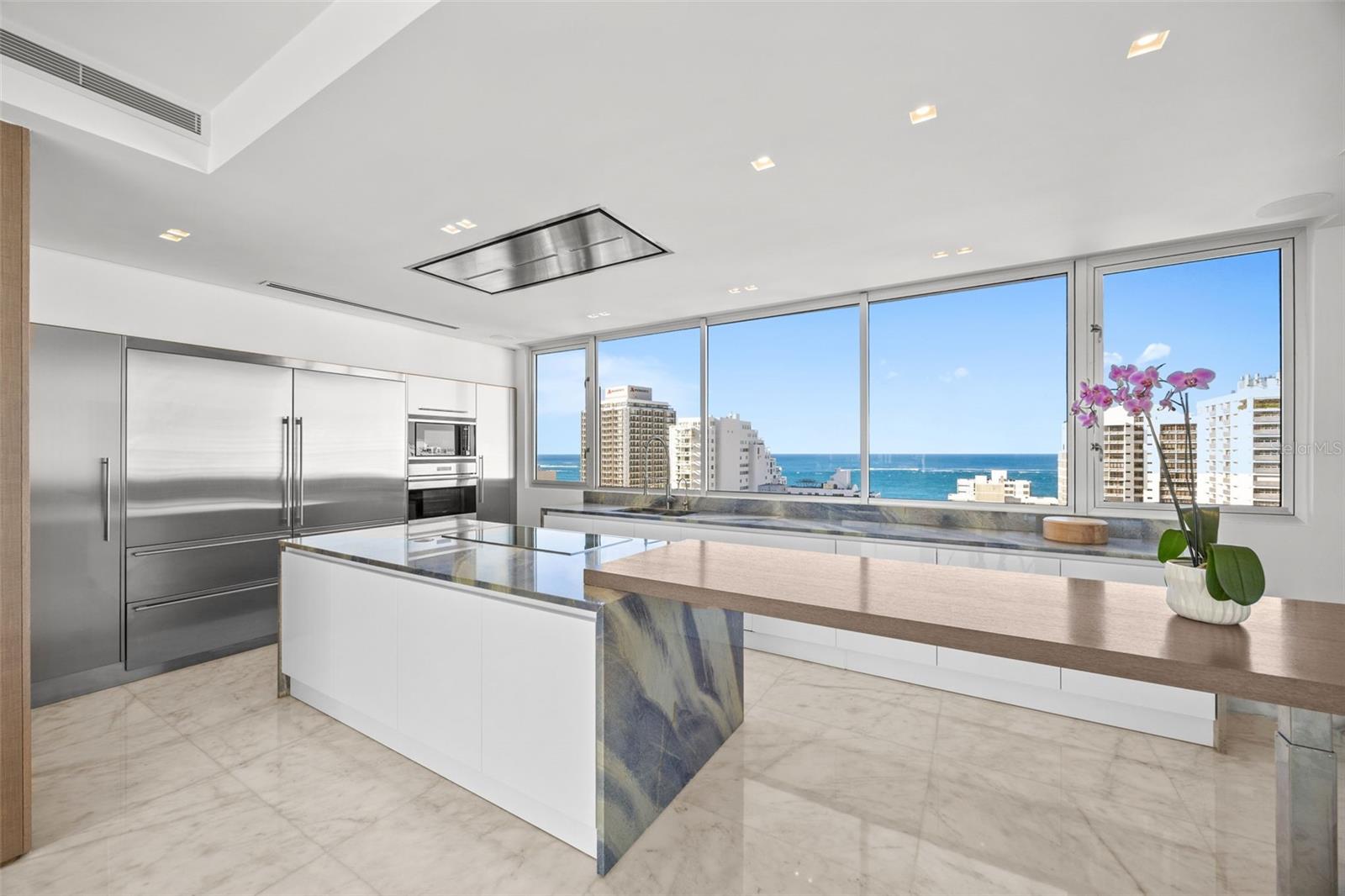 At the center of the residence, a bespoke Copatlife kitchen—appointed with Miele, Wolf, and Sub-Zero appliances—anchors the living spaces with quiet sophistication and architectural presence. Floor-to-ceiling openings frame sweeping ocean and city vistas, while natural light moves effortlessly across the interiors. Automated window treatments and a fully integrated lighting system allow for precise control of ambiance throughout the day and evening.