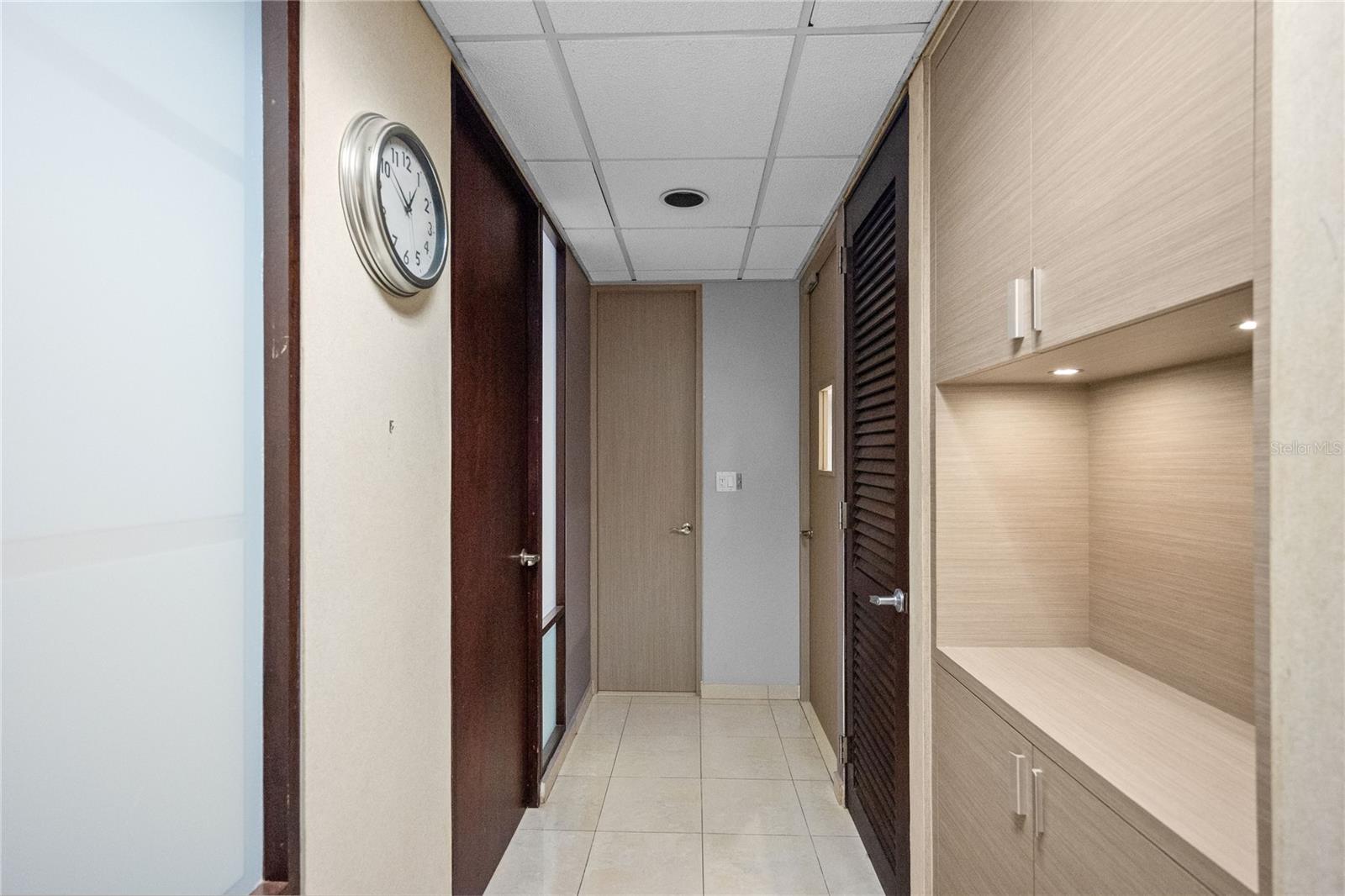 This 733-square-foot suite has been thoughtfully remodeled with a clean, contemporary aesthetic, featuring white paneled walls, light wood finishes, recessed lighting, and central air conditioning, creating a bright and polished work environment ready for immediate occupancy.