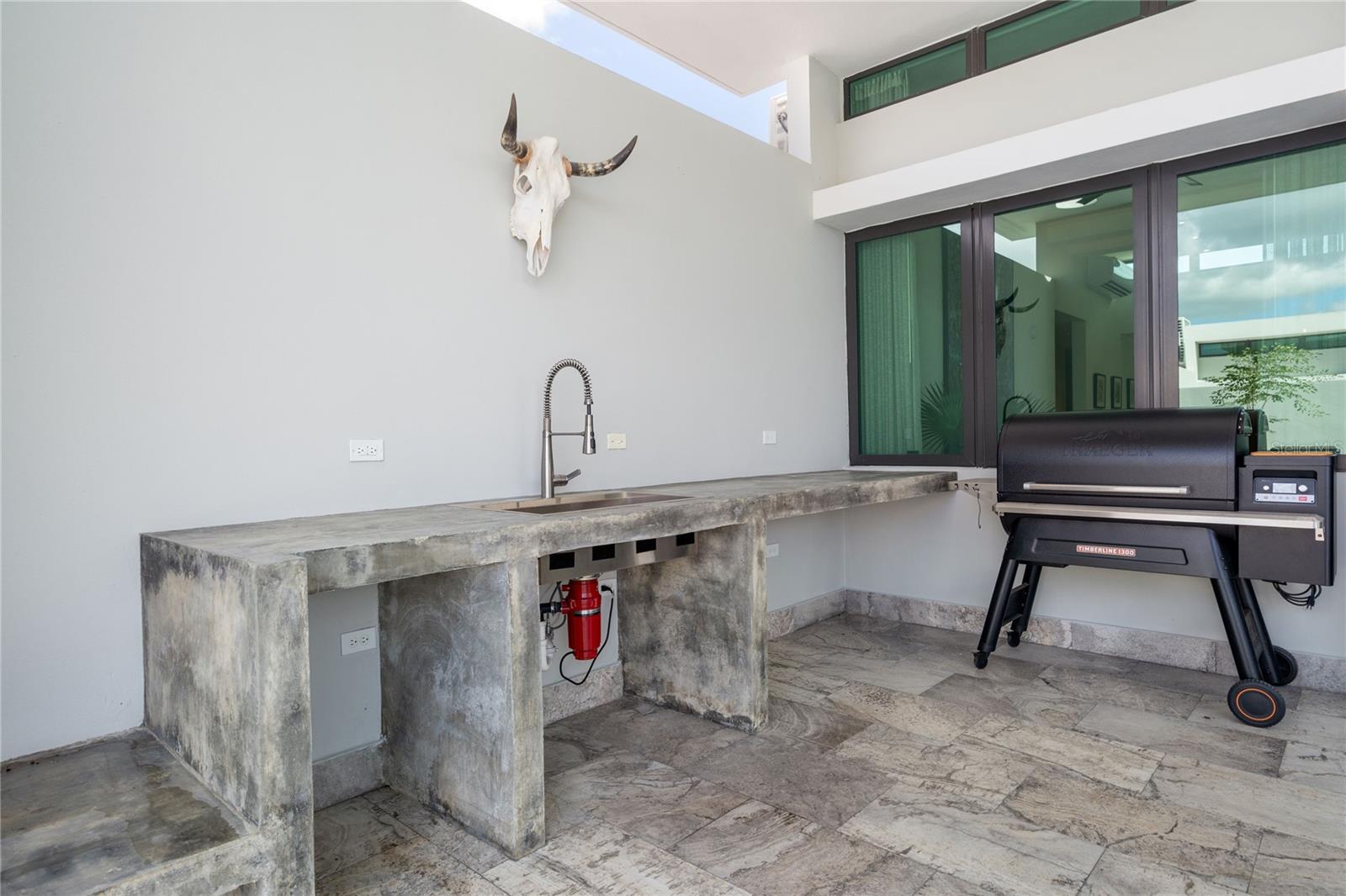 The property sits on a 512 sq m lot and features a beautifully arranged terrace area with a heated saltwater pool, outdoor shower, and outdoor half bathroom, creating an ideal setting for entertaining and relaxed outdoor living. The kitchen is appointed with Monogram appliances and connects seamlessly to the main living areas.