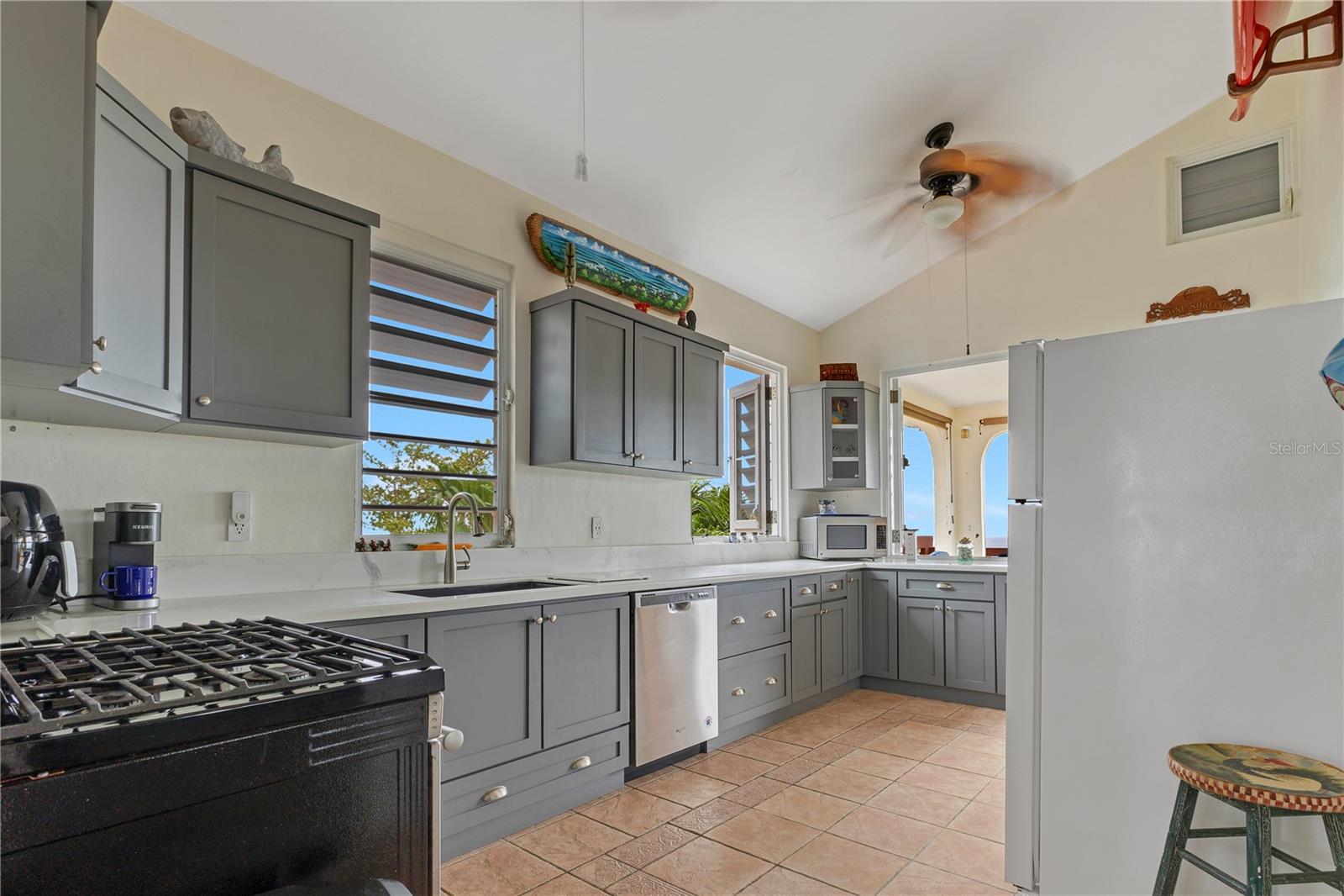 The kitchens are designed with French-style windows that invite a constant ocean breeze, complemented by high ceilings throughout that enhance airflow and natural light. The property also includes an electric vehicle gate entrance, adding security and ease of access.