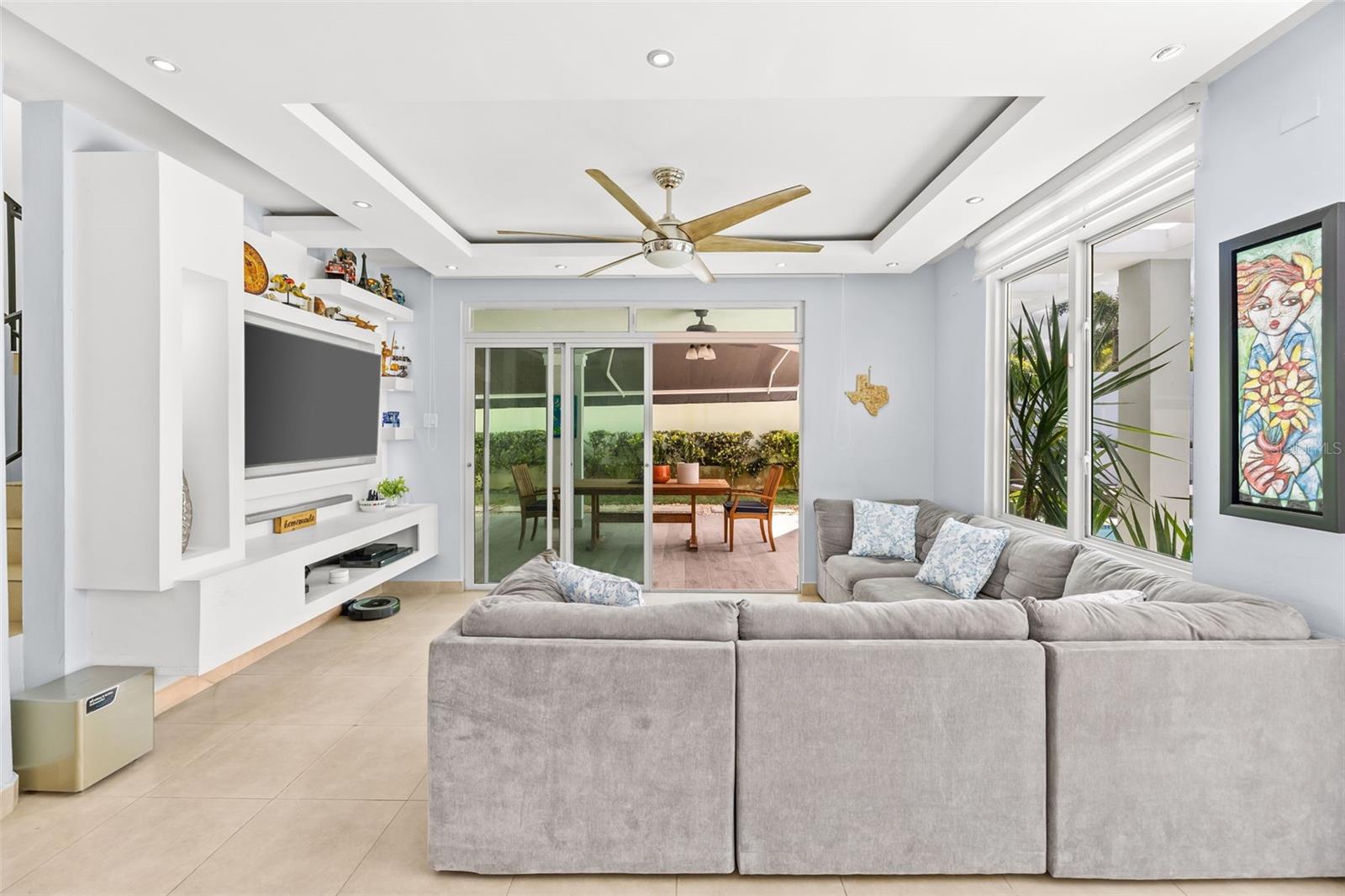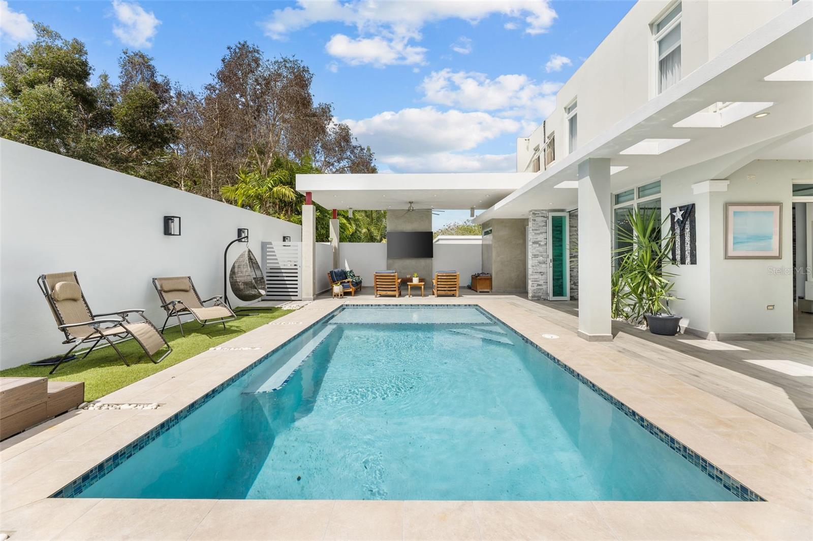 Outdoors, the property transforms into a private resort-style retreat. A covered terrace, pre-wired for music and entertainment, sets the perfect ambiance for gatherings both lively and serene. The 5.5-foot-deep pool invites relaxed afternoons under the Caribbean sun, while a private putting green adds a distinctive touch rarely found — designed for both leisure and lifestyle.