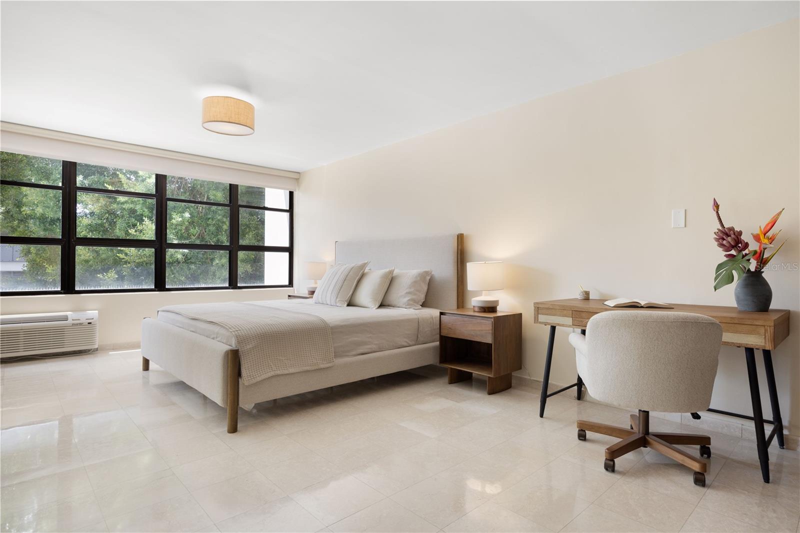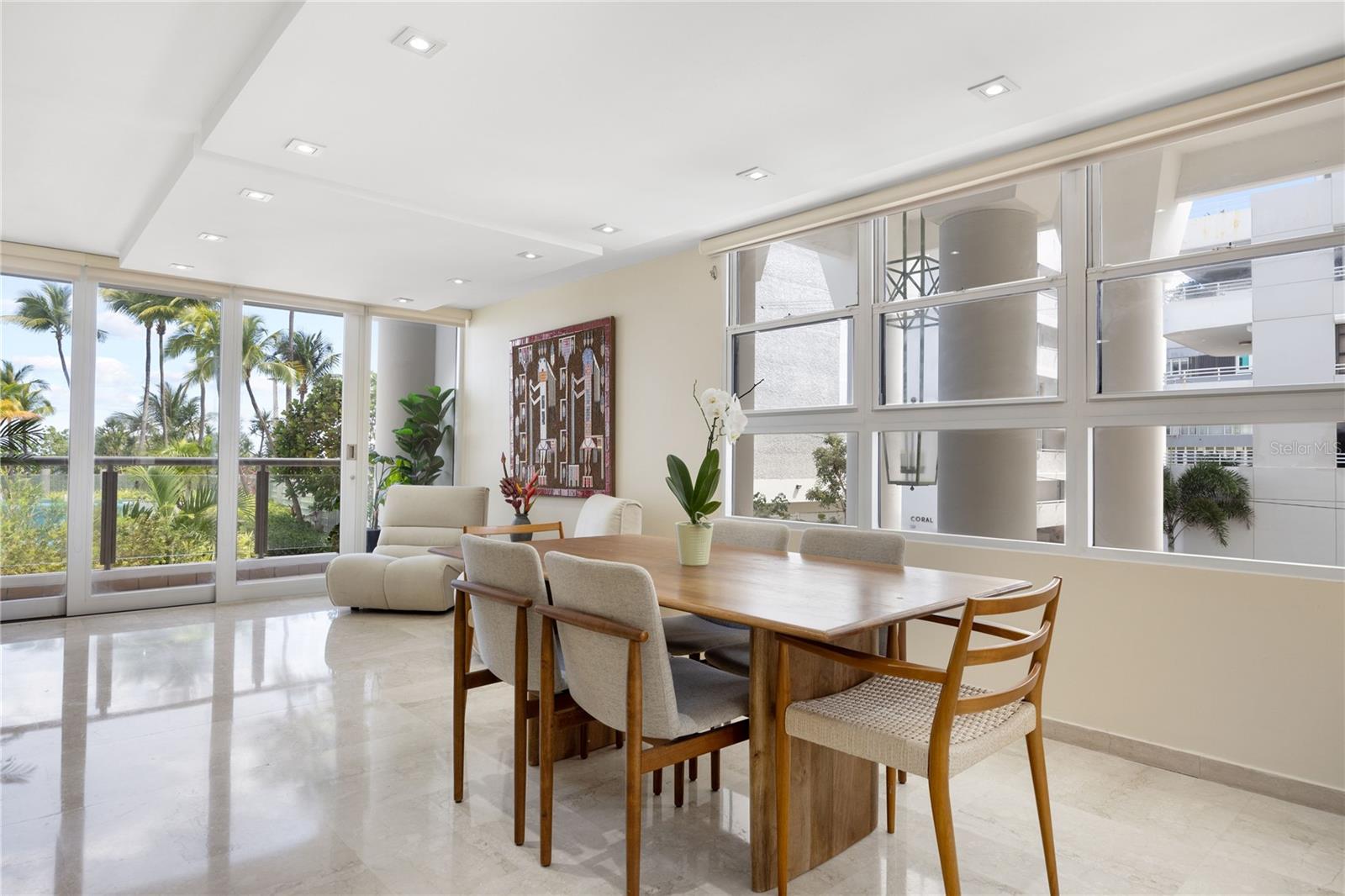 The main living area has been outfitted with a brand-new sectional sofa and high-tech frame TV. Set along a wall of windows, the dining area is thoughtfully located at the center of the home. A secondary sitting area features brand new lounge chairs and a distinctive bar cabinet, making this the ideal spot for morning coffee or evening drinks. Brand-new, white windows and doors have been installed across the entire living and dining area. Sliding doors stack together on either side to reveal a charming balcony with front-row views of the impeccably maintained condominium grounds, partial views of the Atlantic Ocean, and a lively palette of green and blue hues. LED recessed lighting and polished marble floors exude elegance throughout the home.