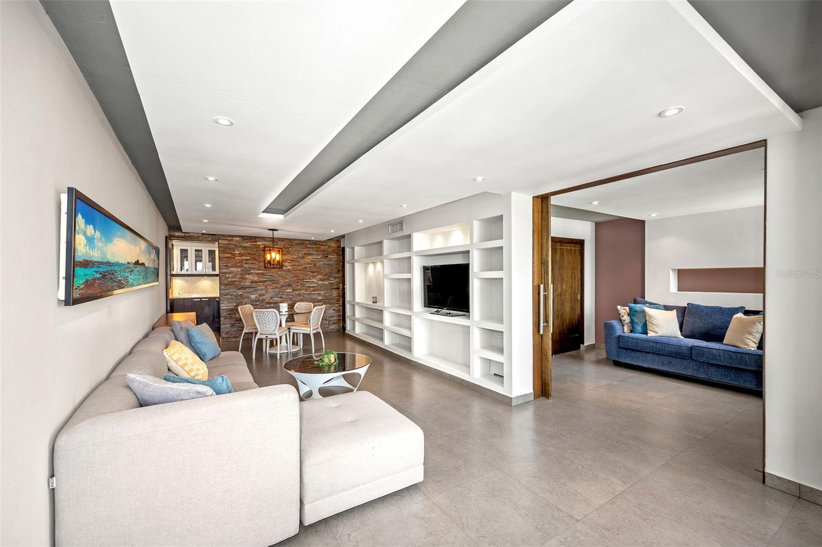 Custom shelving and an integrated entertainment unit enhance the warm and functional living area, creating an ideal setting for everyday living or hosting guests.