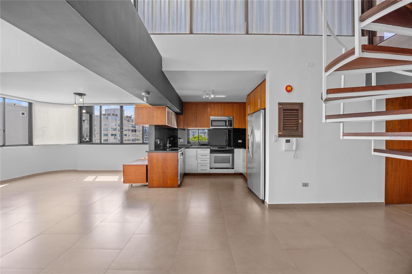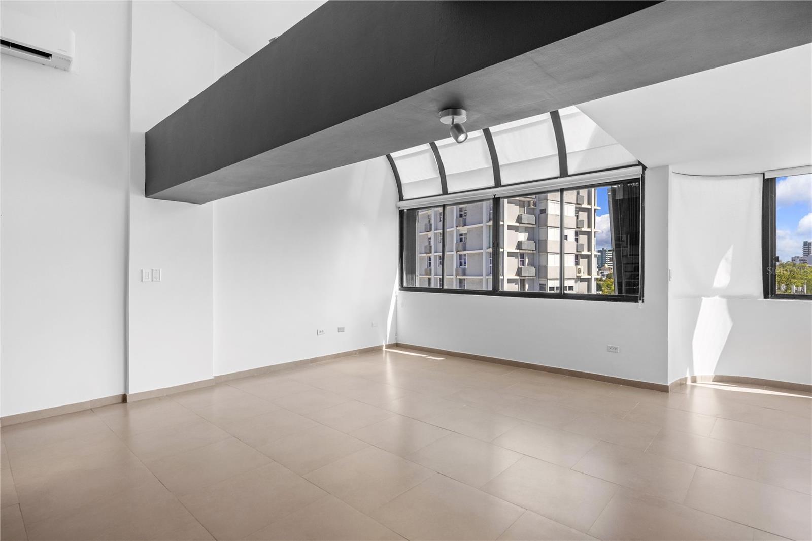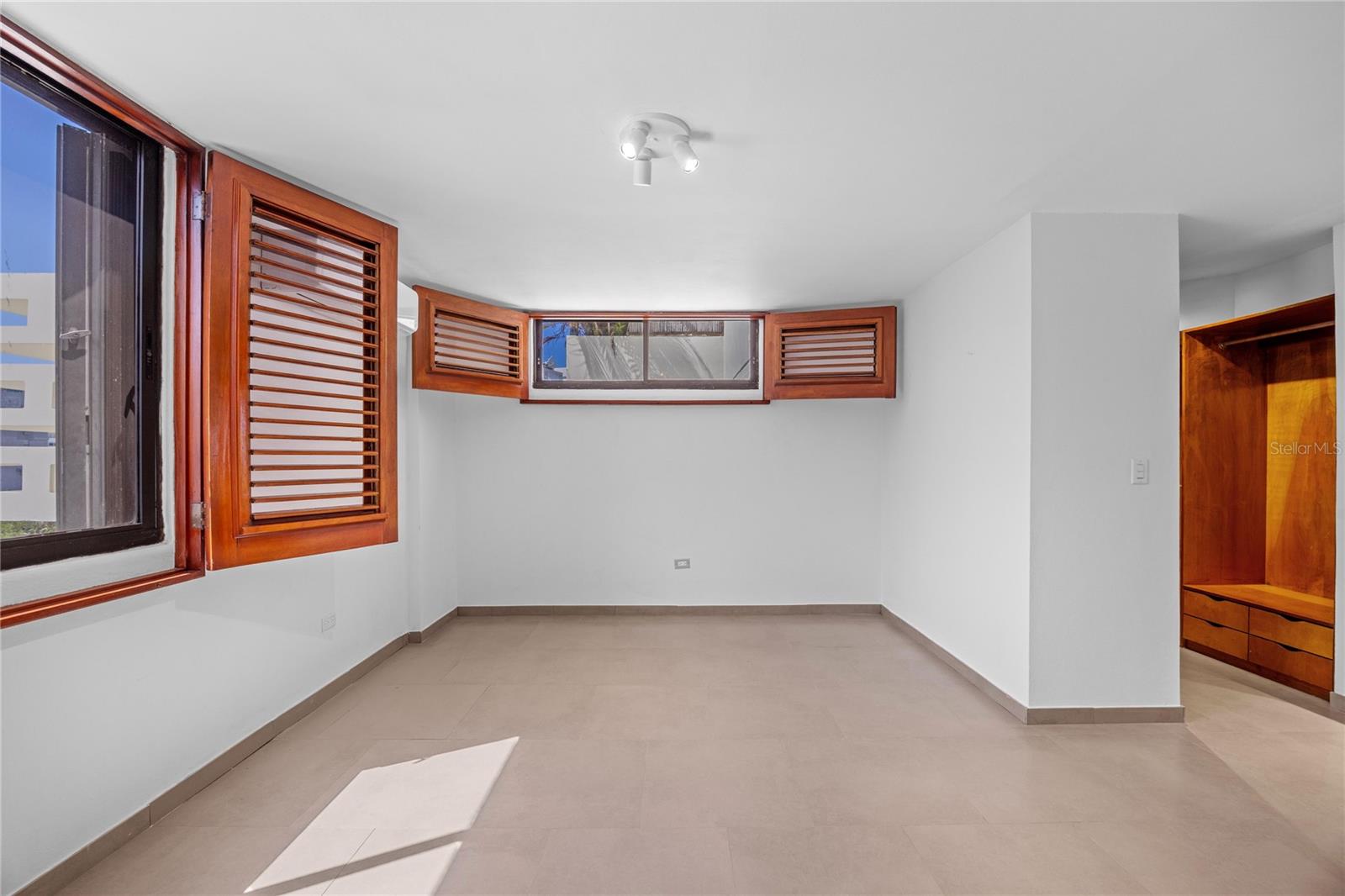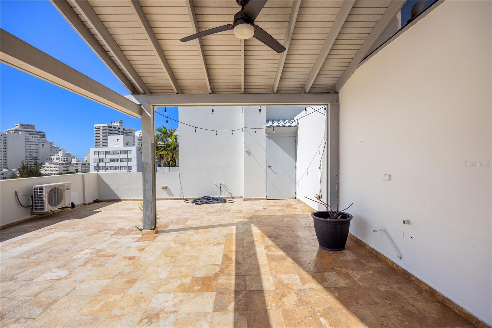 The second level features an expansive terrace—an exceptional rarity in Condado—offering both covered and uncovered areas. The covered portion can be easily enclosed to create an additional bedroom, office, or expanded living space. The open-air terrace provides a private retreat in the heart of the city, ideal for entertaining or creating a personal wellness space.