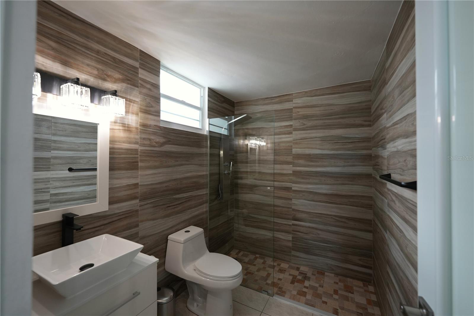 The first level features the living room, dining area, remodeled kitchen, family room or home office, half bath, and interior laundry near the carport access. The updated kitchen includes matte-finish cabinetry, quartz countertops, waterfall-style center island, porcelain backsplash, gas range, and stainless steel appliances. Bathrooms were remodeled with wood-look tile finishes, and glass-enclosed showers. The primary bathroom features a double vanity and shower panel.