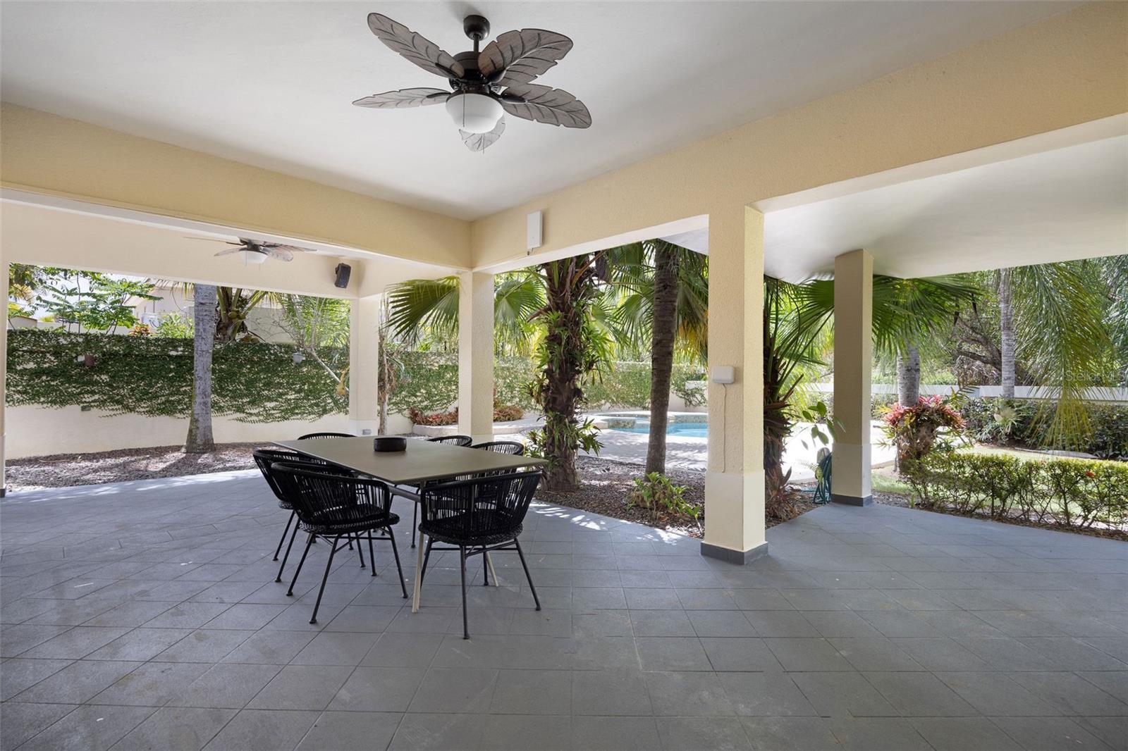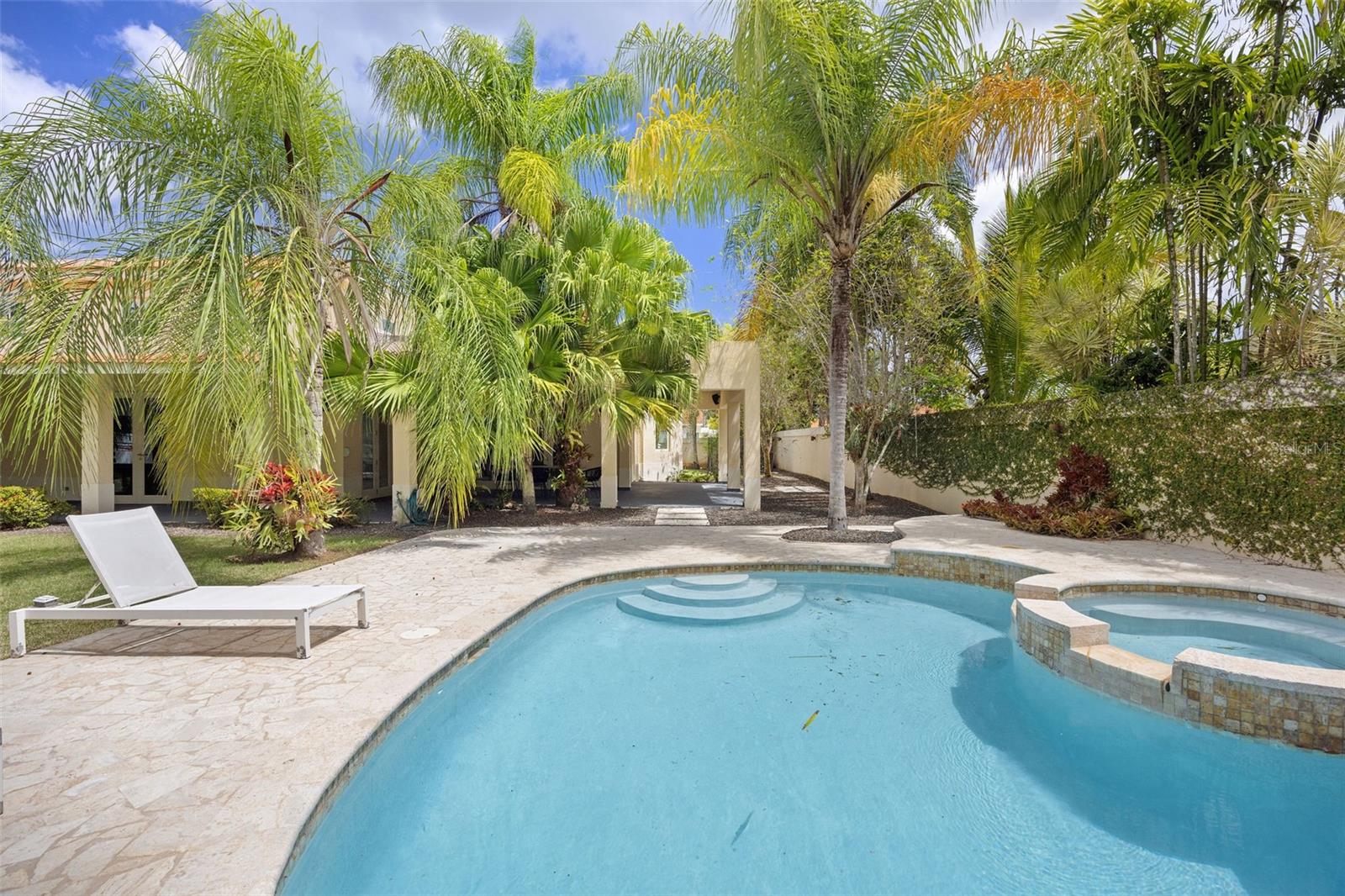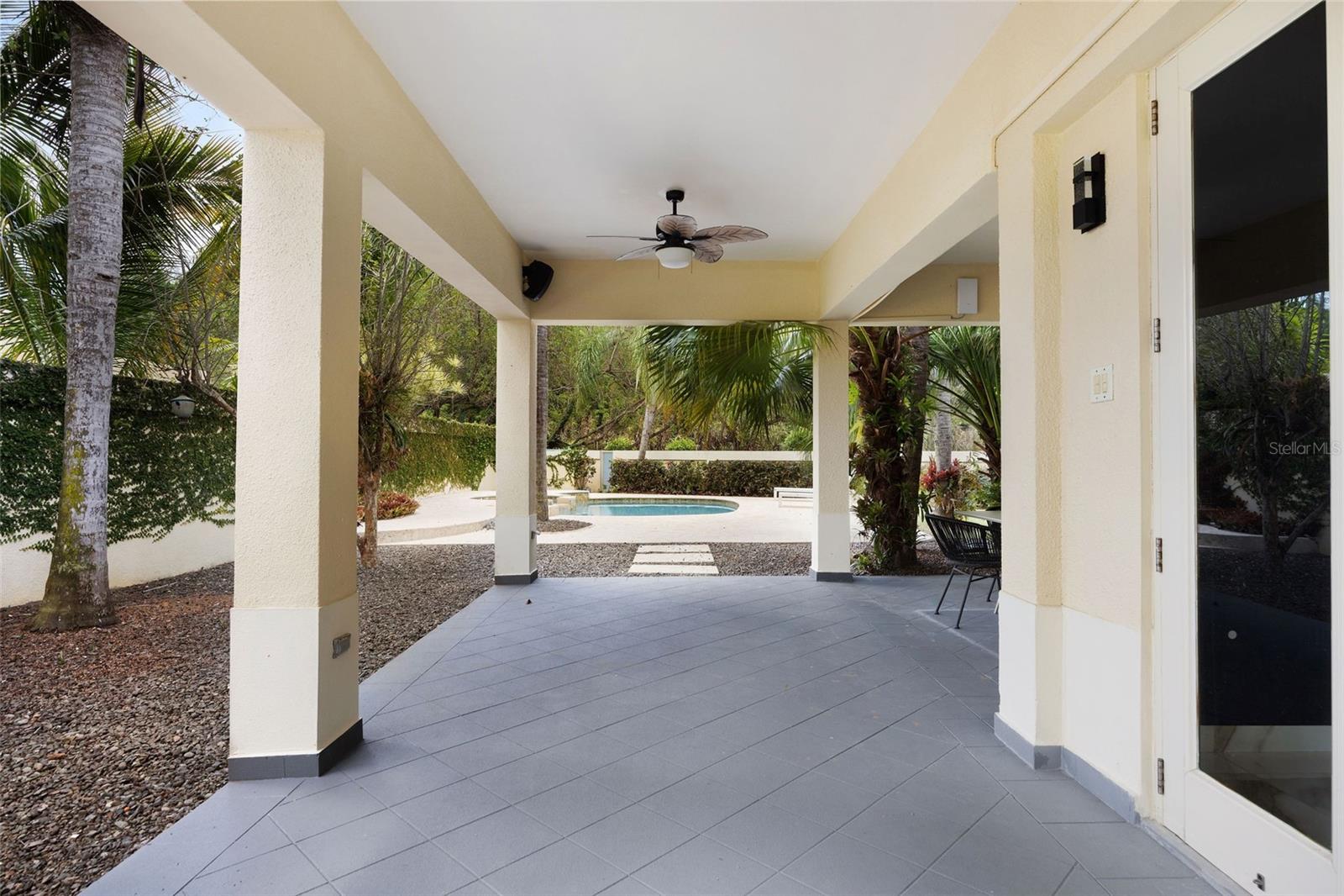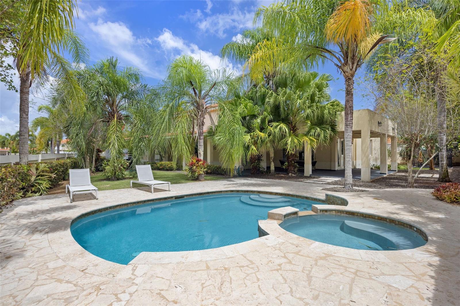 The outdoor area is truly a private oasis. Surrounded by lush tropical landscaping and mature palm trees, the backyard showcases a resort-style pool with an integrated spa, perfect for relaxing or entertaining. A covered terrace offers an ideal setting for al fresco dining, complete with ample space for gatherings while enjoying the serene surroundings.