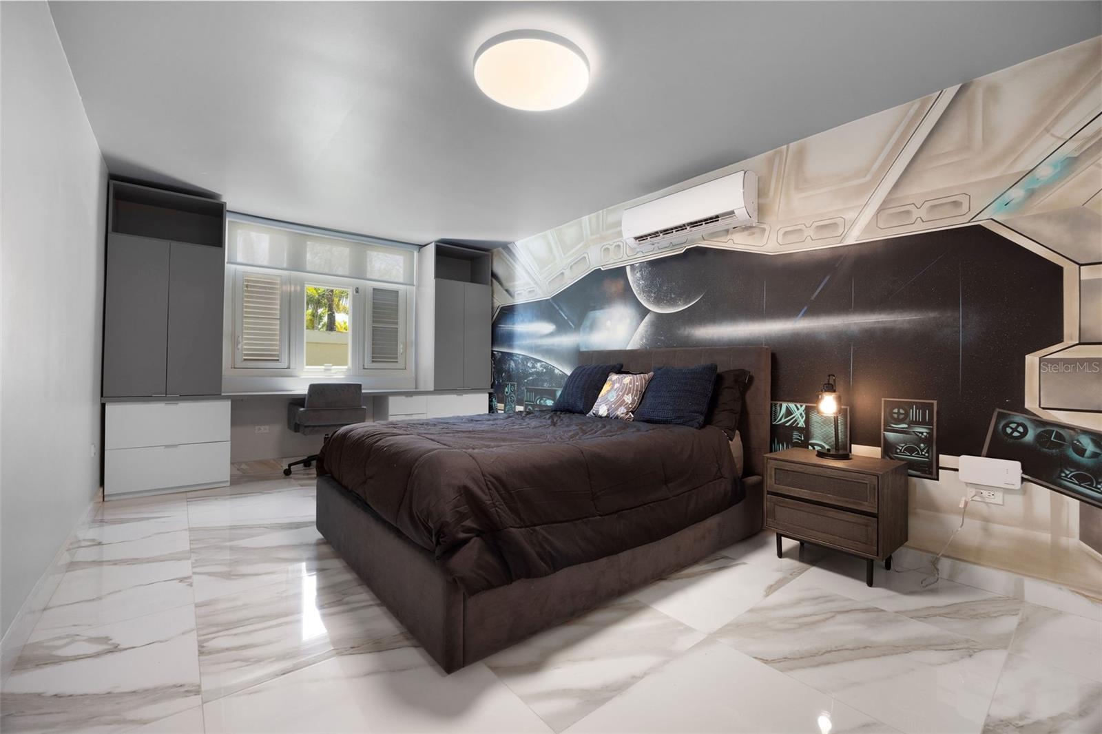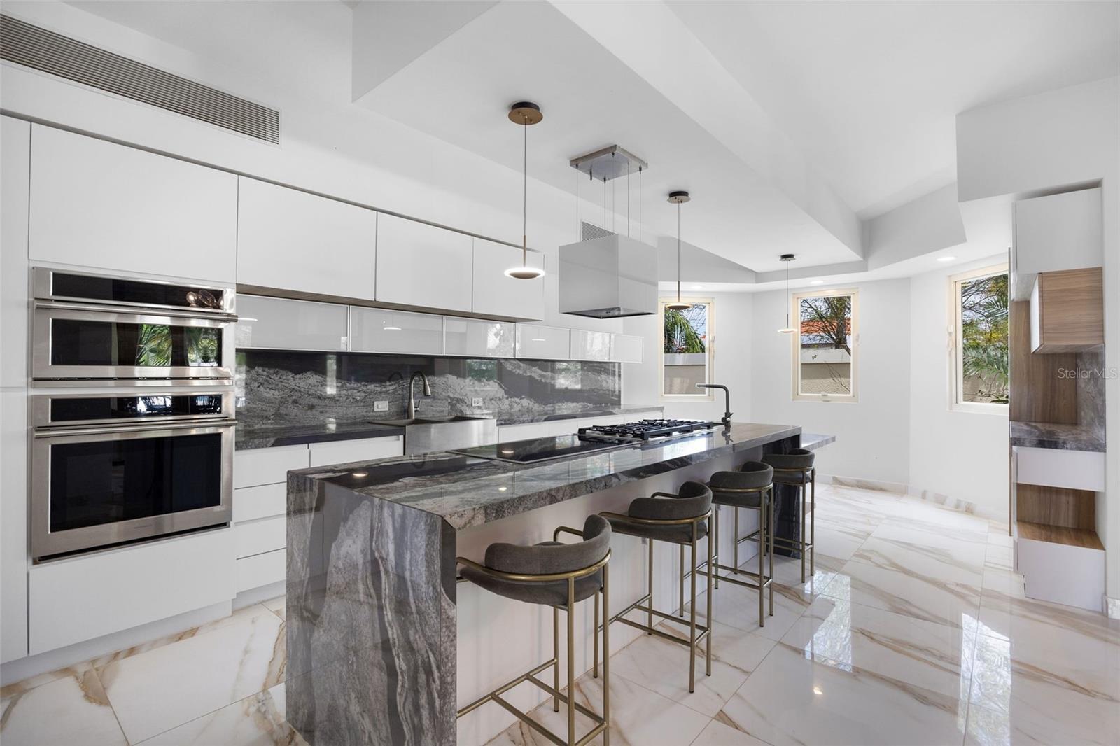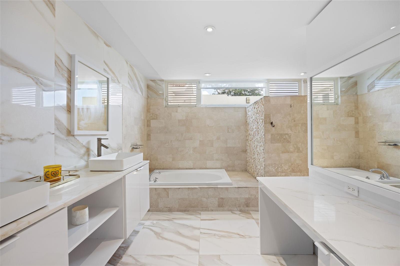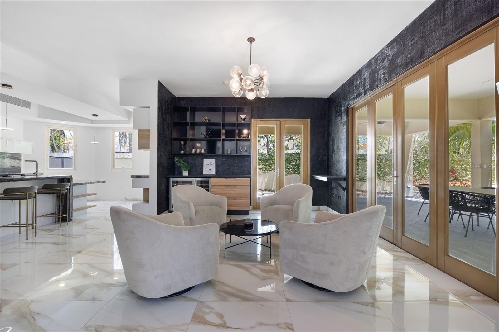 The outdoor area is truly a private oasis. Surrounded by lush tropical landscaping and mature palm trees, the backyard showcases a resort-style pool with an integrated spa, perfect for relaxing or entertaining. A covered terrace offers an ideal setting for al fresco dining, complete with ample space for gatherings while enjoying the serene surroundings.