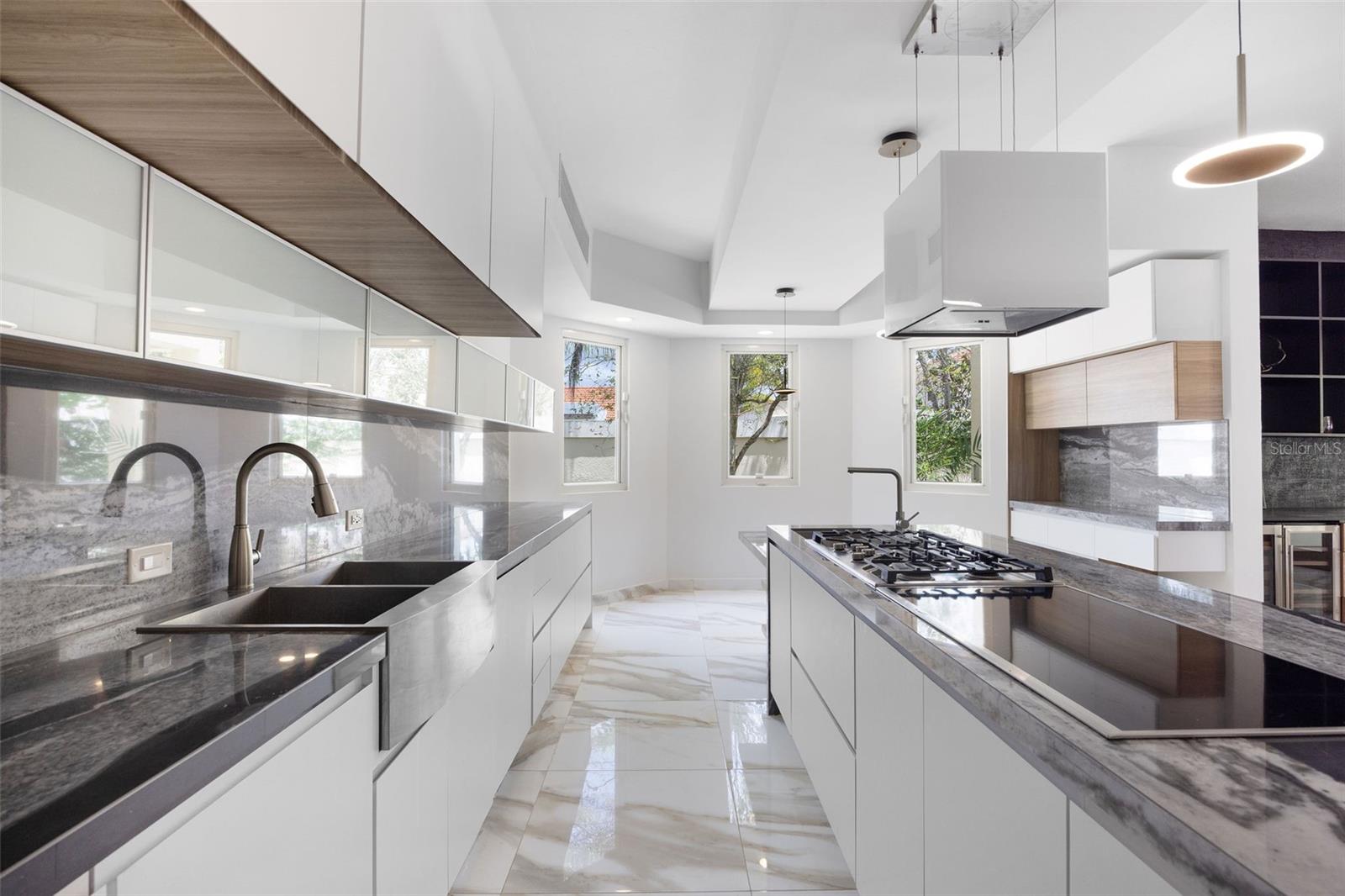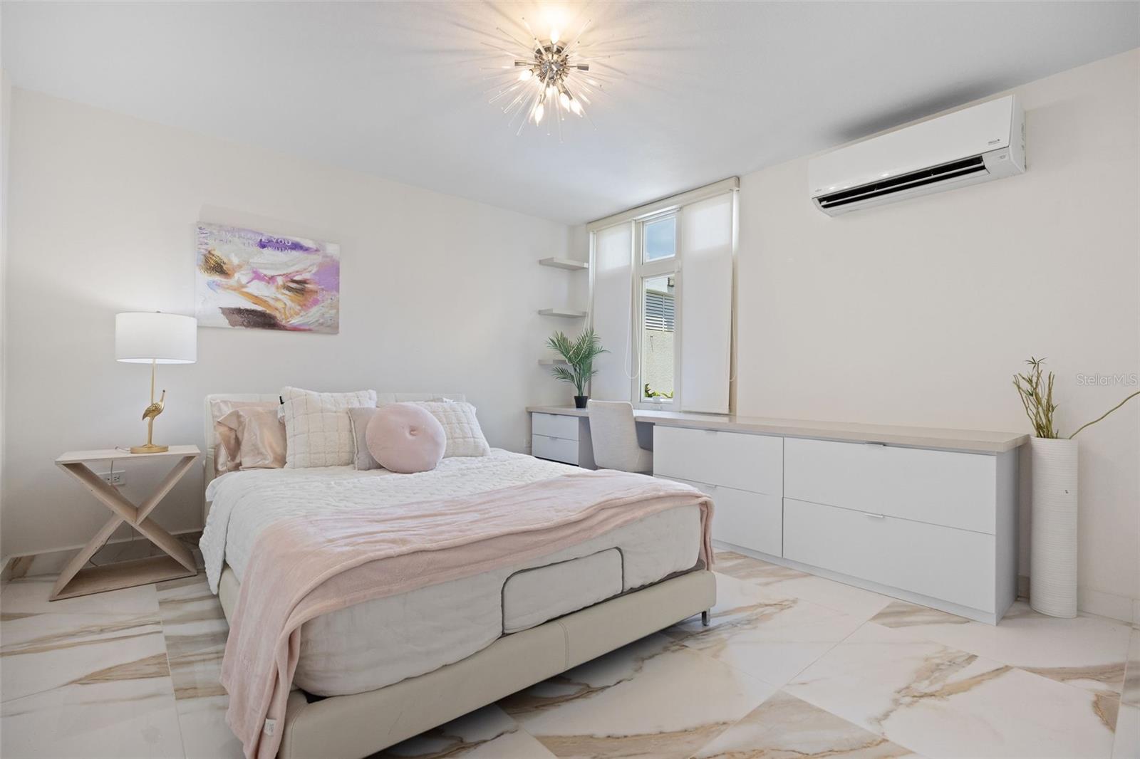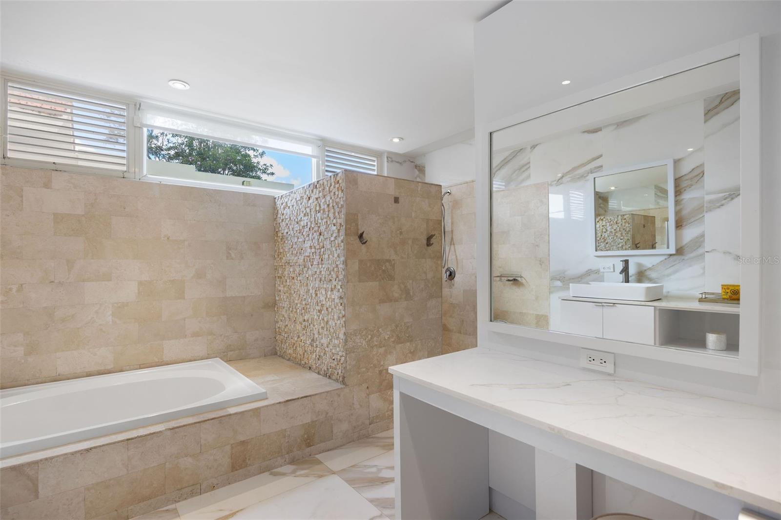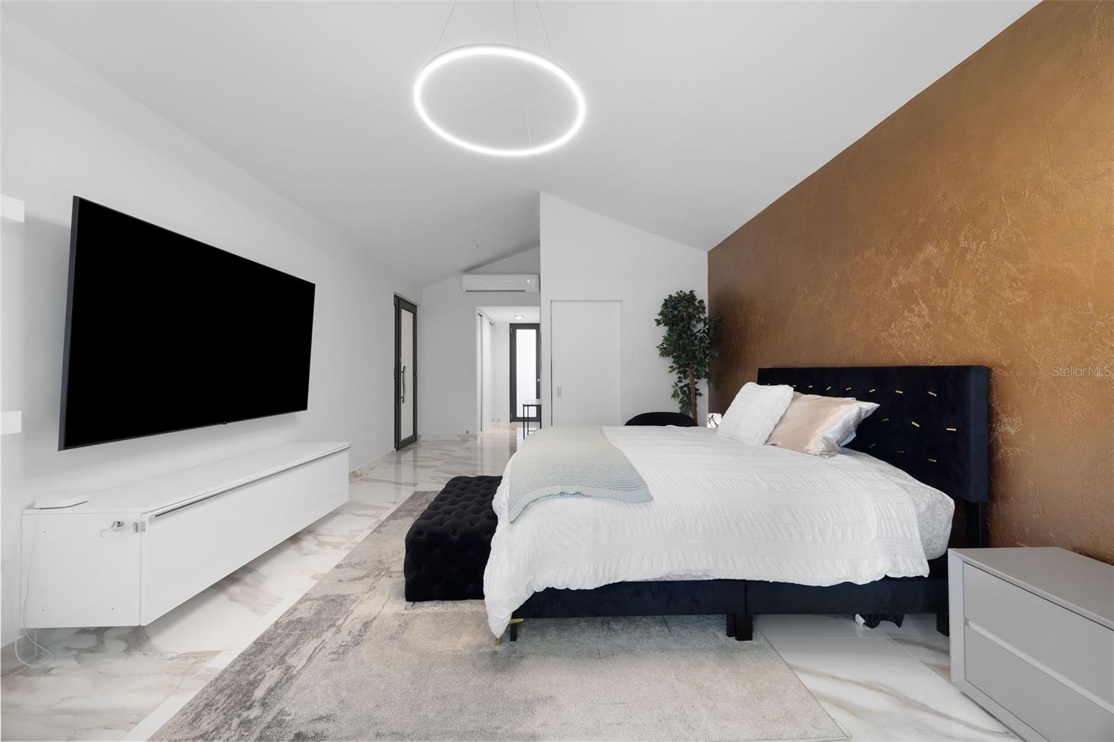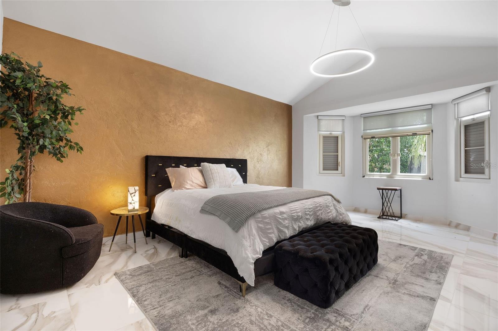 The outdoor area is truly a private oasis. Surrounded by lush tropical landscaping and mature palm trees, the backyard showcases a resort-style pool with an integrated spa, perfect for relaxing or entertaining. A covered terrace offers an ideal setting for al fresco dining, complete with ample space for gatherings while enjoying the serene surroundings.