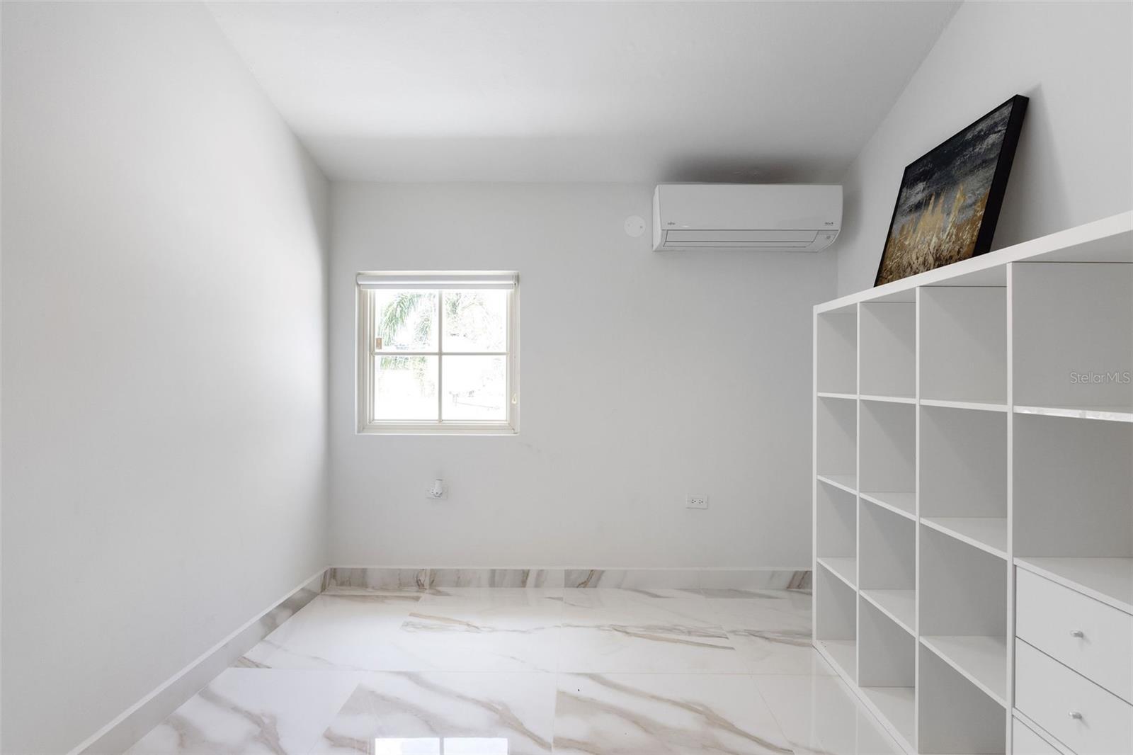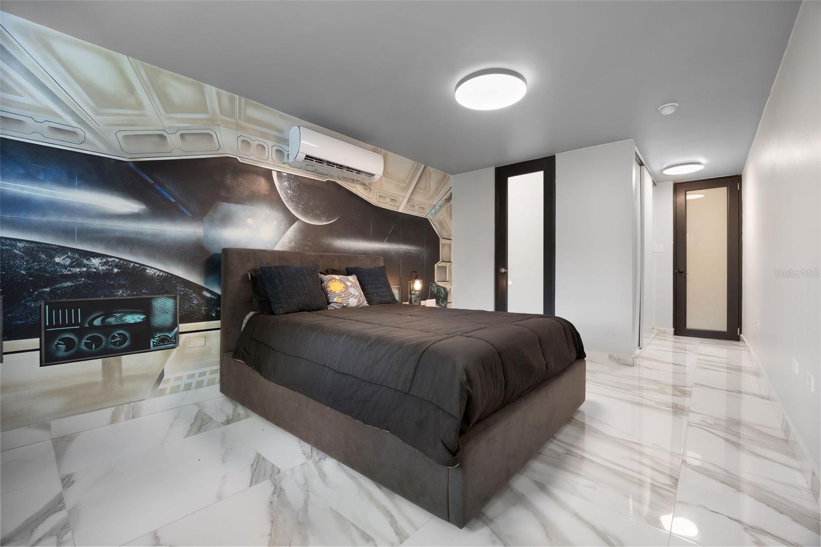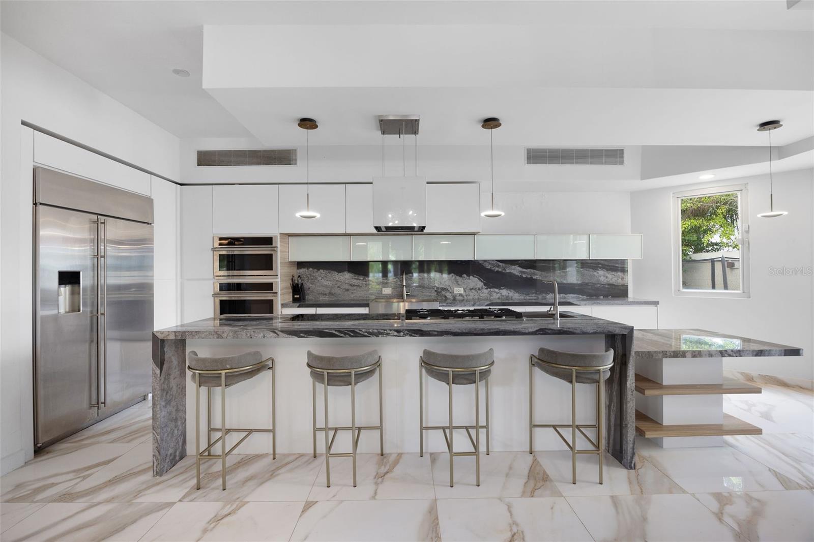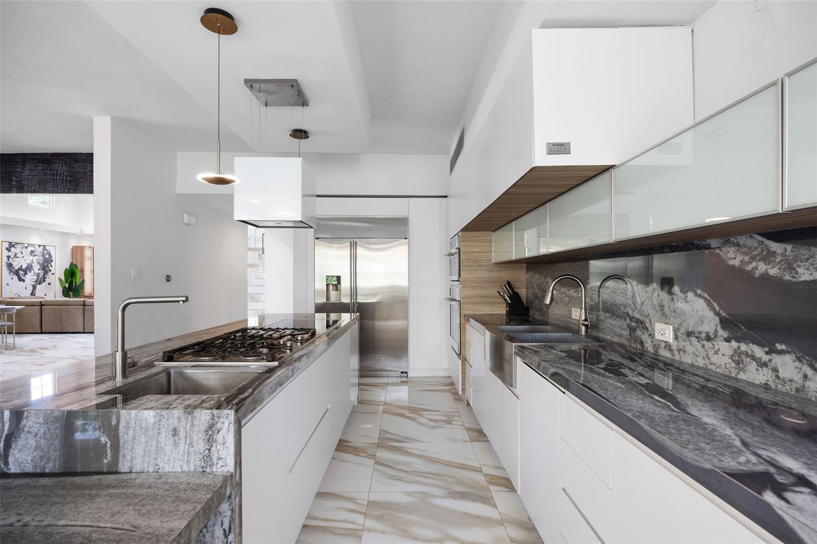 The outdoor area is truly a private oasis. Surrounded by lush tropical landscaping and mature palm trees, the backyard showcases a resort-style pool with an integrated spa, perfect for relaxing or entertaining. A covered terrace offers an ideal setting for al fresco dining, complete with ample space for gatherings while enjoying the serene surroundings.